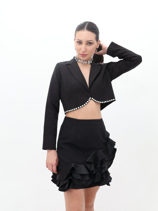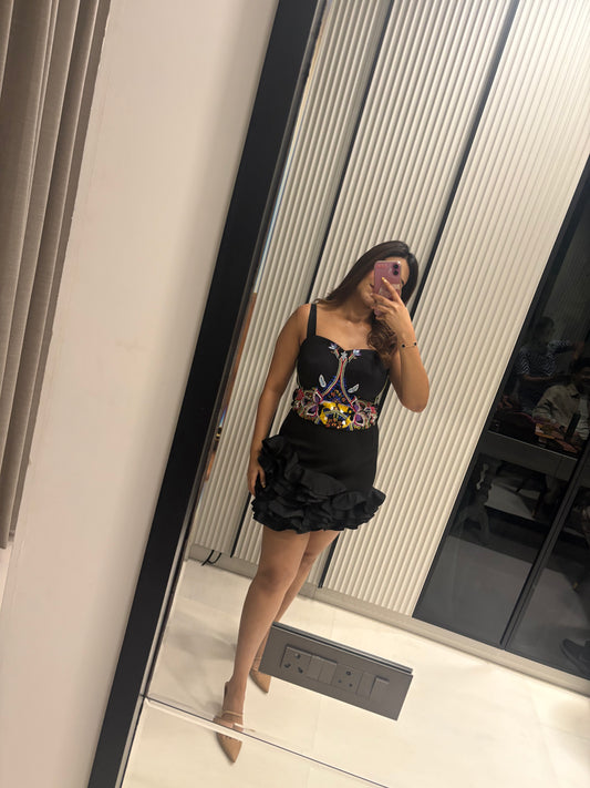Midnight Swirl Black Ruffle Hem Mini Skirt