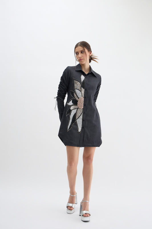 Midnight Bloom Embellished Denim Shirt Dress