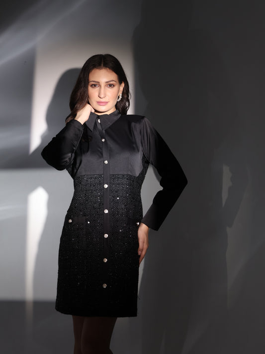 Black Dress with Gold Buttons and Hand Embroidery Detailing