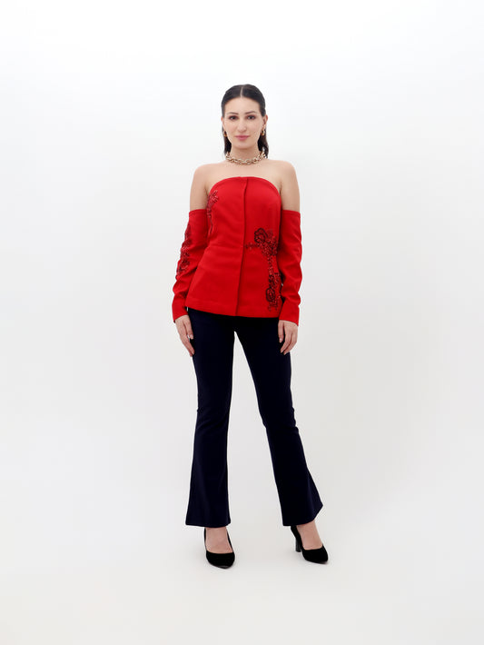 Red Full-Sleeve Off-Shoulder Top with Stonework Detailing
