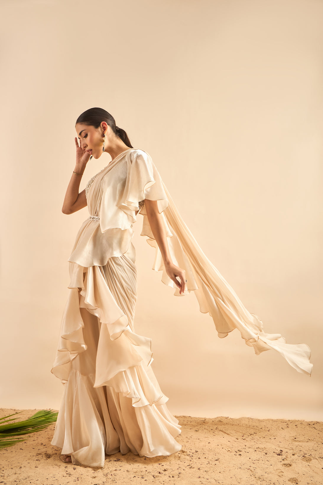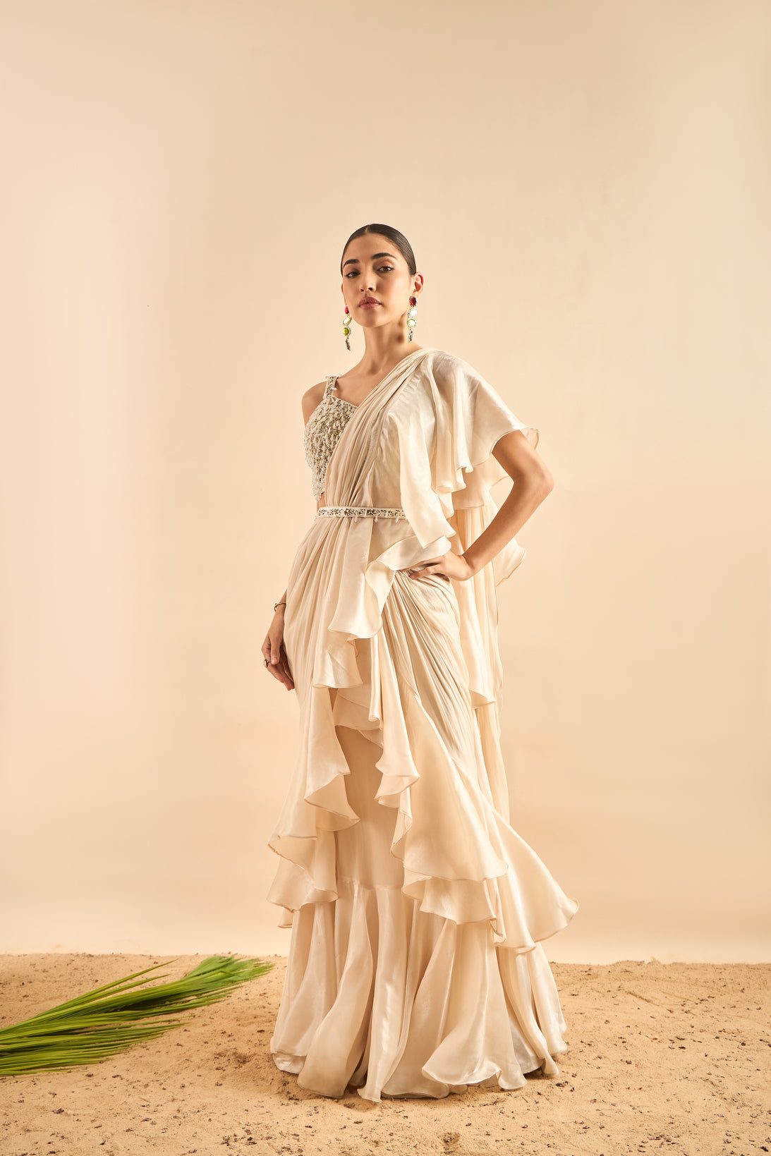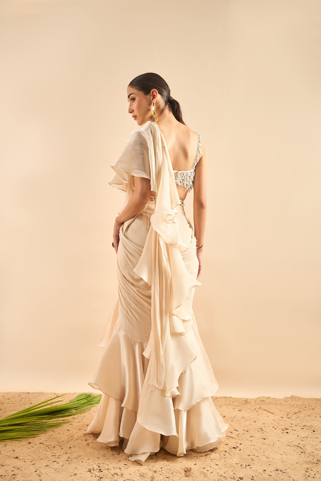 Glamorous Drape Saree with Embellished Blouse and Ruffled Pleats