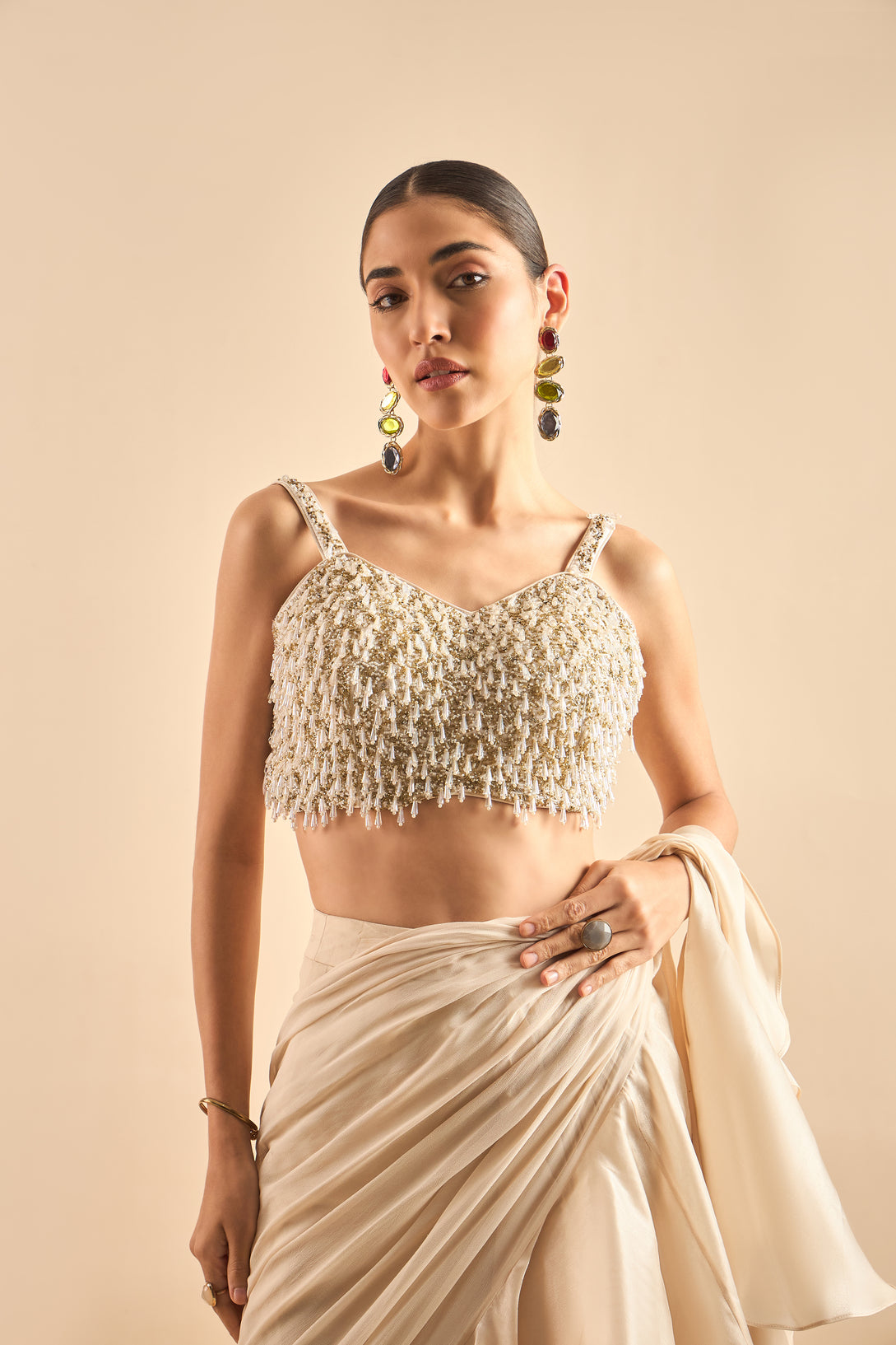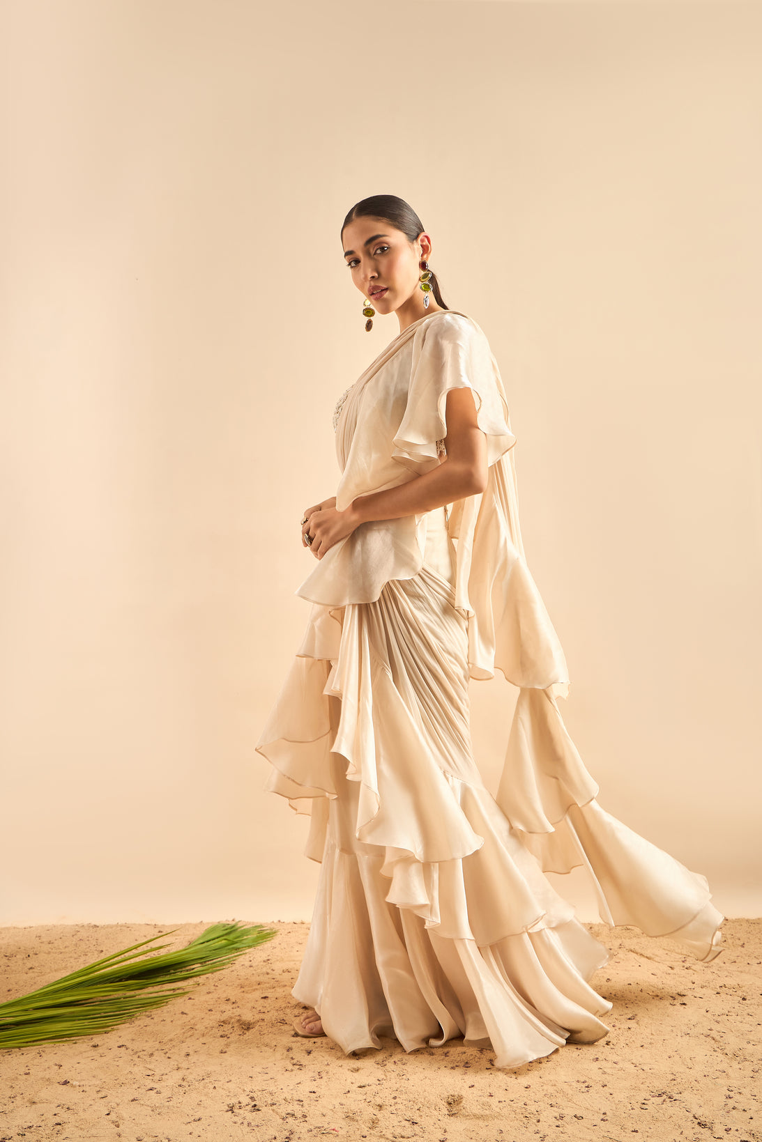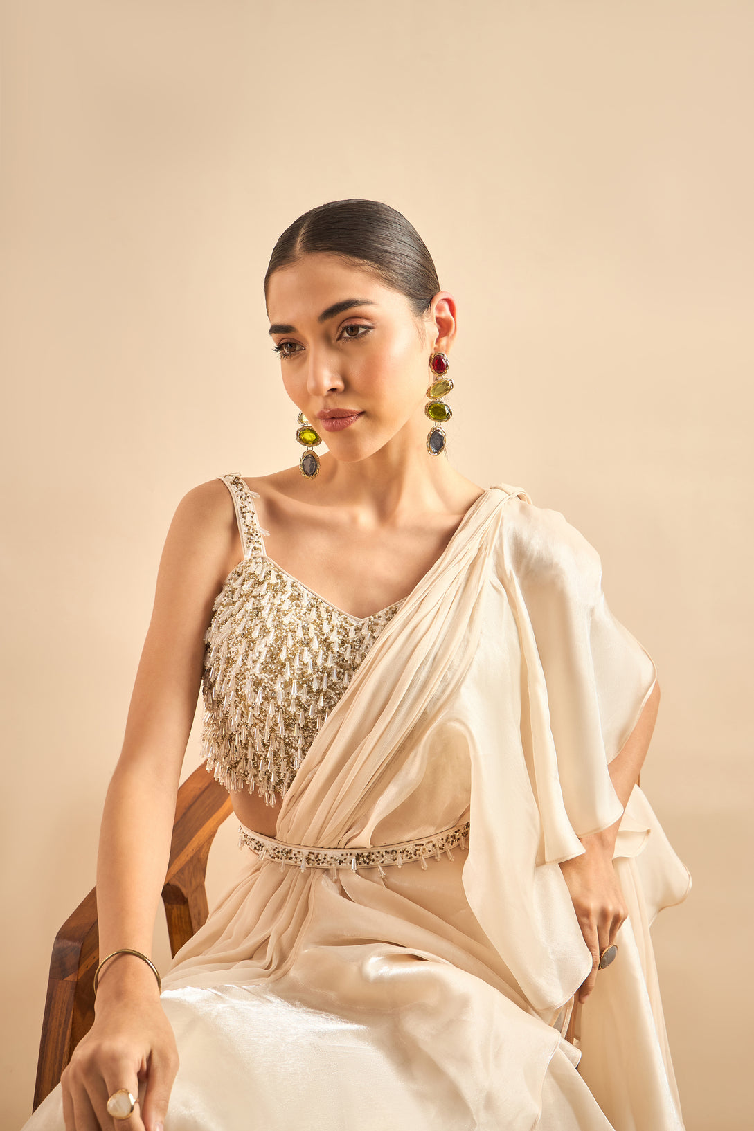 Glamorous Drape Saree with Embellished Blouse and Ruffled Pleats