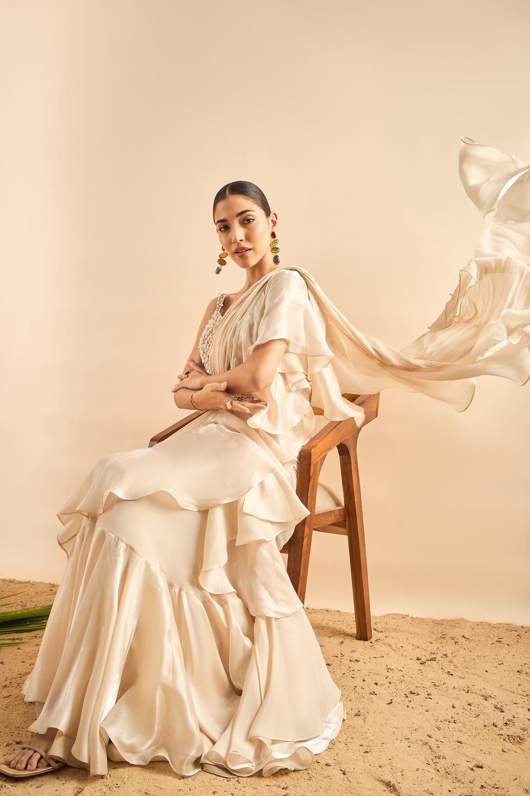 Glamorous Drape Saree with Embellished Blouse and Ruffled Pleats | Nazaqatt