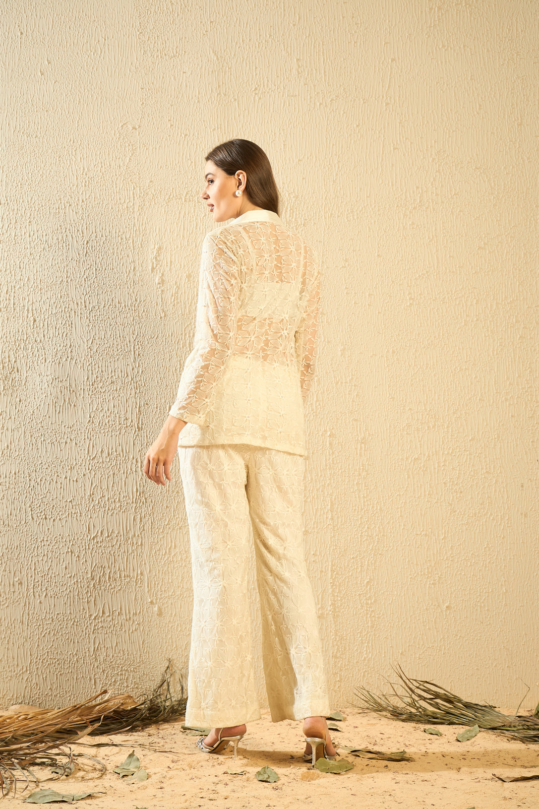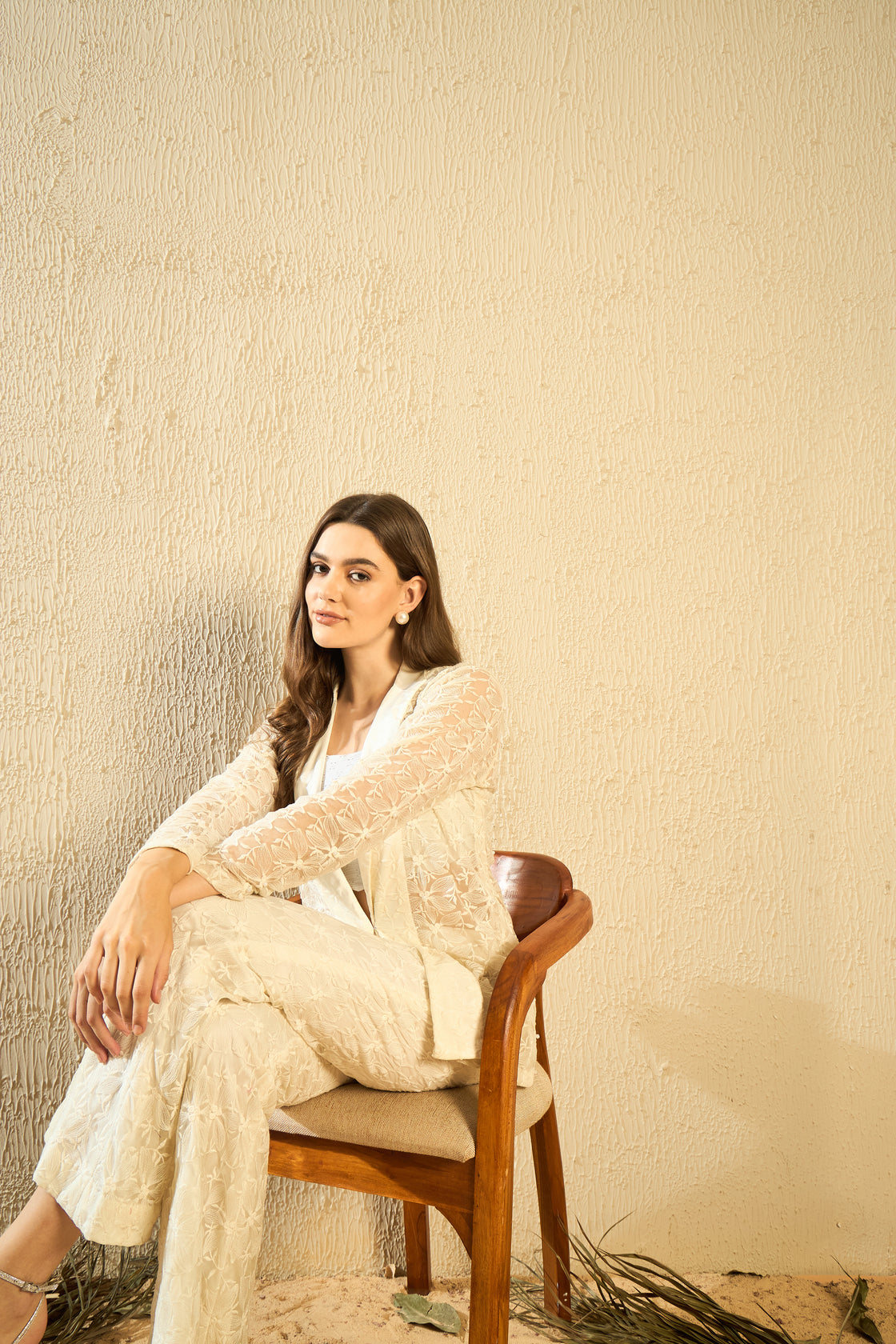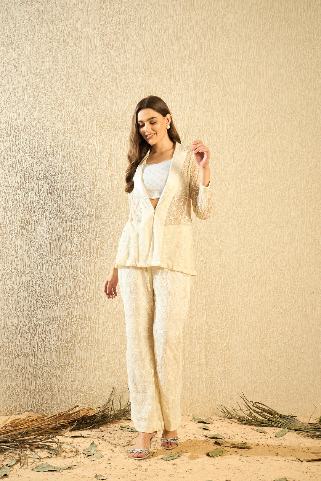 Sophisticated Cutwork Machine Embroidery Blazer and Pants Coord with Bustier | Nazaqatt
