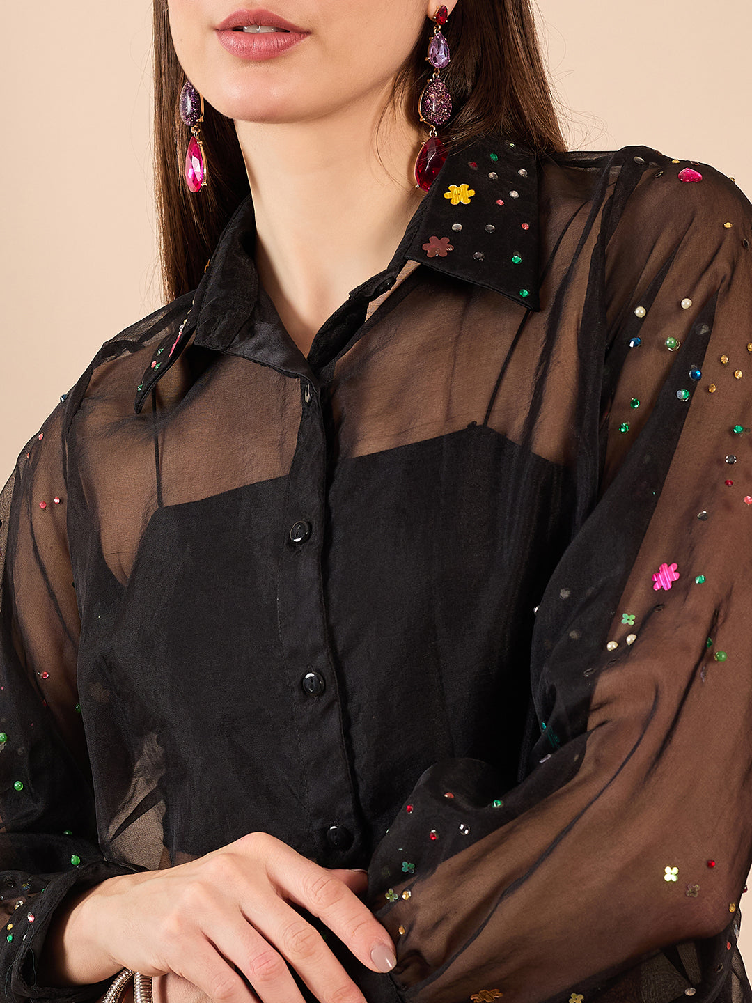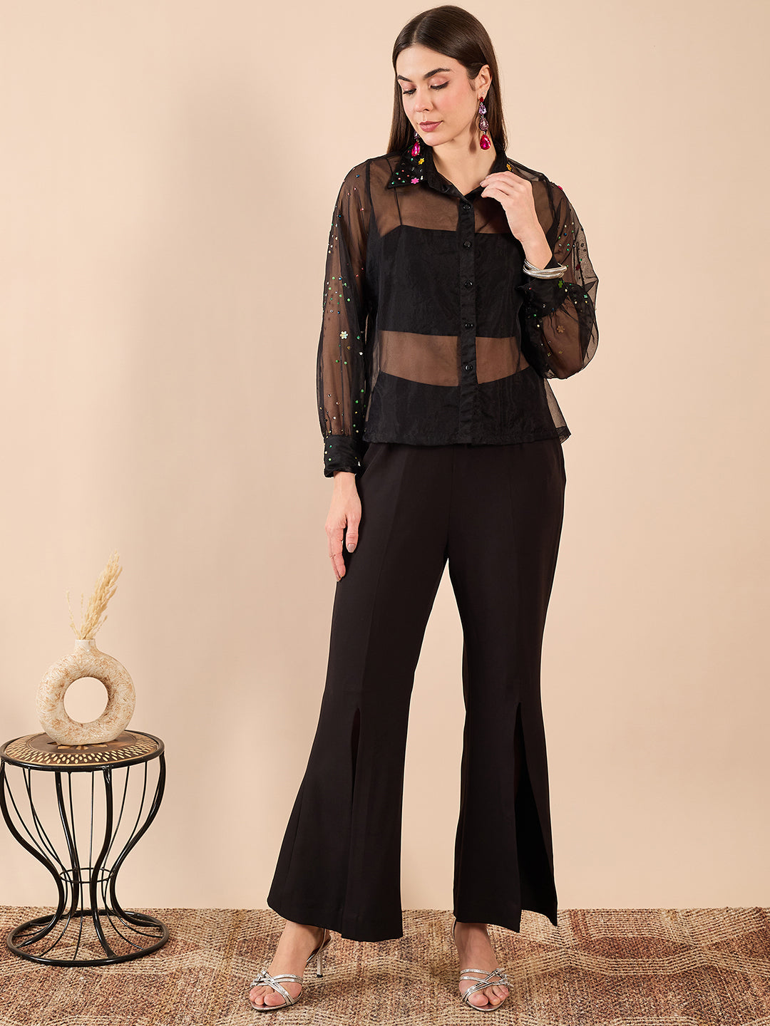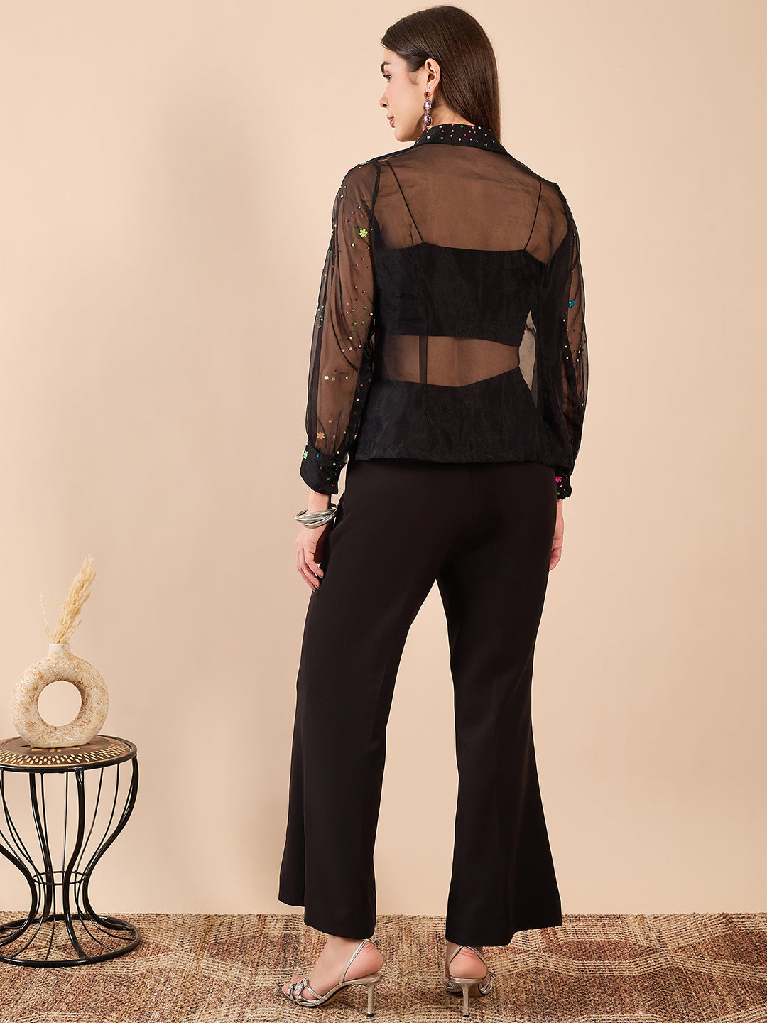 Embrace timeless elegance with Nazaqatt's Sheer Black Organza Top and Pants Coord Set, a sophisticated ensemble designed to captivate. The sheer black organza top features exquisite hand-embroidered details, adding a touch of artisanal luxury to this stunning piece. Paired with sleek, tailored pants, this coord set offers a perfect balance of allure and refinement. Ideal for evening events, upscale gatherings, or special occasions, this set showcases Nazaqatt's dedication to high-quality craftsmanship and contemporary style.