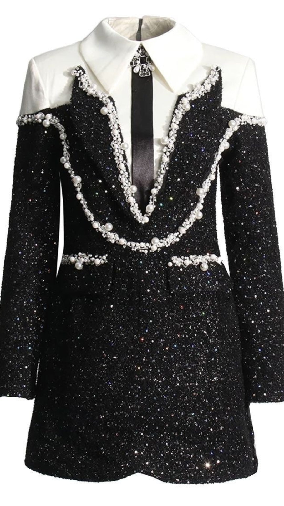Black and White Dress with Heavy Pearl and Crystal Detailing