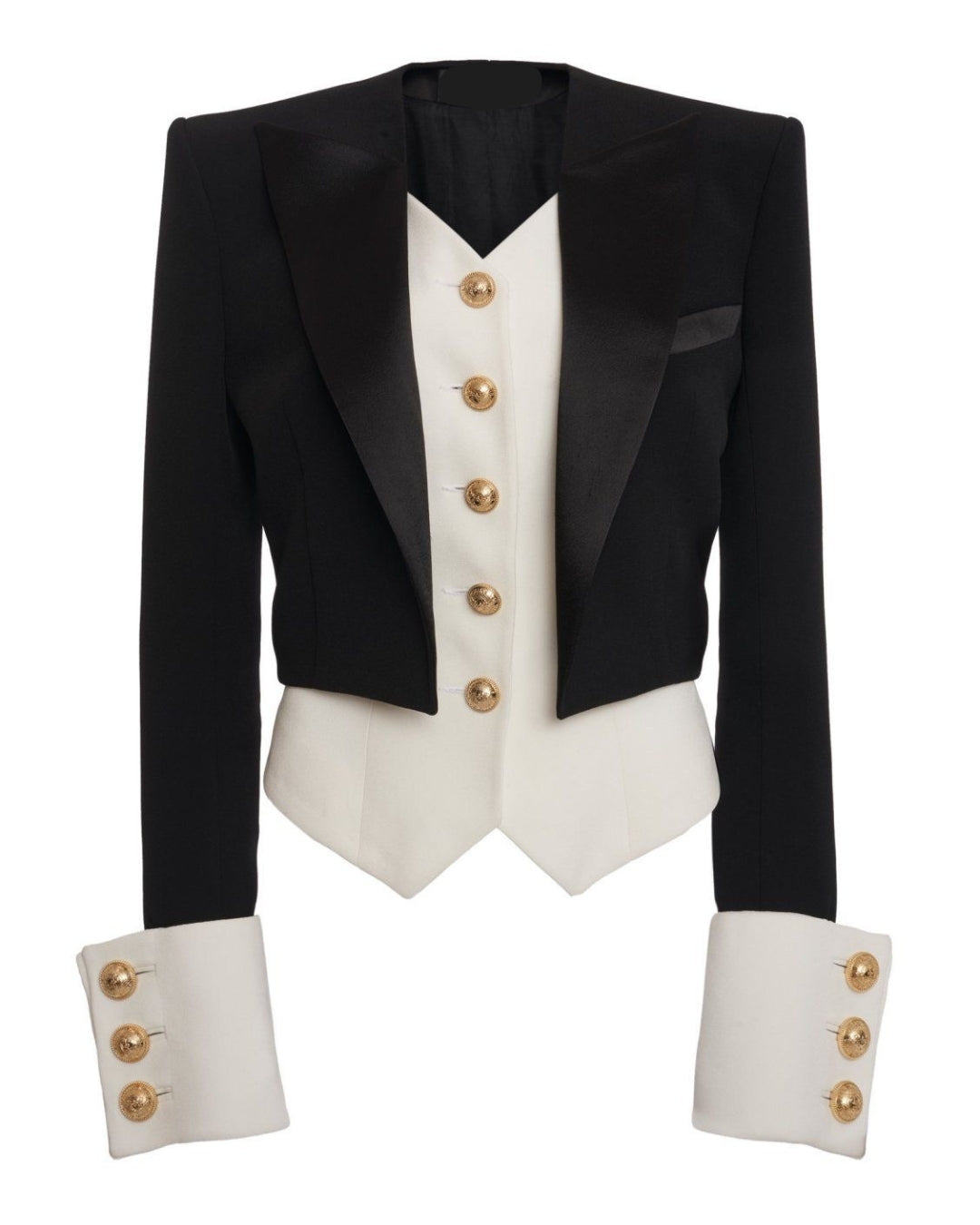This black blazer with a white corset and gold button accents is a perfect blend of bold elegance and contemporary style, making it an iconic addition to any wardrobe.