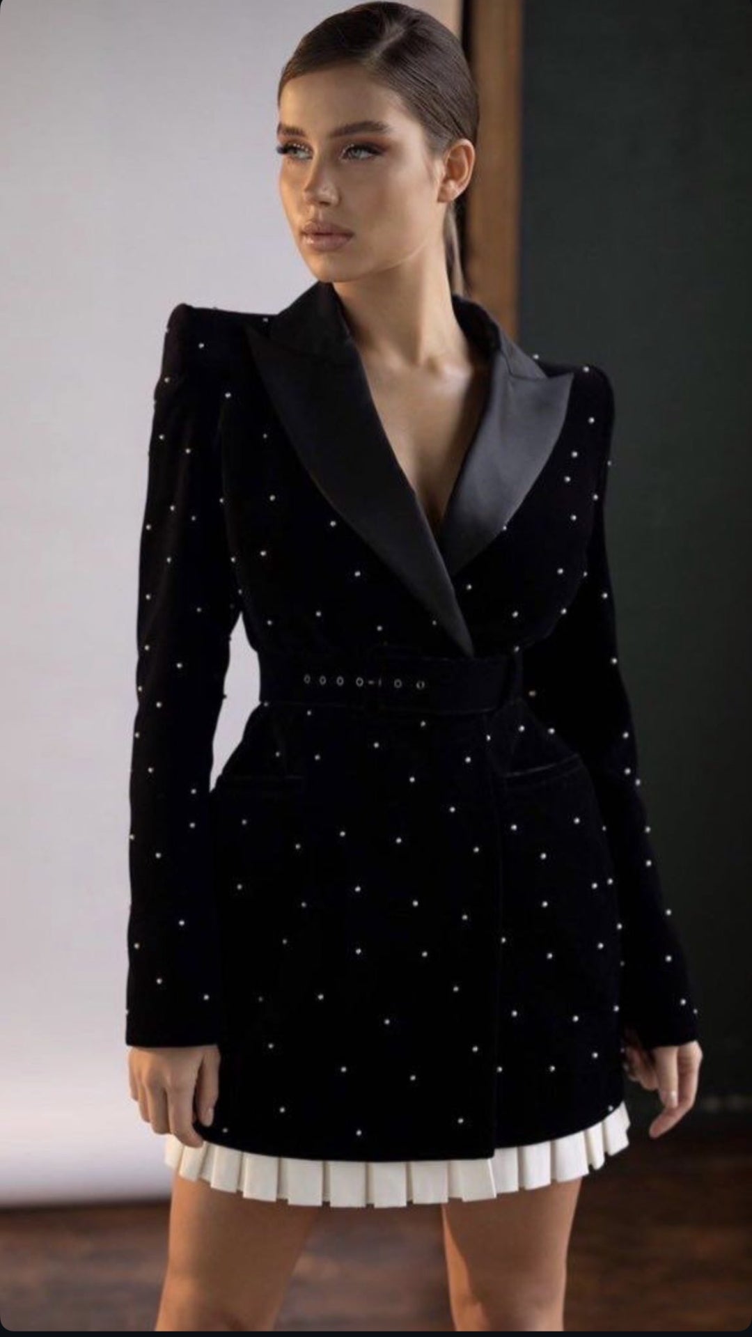 This black coat dress with pearls is the epitome of modern elegance, perfect for the woman who appreciates timeless fashion with a touch of luxury.