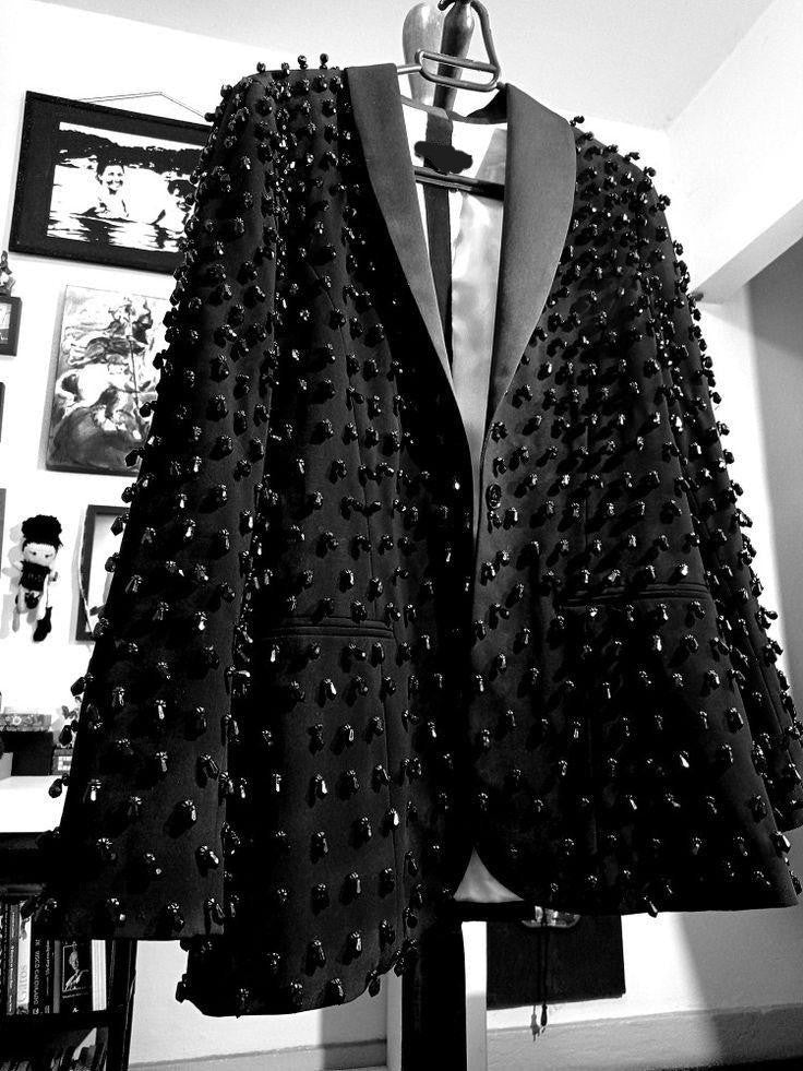 This heavy black stonework coat is the perfect piece for those looking for a sophisticated, bold, and luxurious outerwear option that combines modern glamour with classic style.
