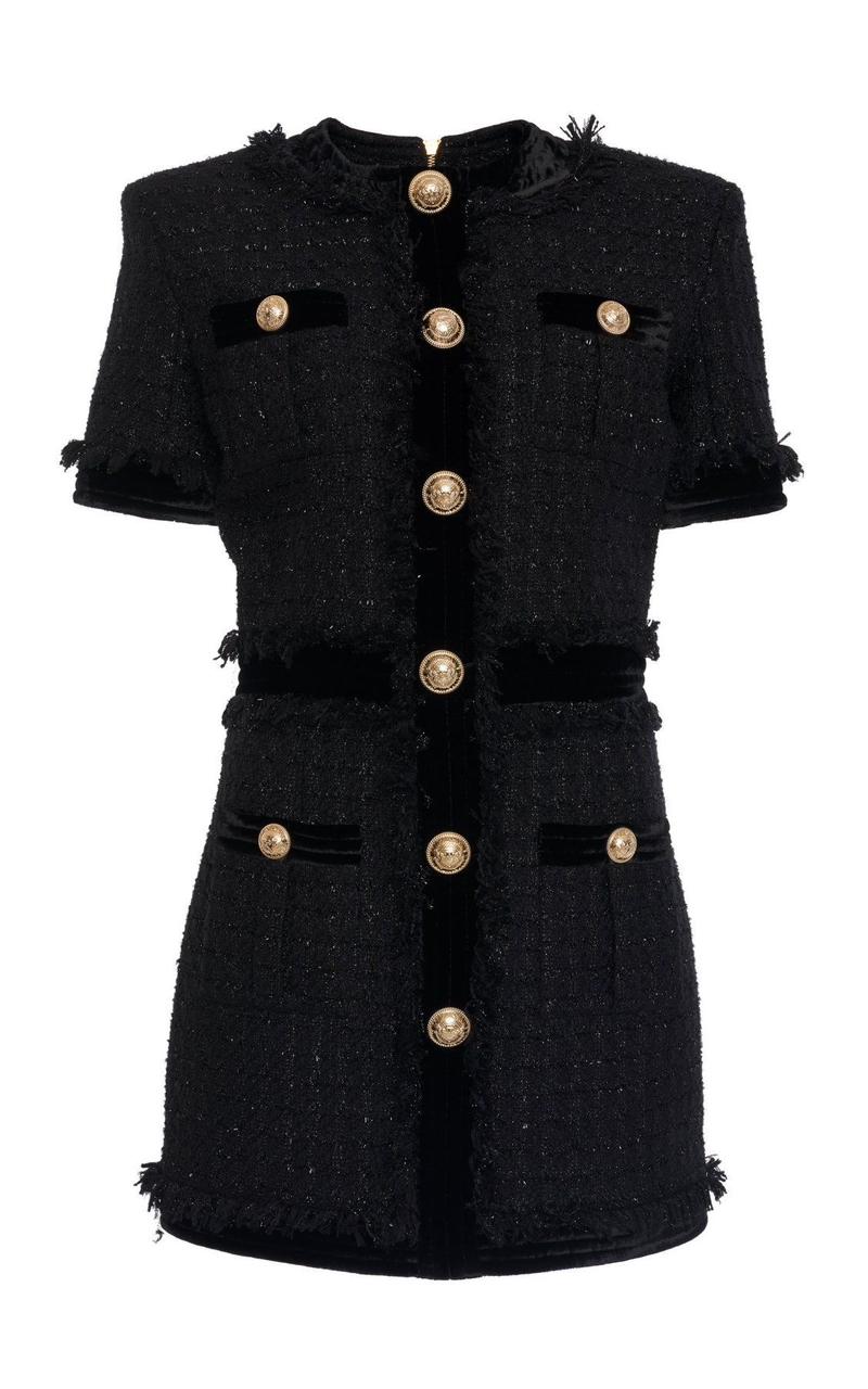 - Gold Buttons: Bold, metallic accents that add a touch of luxury and sophistication to the dress.