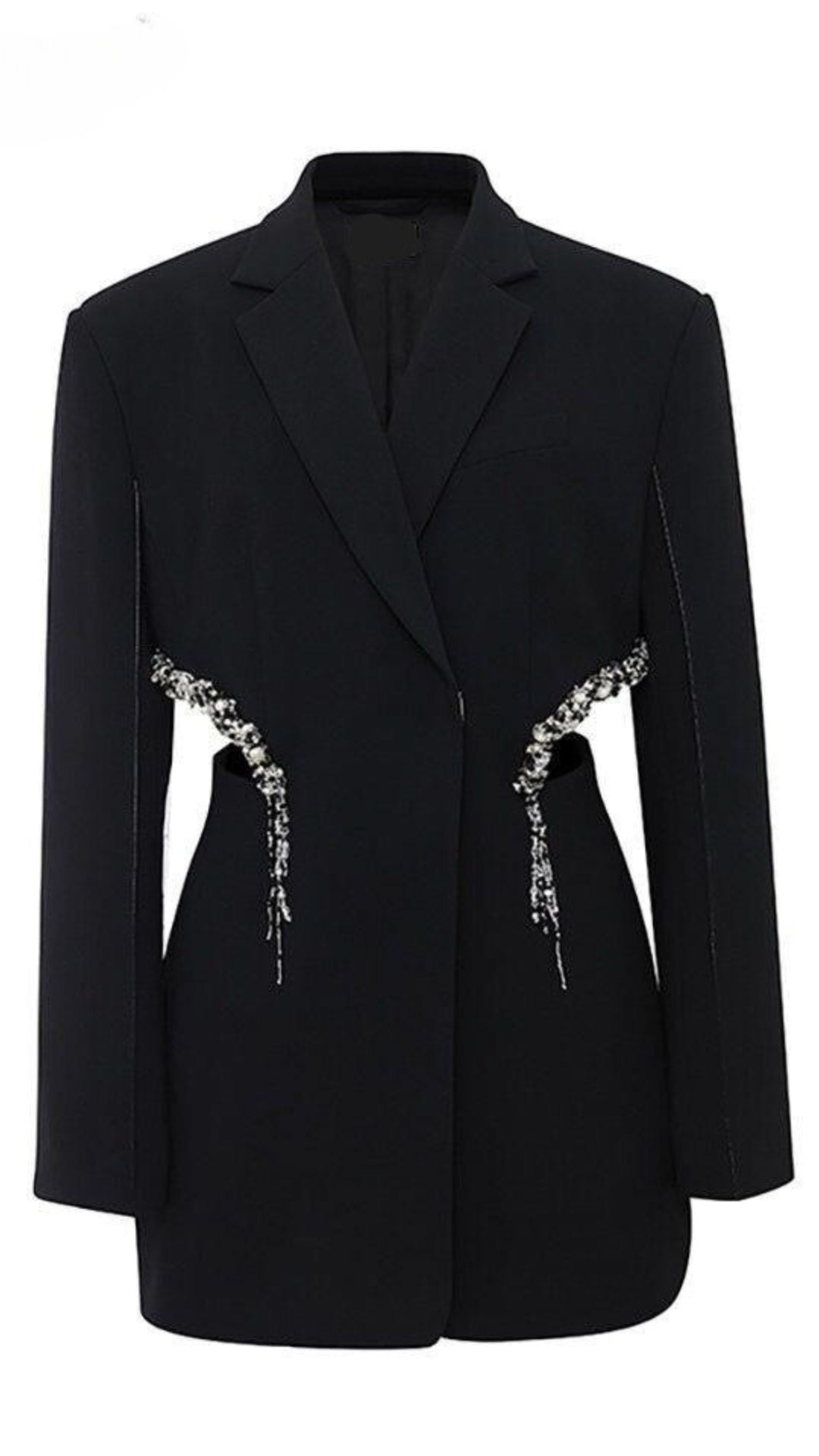 This black dress with stonework on the sides is the perfect combination of elegance, glamour, and modern sophistication, making it a must-have addition to your wardrobe.