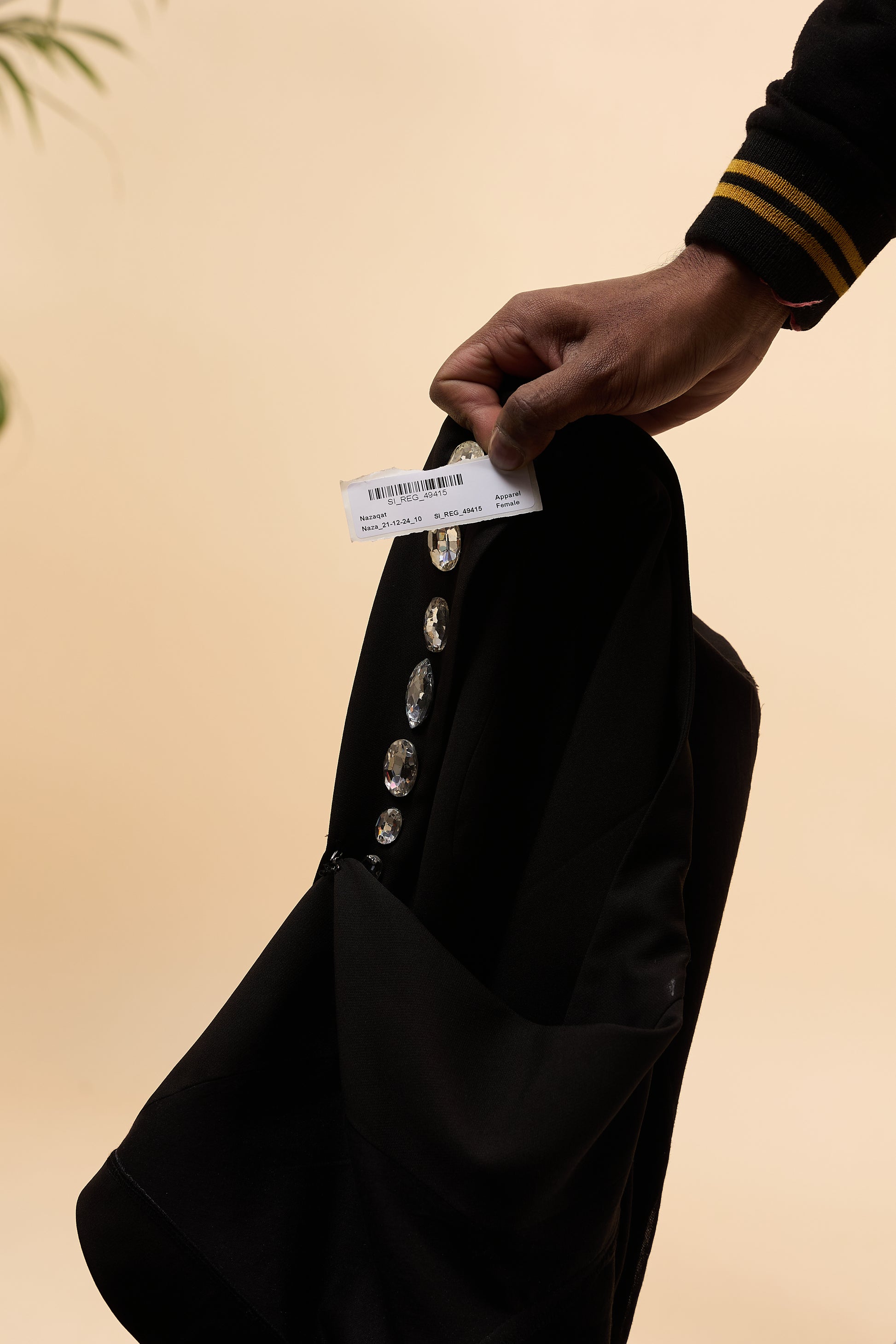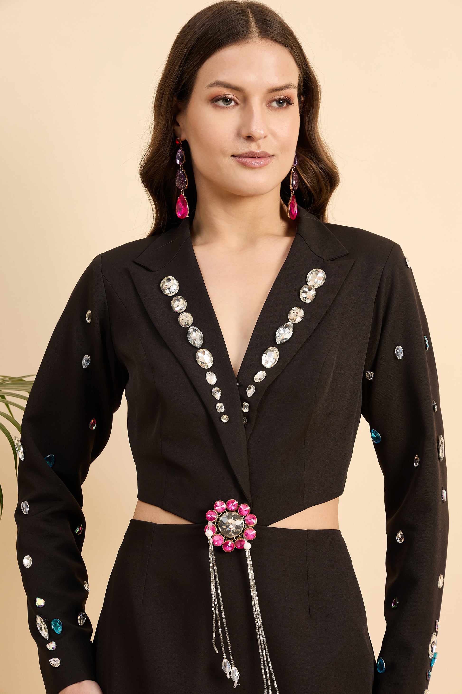 Nazaqatt’s Black Cutout Elegance Dress is the ultimate statement of sophistication and bold glamour. This full-sleeve black dress features strategically placed cutouts, adding a modern edge to its timeless silhouette. The stonework detailing on the collars and sleeves enhances its luxurious appeal, offering a touch of opulence that catches the light beautifully. Designed for those who love to command attention with refined elegance, this dress is perfect for evening soirées, formal gatherings, and upscale events.