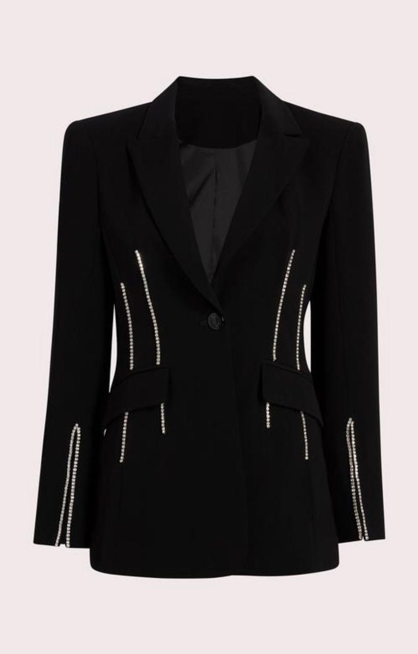 This black full-sleeve coat with stonework offers a perfect blend of sophistication and glamour, making it a timeless and luxurious addition to your wardrobe.