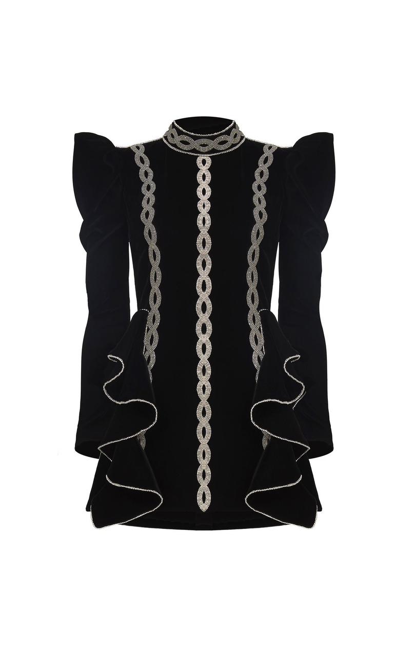 Black Full-Sleeve Dress with Ruffles and Heavy Stonework Lines