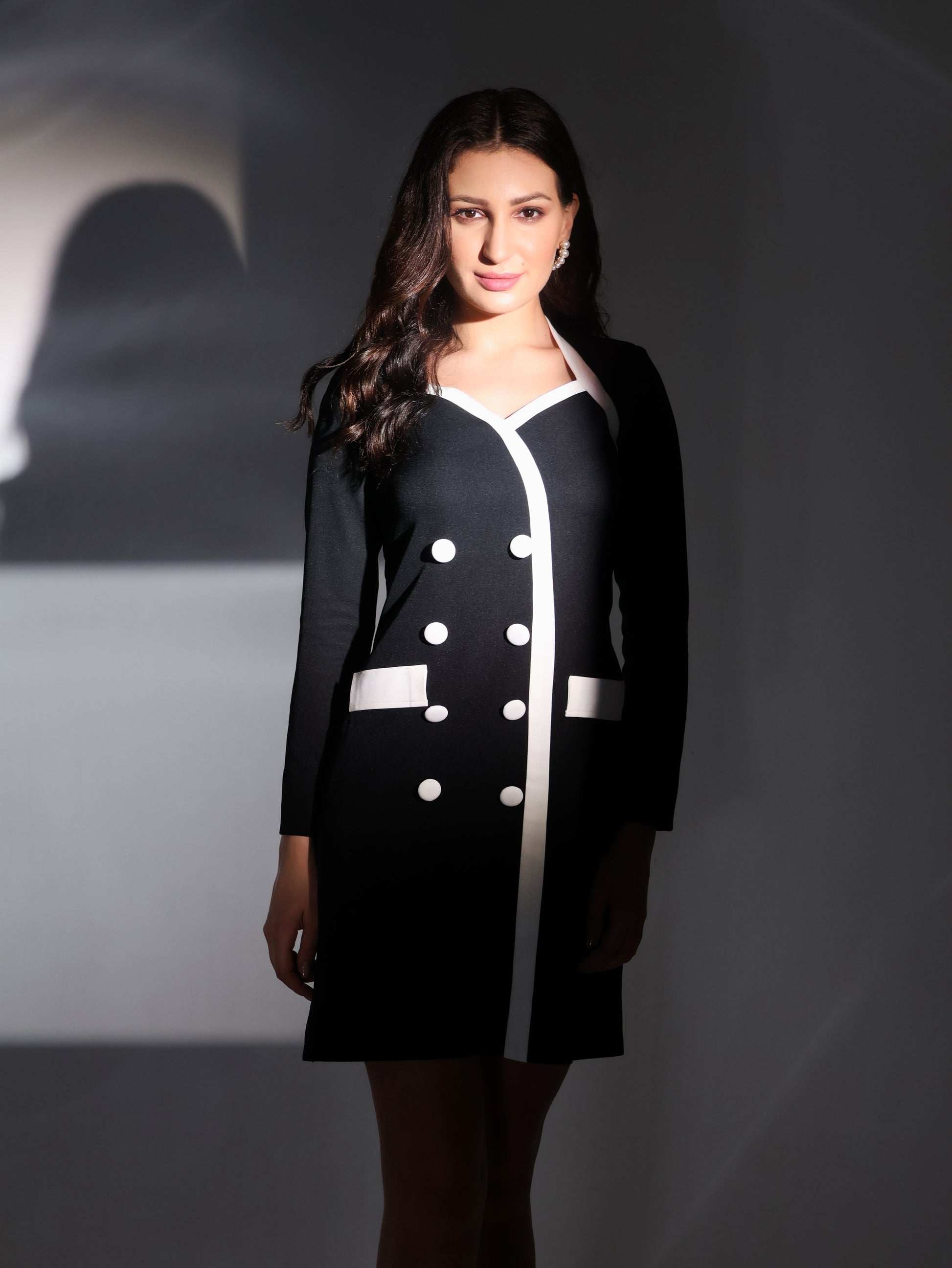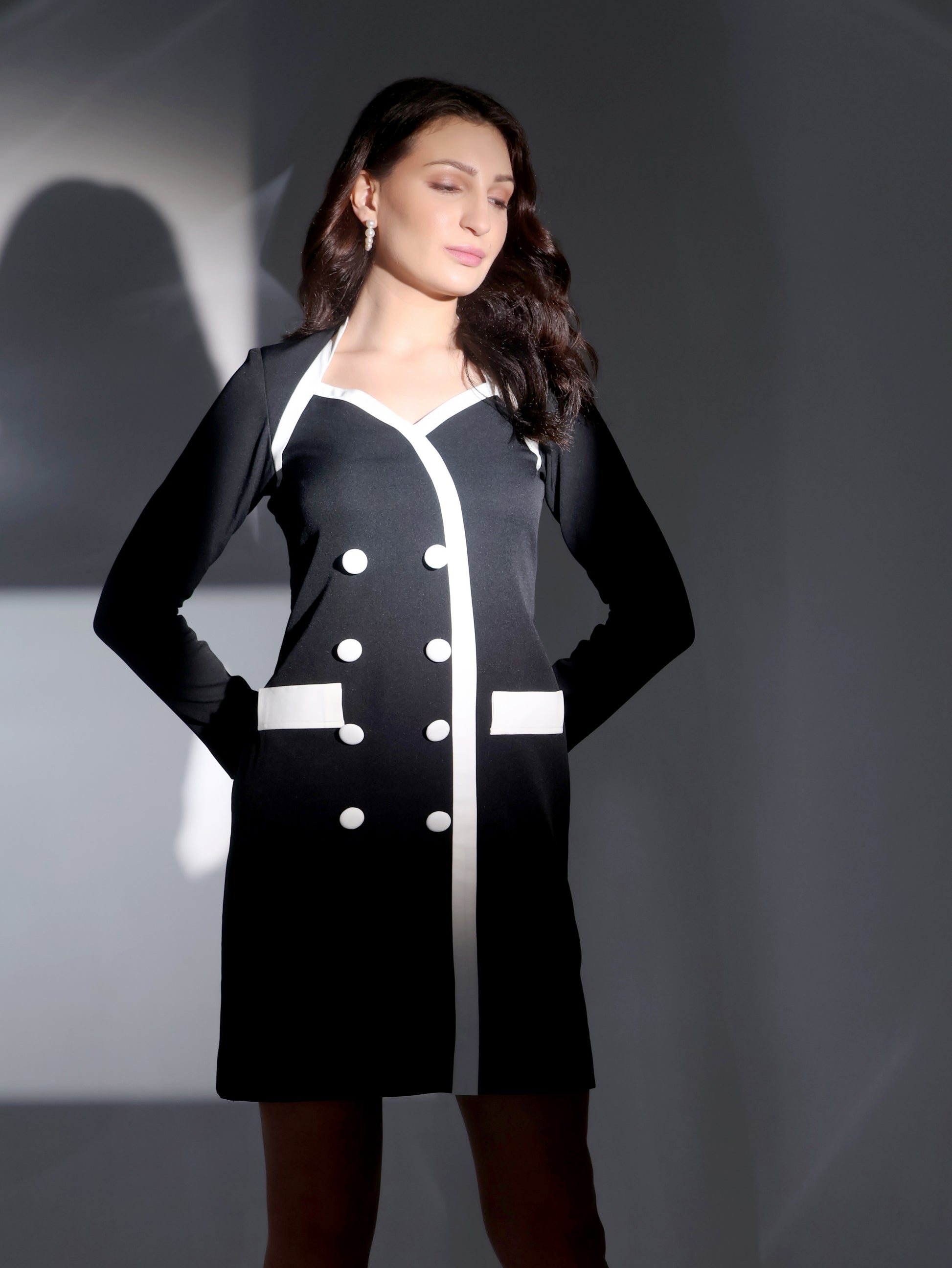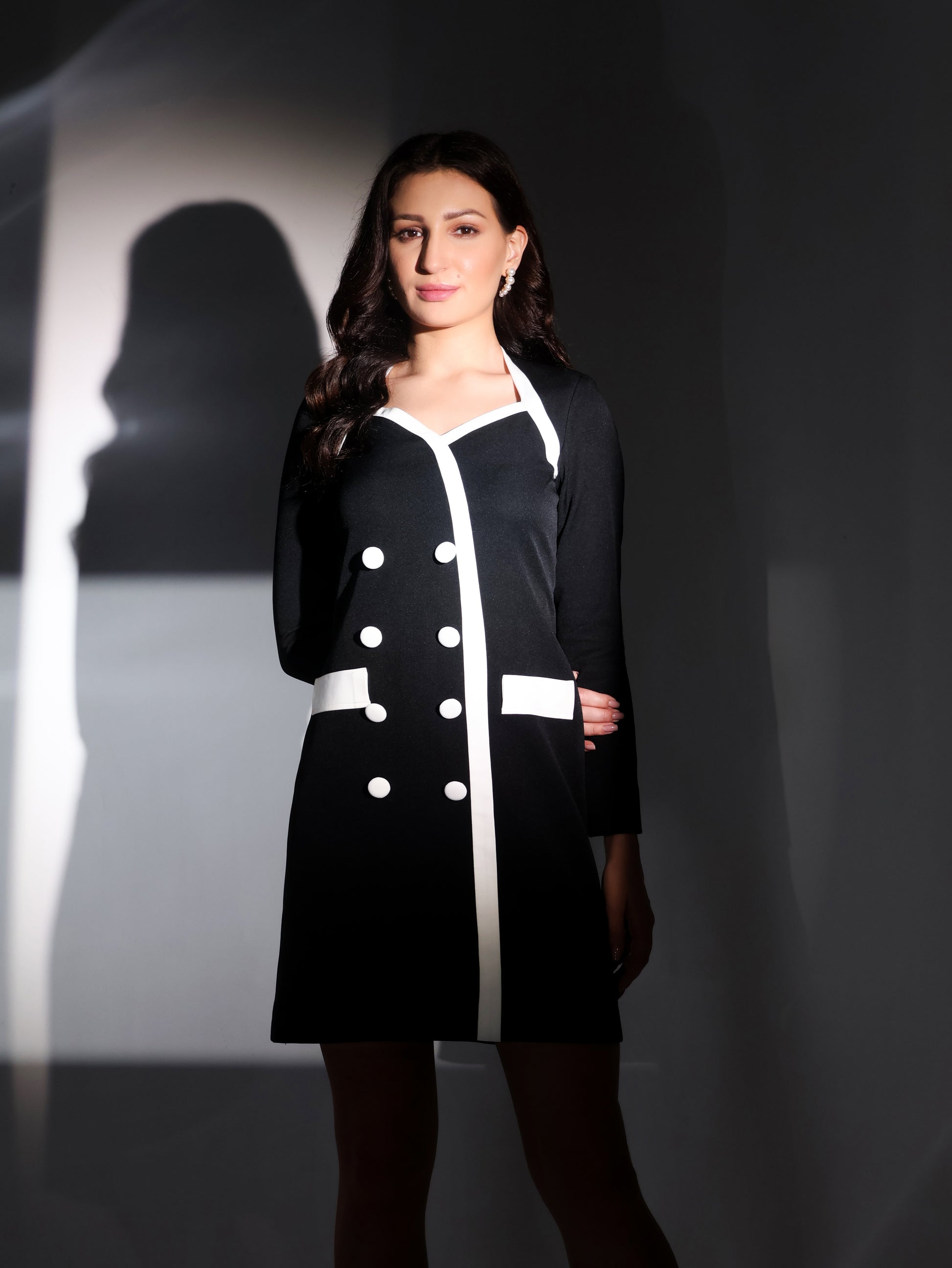 Embrace modern elegance with Nazaqatt's Black Full-Sleeve Dress with White Buttons and White Pockets, a chic and versatile piece that combines classic design with contemporary detailing. This dress features a sleek, tailored silhouette in timeless black, accented with white buttons and matching white pockets that provide a striking contrast. The full sleeves add sophistication, making this dress perfect for both formal and casual occasions.