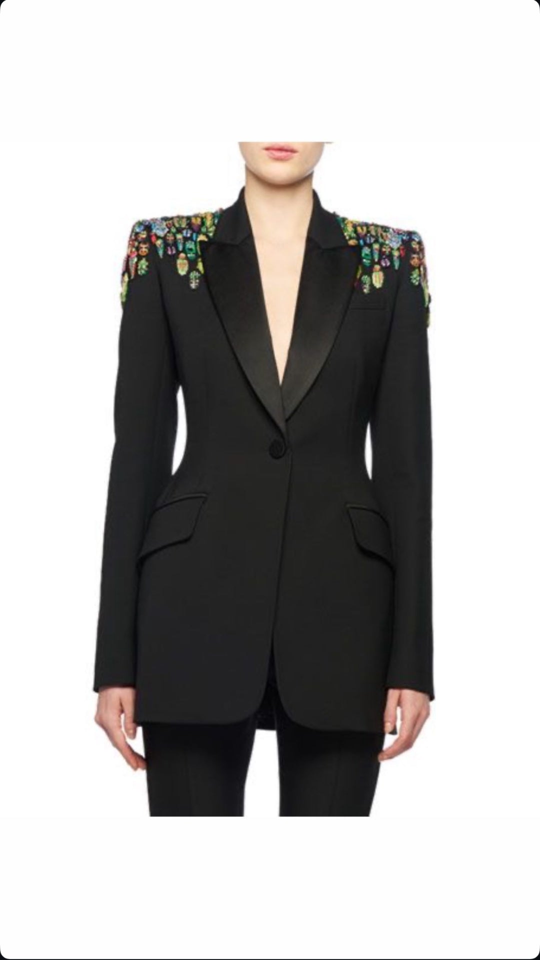 - Stonework Detailing: Intricate stone embellishments on the top of the blazer, adding a touch of glamour and modern luxury.