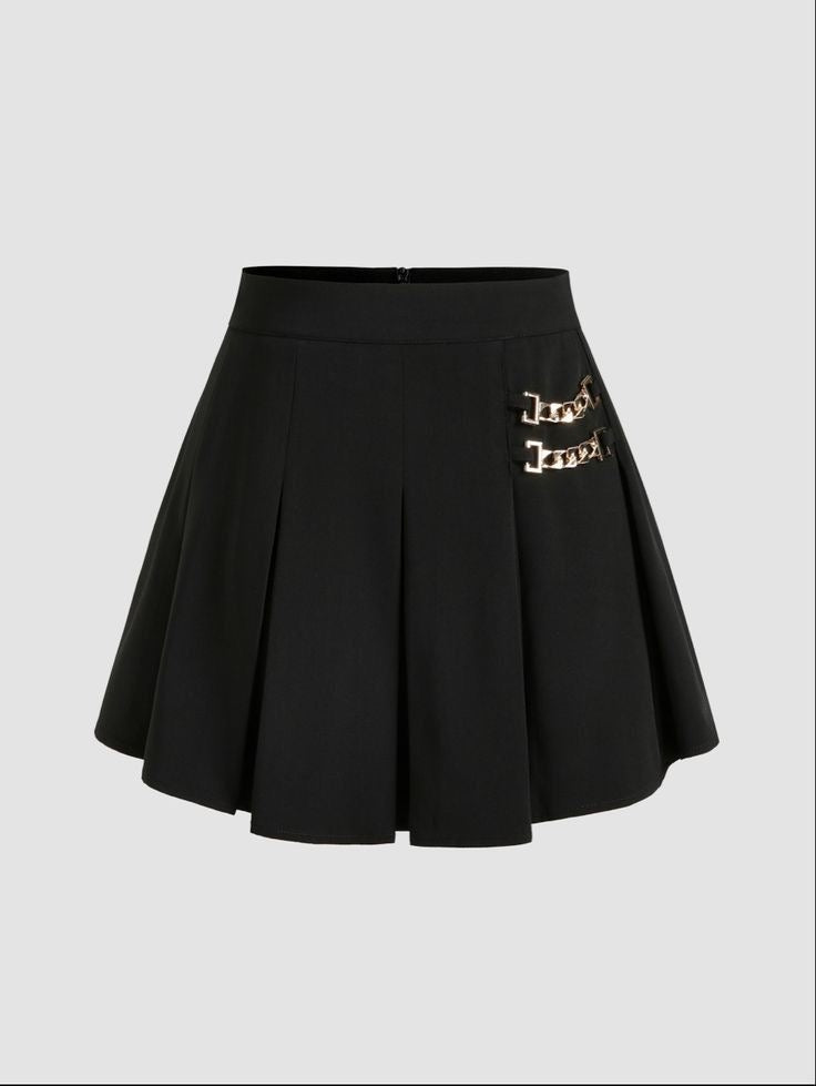 This black short skirt with gold buckle details is a stylish and versatile piece that adds a bold yet elegant touch to any outfit.