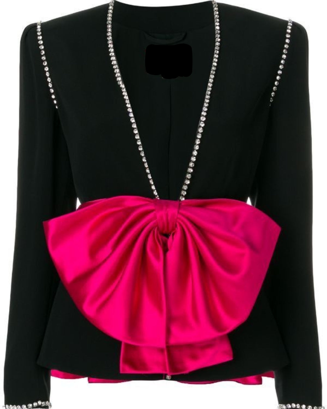 Make a bold and stylish statement with Nazaqatt's Black Top with Pink Ribbon and Stonework Accents, a unique design that merges elegance with a playful twist. This striking black top features a large pink ribbon as the focal point, complemented by shimmering stonework lining the collar, wrists, and neckline. Perfect for chic gatherings, parties, or a standout everyday look, this top is a testament to modern glamour and individuality.