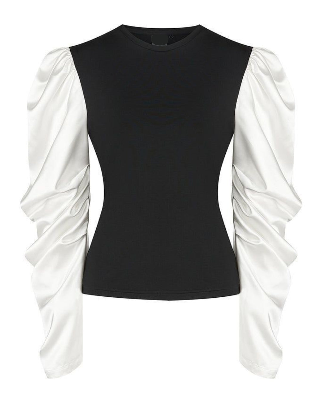 This black top with white ruffled full sleeves is the perfect blend of classic sophistication and modern style, making it an essential addition to your wardrobe.