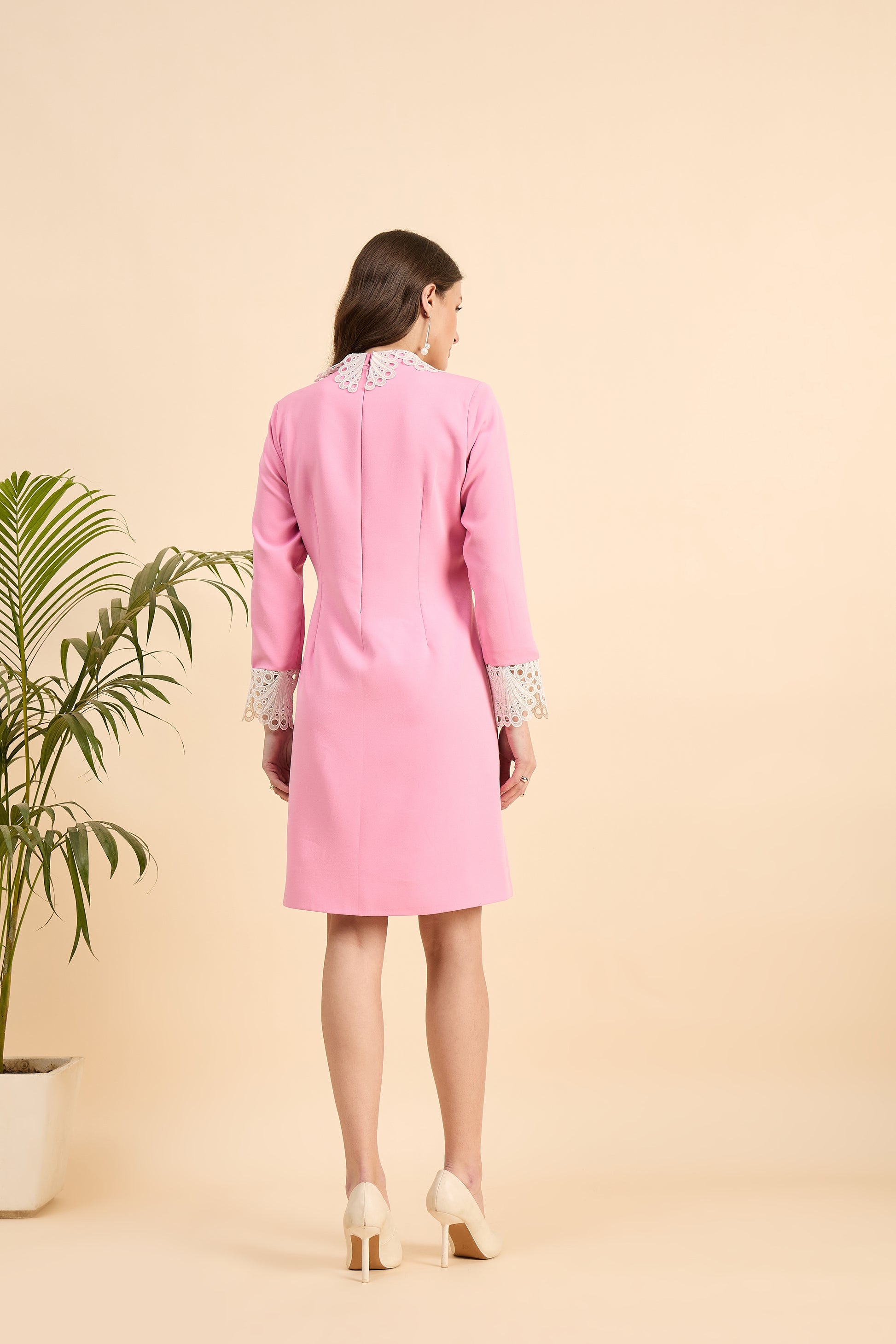 Nazaqatt’s Blush Lace Collar Dress is a refined fusion of vintage charm and modern sophistication. Crafted in a soft pink fabric, this dress features an A-line silhouette that flatters every body type while maintaining an effortlessly elegant appeal. The highlight of this piece is its intricate white lace collar and matching lace cuffs, adding a delicate yet striking contrast to the structured design. Whether you're attending a formal luncheon, a high-tea event, or an elegant soirée, this dress is the perfect embodiment of grace and timeless style.