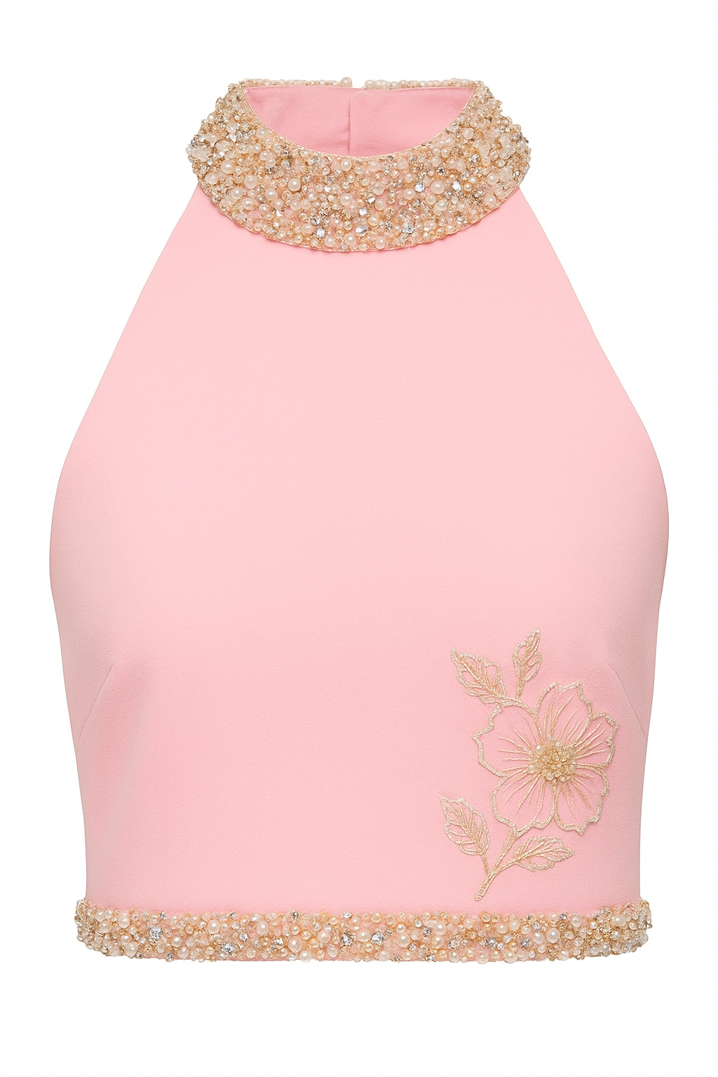 Make a bold fashion statement with Nazaqatt's Blush Pink Halter Top with Pearl Embellished Collar, a delicate yet striking design that captures refined femininity and festive sparkle. This elegant cropped top features a high halter neckline richly adorned with pearls, crystals, and beads, balanced by a soft pink body and a single floral motif embroidered in gold. The pearl-studded hem completes the look, making it ideal for celebrations, cocktail events, or elegant evening affairs.