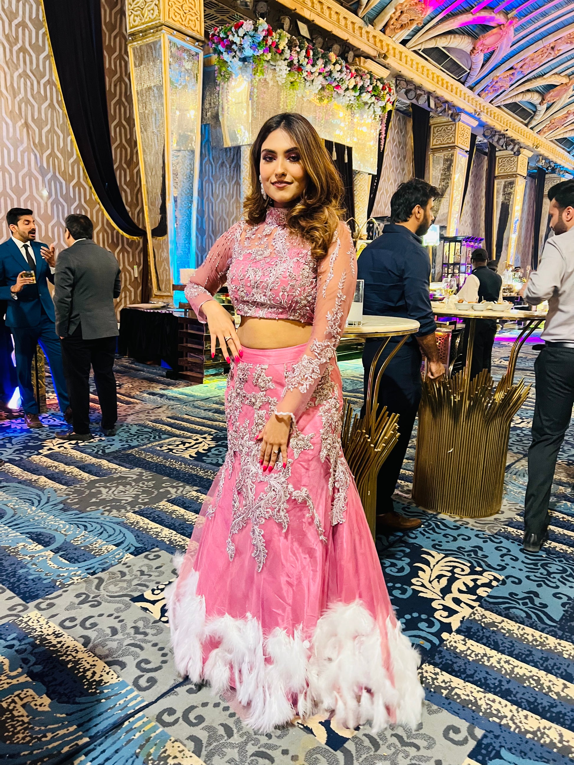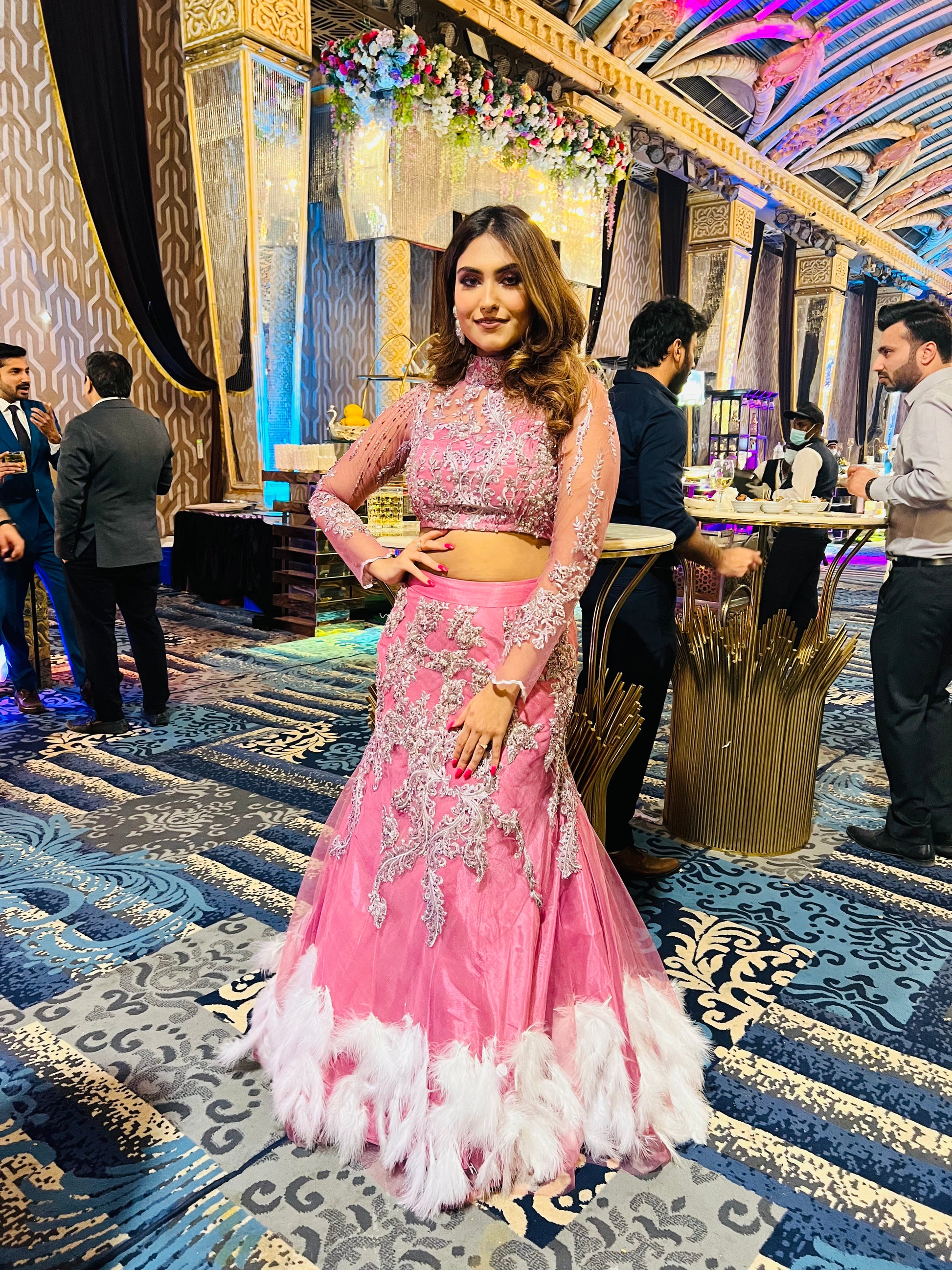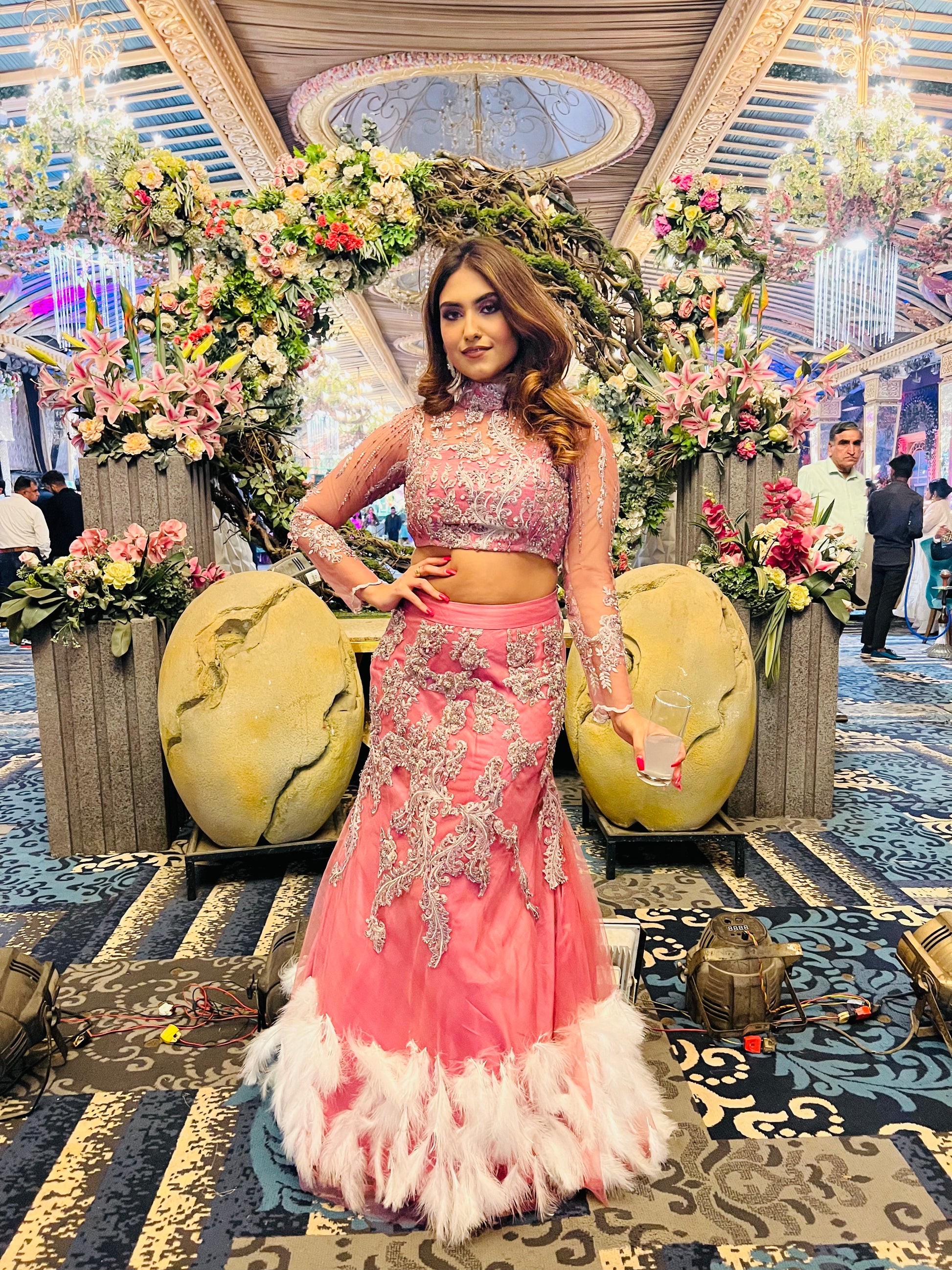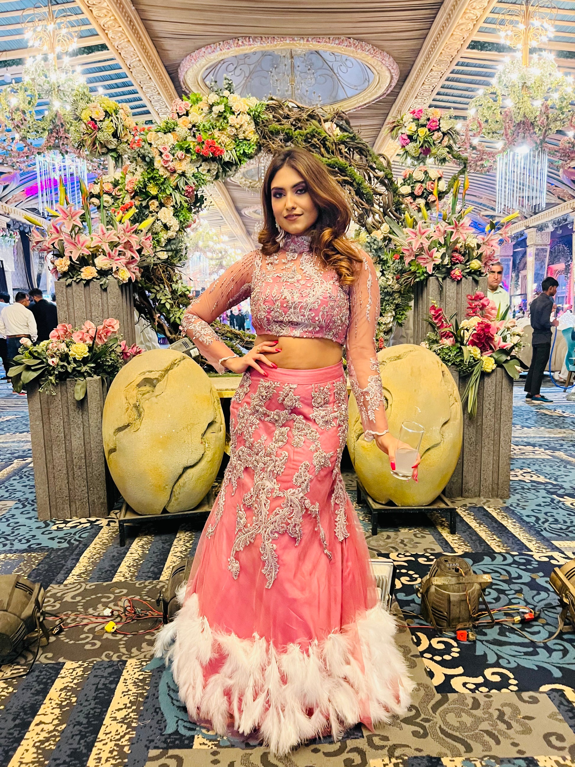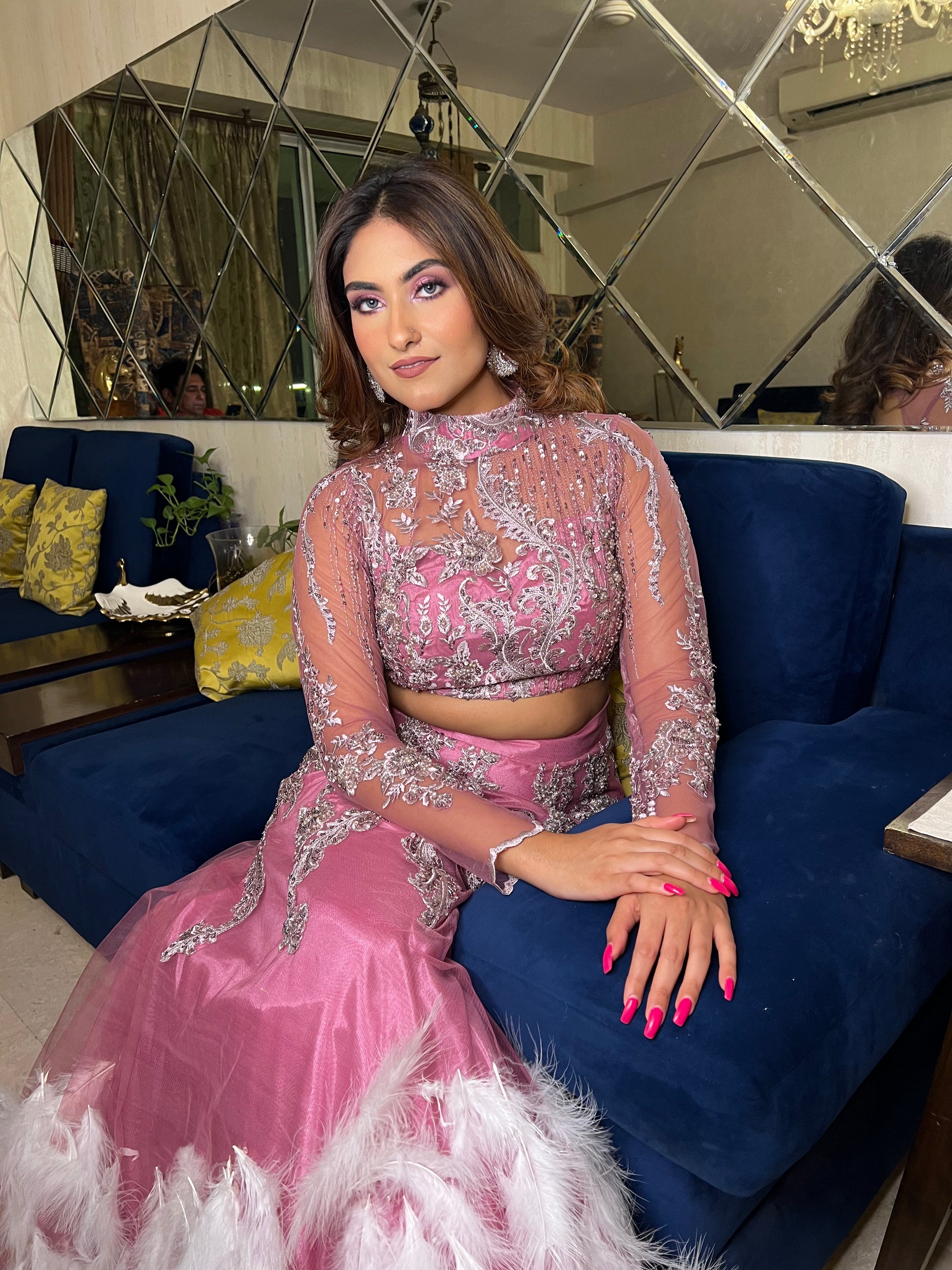 Turn heads with Nazaqatt's signature fishcut skirt and full-sleeve crop top ensemble. Crafted for the modern woman, this stunning set features intricate embroidery that exudes luxury and craftsmanship. The skirt’s fishcut design flatters your silhouette, while the plush fur trim along the hem adds a glamorous, bold touch. Paired with a chic crop top with full-length sleeves, this outfit strikes the perfect balance between elegance and contemporary style.