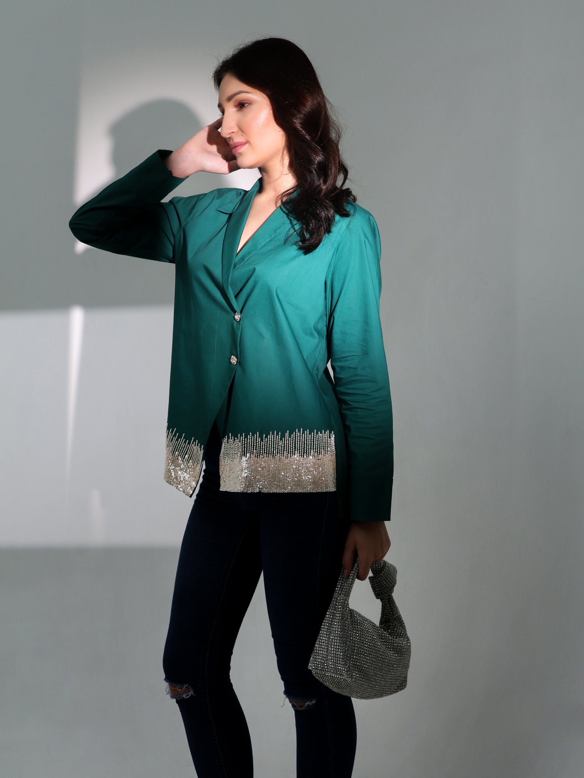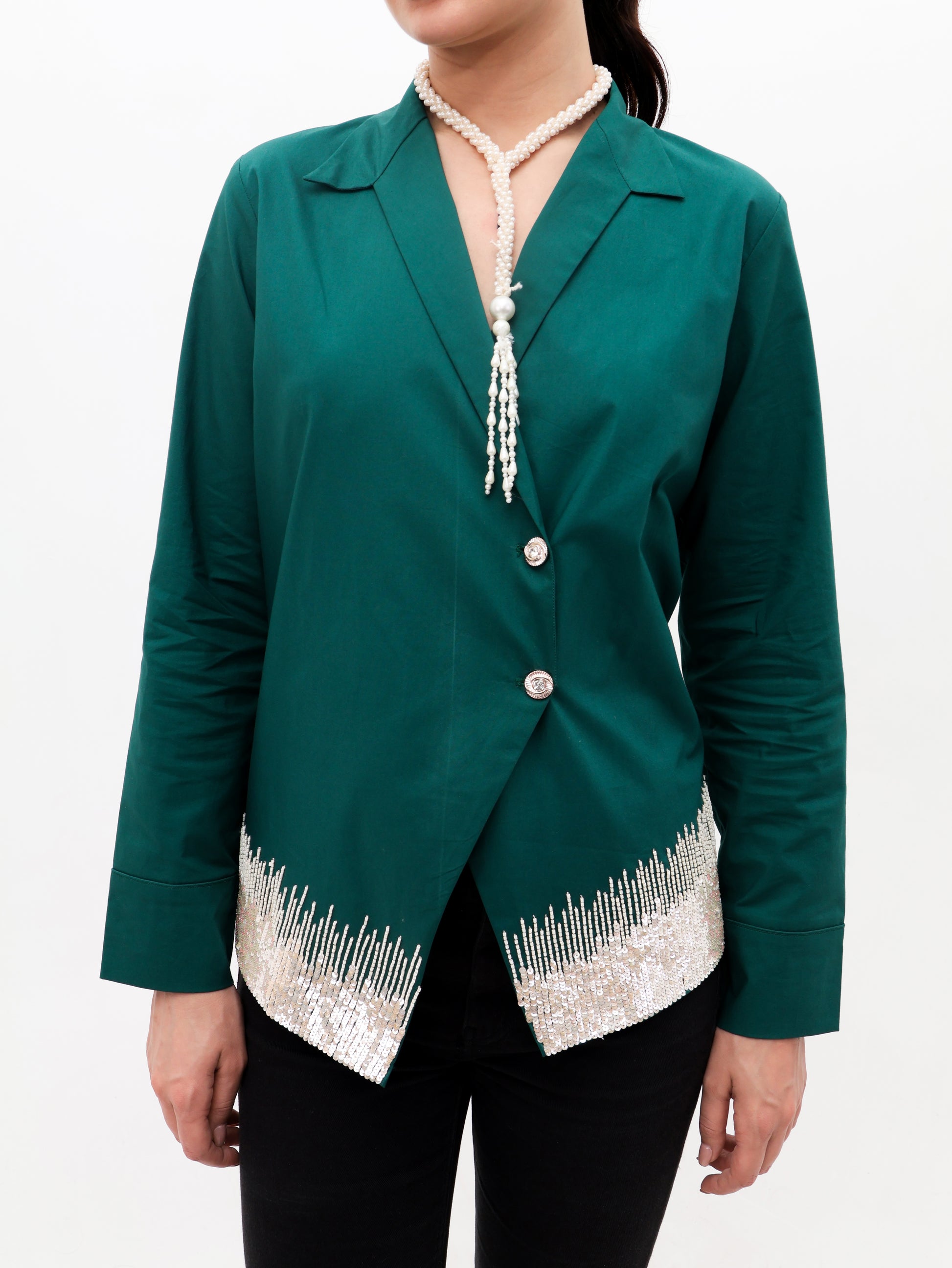 Elevate your wardrobe with our Emerald Edge Cotton Blazer Shirt, where sleek tailoring meets dazzling edge. Designed in a vivid emerald green and crafted from 100% cotton, this piece combines everyday ease with runway-worthy impact, thanks to its shimmering sequin embellishments.