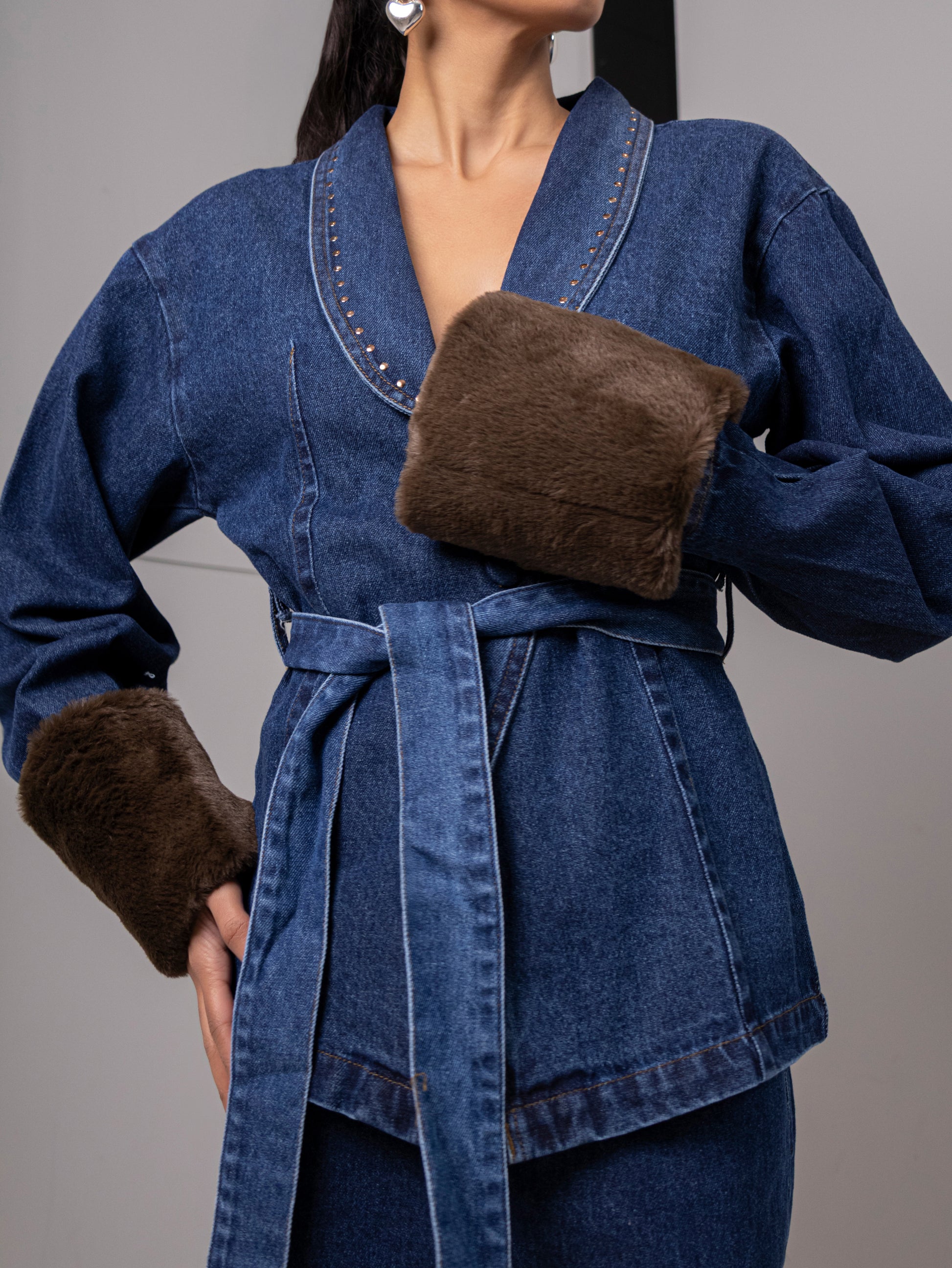 The Indigo Eclipse Fur-Cuff Denim Co-Ord redefines classic denim through a luxe, contemporary lens. Crafted in rich indigo denim, the wrap jacket features plush faux-fur cuffs and delicate stud detailing along the lapel. The belted waist sculpts the silhouette, while wide-leg trousers add fluid elegance, making this set ideal for elevated winter styling.