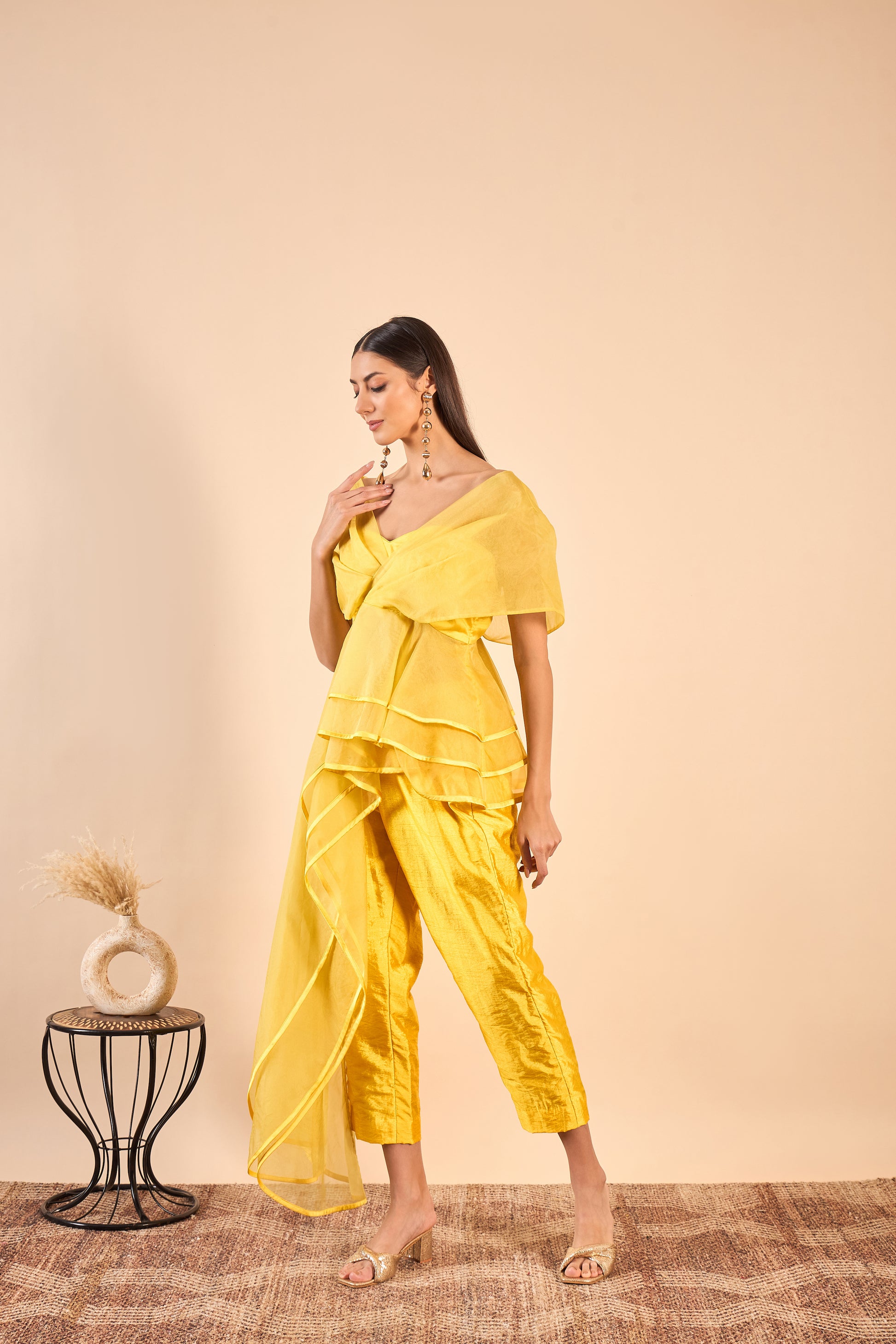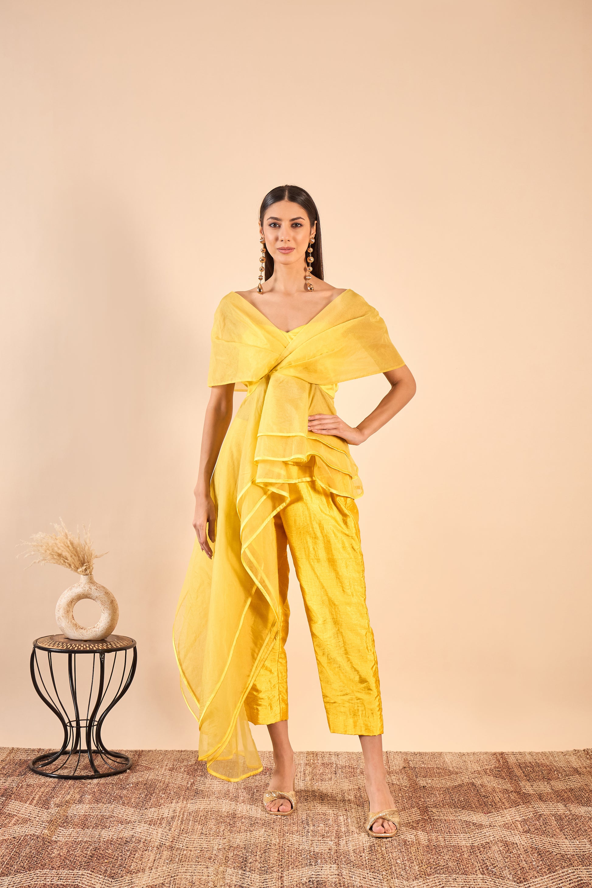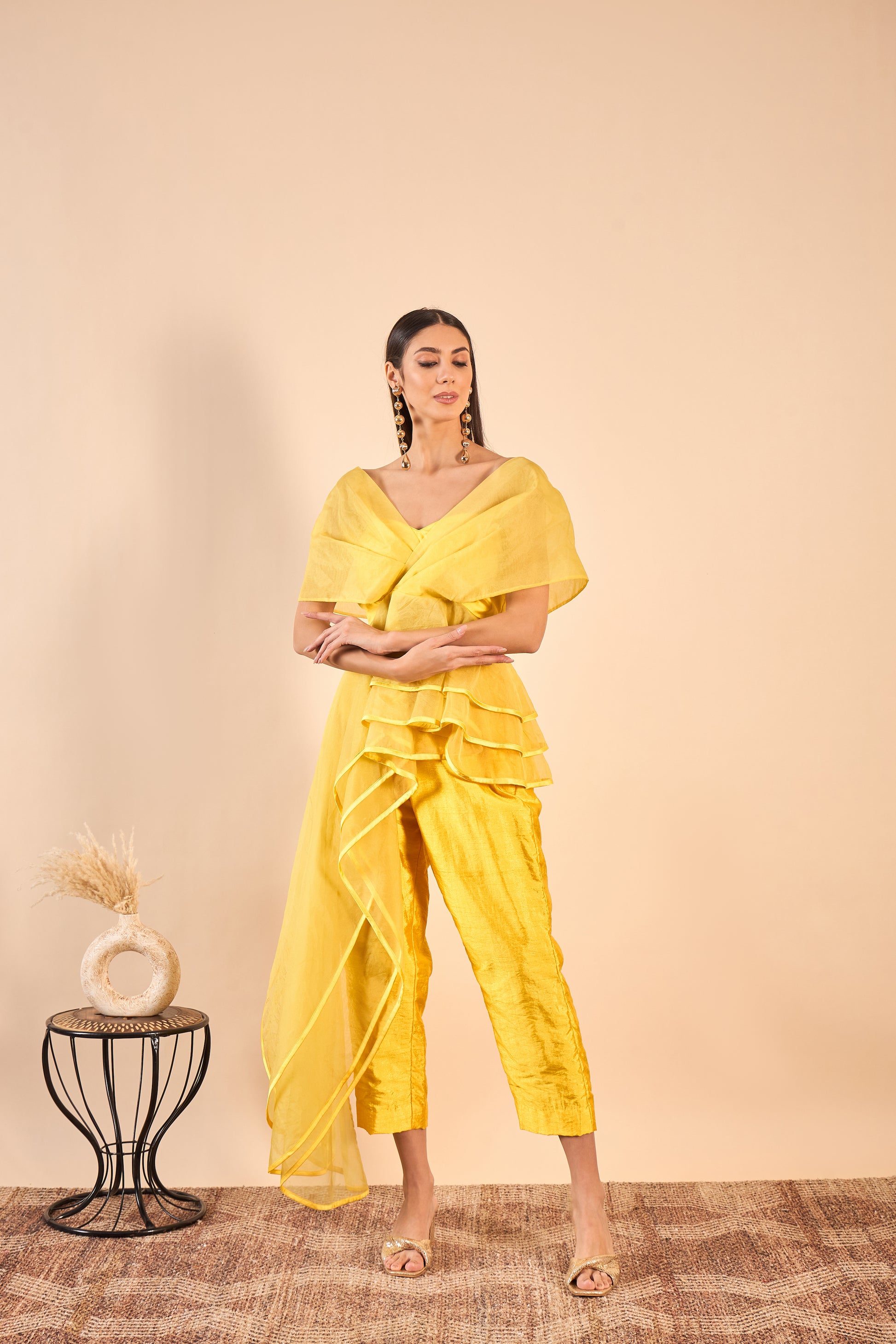 Make a bold statement with Indo Western Co-ord, an ensemble designed for the vibrant and confident fashion enthusiast. This sunny outfit features a chic yellow top adorned with playful ruffles, paired with sleek straight-cut yellow pants that create a harmonious and striking silhouette. Perfect for brunches, daytime events, or lively evenings, this coord set showcases Nazaqatt's commitment to contemporary design and flawless craftsmanship.