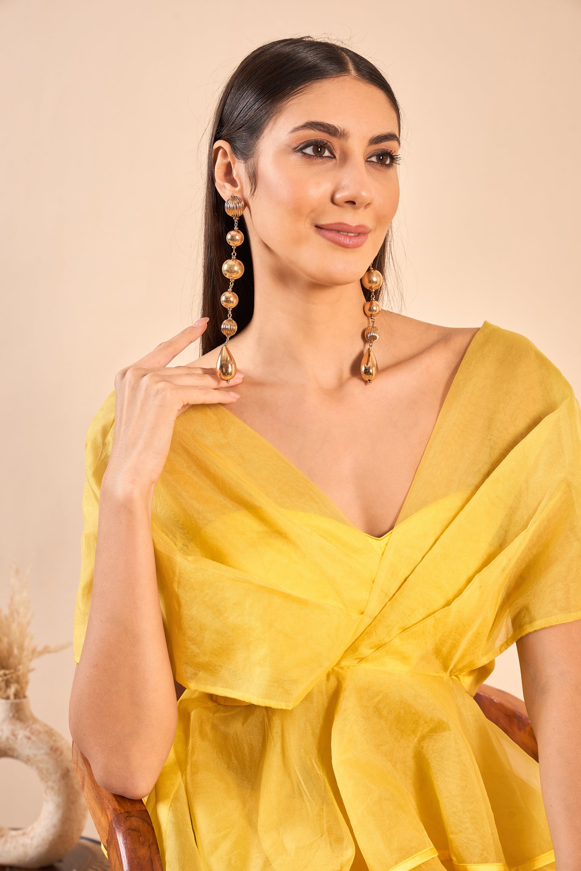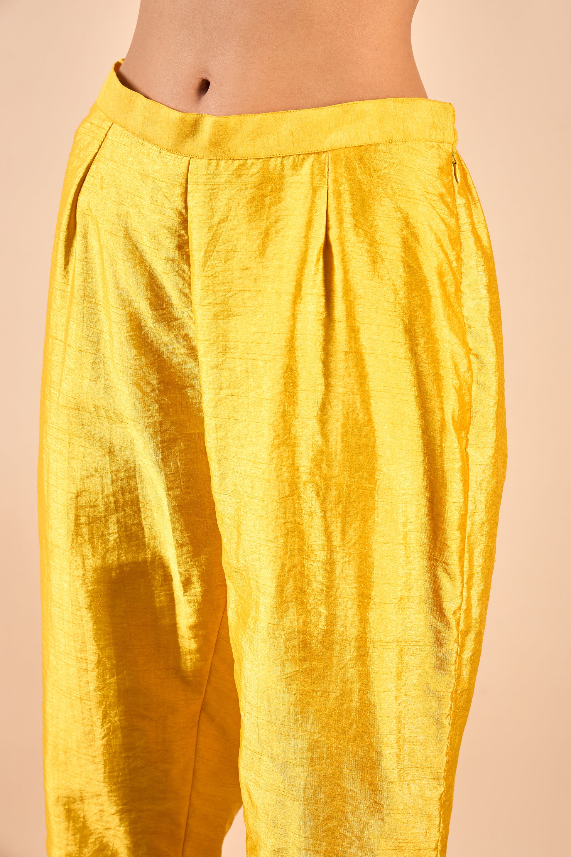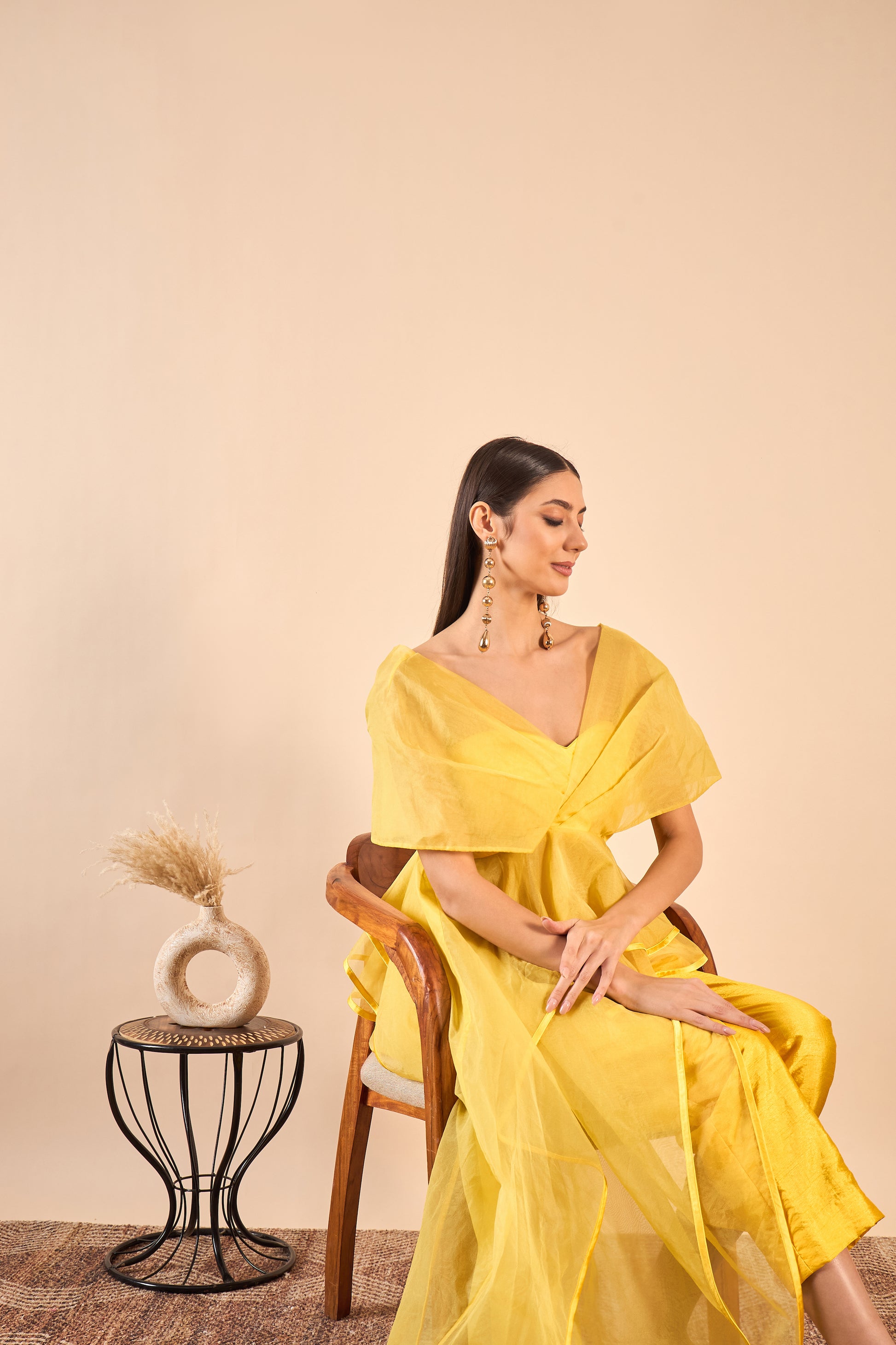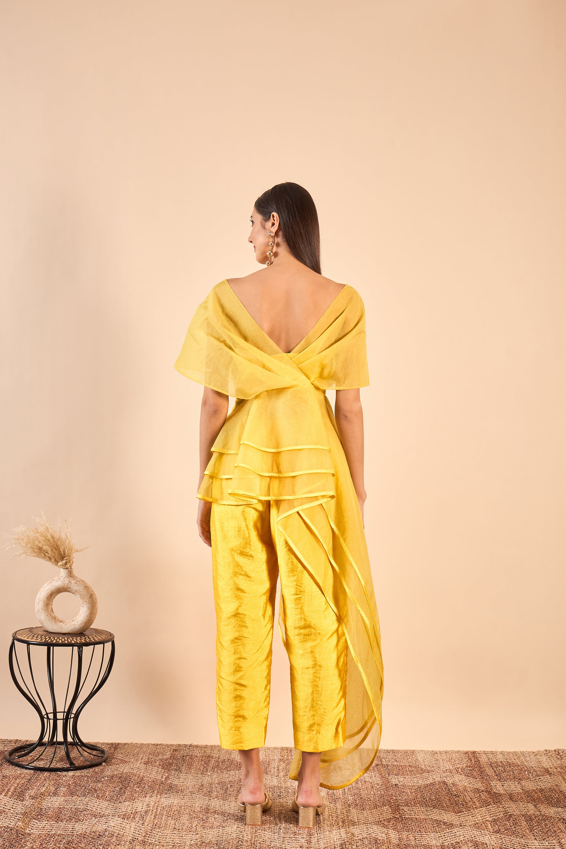 Make a bold statement with Indo Western Co-ord, an ensemble designed for the vibrant and confident fashion enthusiast. This sunny outfit features a chic yellow top adorned with playful ruffles, paired with sleek straight-cut yellow pants that create a harmonious and striking silhouette. Perfect for brunches, daytime events, or lively evenings, this coord set showcases Nazaqatt's commitment to contemporary design and flawless craftsmanship.