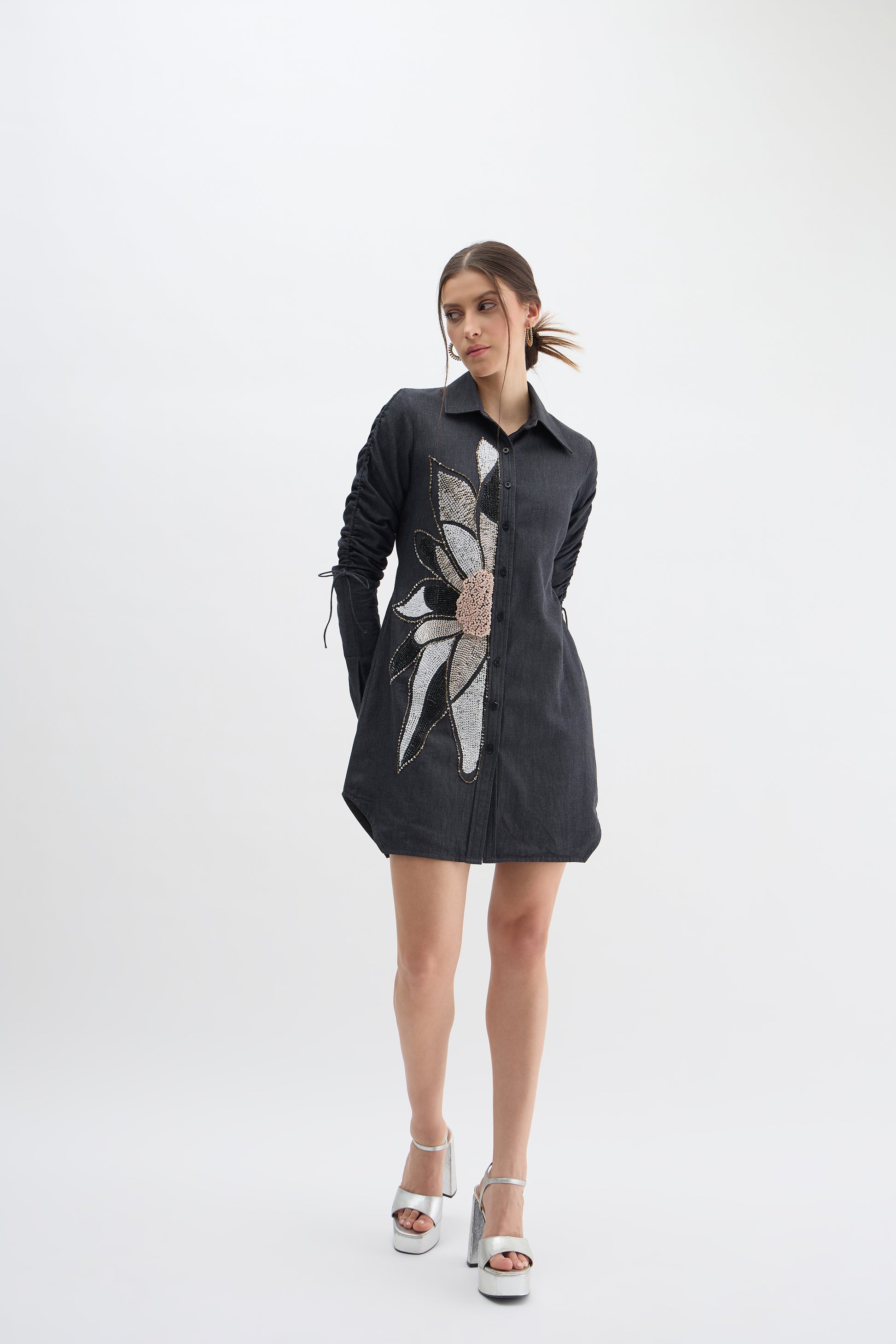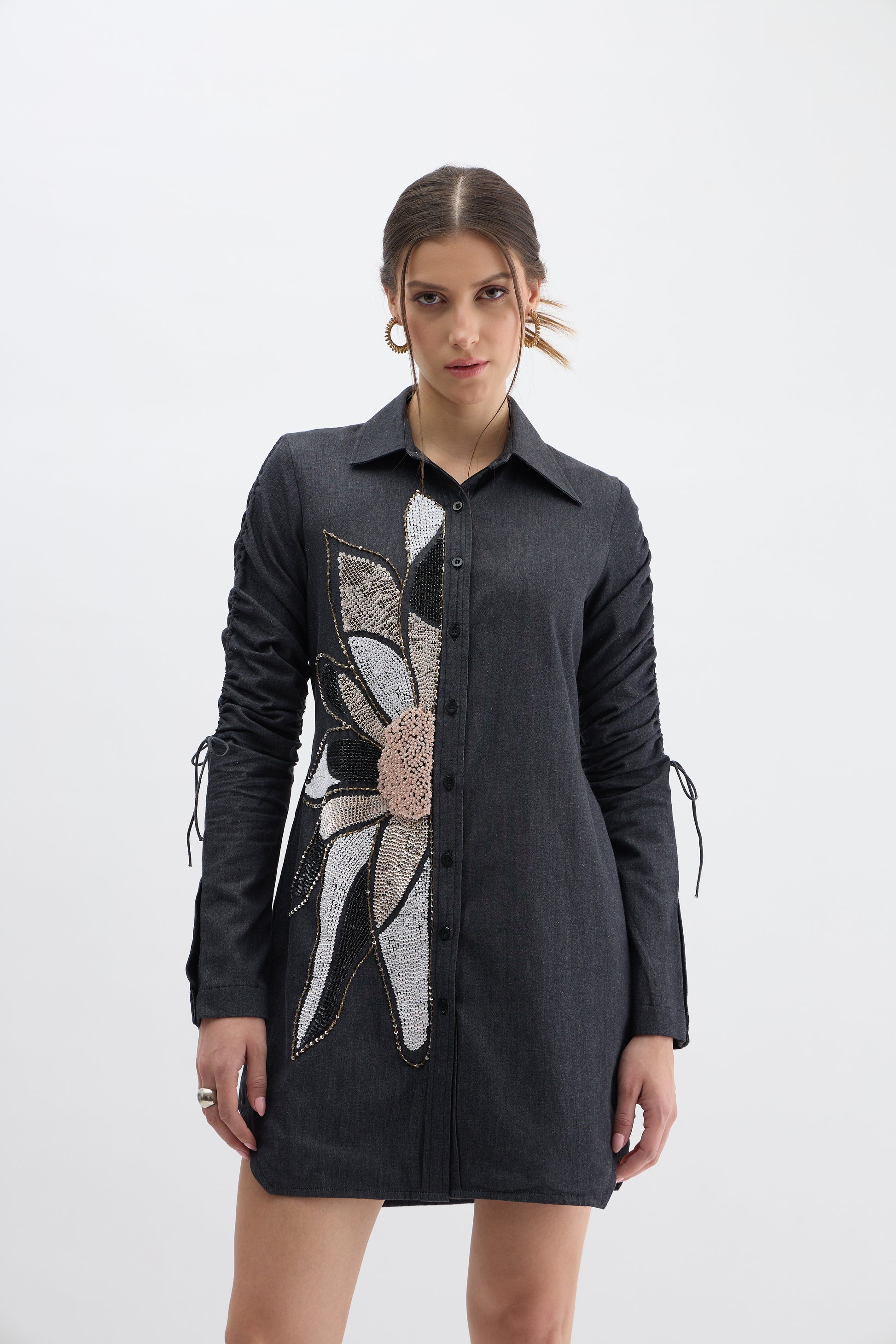 Make a powerful style statement with the Midnight Bloom Embellished Denim Shirt Dress, where classic utility meets feminine artistry. Crafted from rich black denim fabric with a structured yet comfortable finish, this shirt dress is transformed by a dramatic oversized floral motif — intricately hand-embellished with sequins and beads that catch the light with every step. The silhouette is sharp and streamlined with a full button-down front, tailored shirt collar, and long ruched sleeves finished with adjustable ties for a sculptural, fashion-forward edge. Set against a clean, minimalist canvas, the bold floral embroidery stands out as a work of wearable art — balancing strength with softness.
