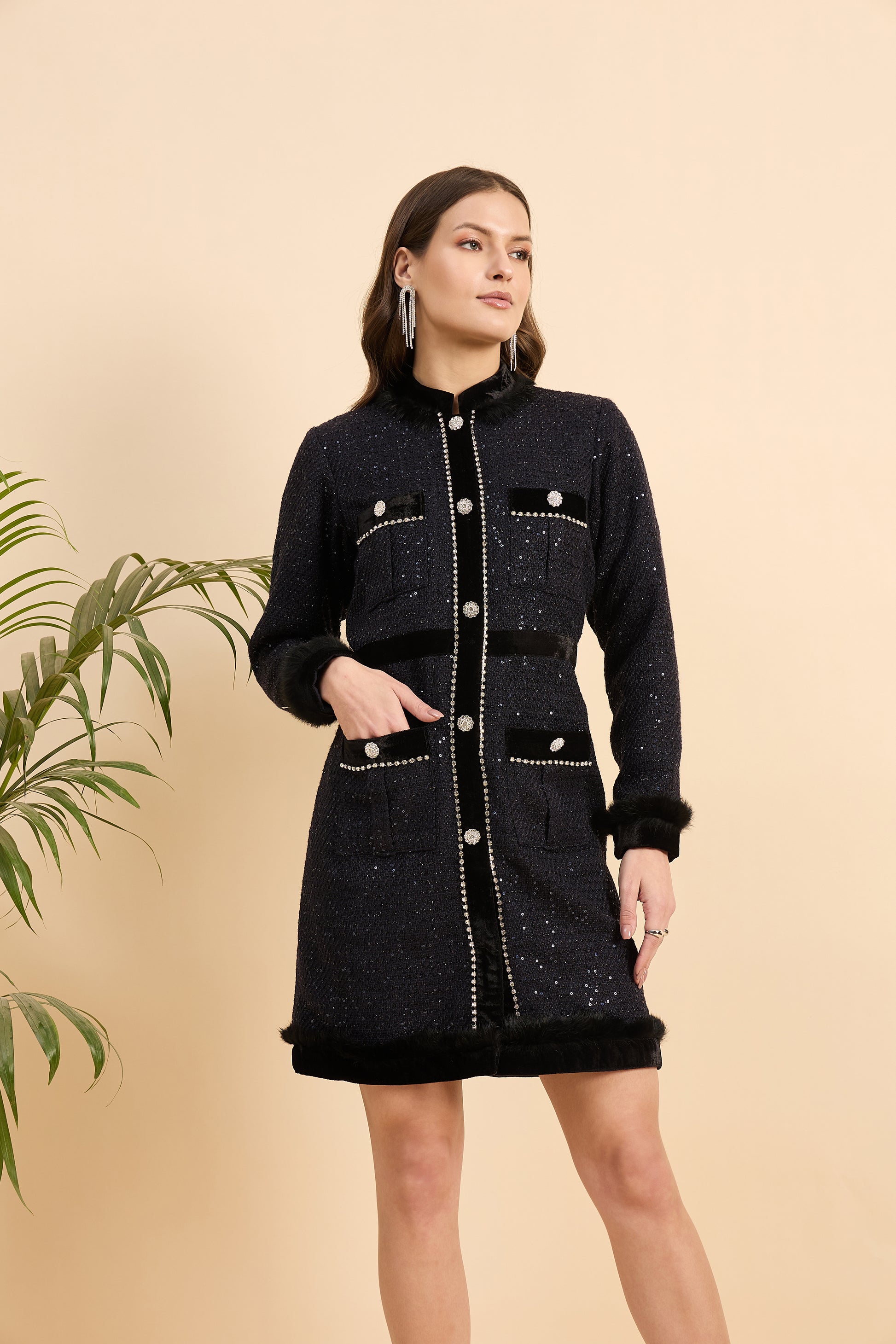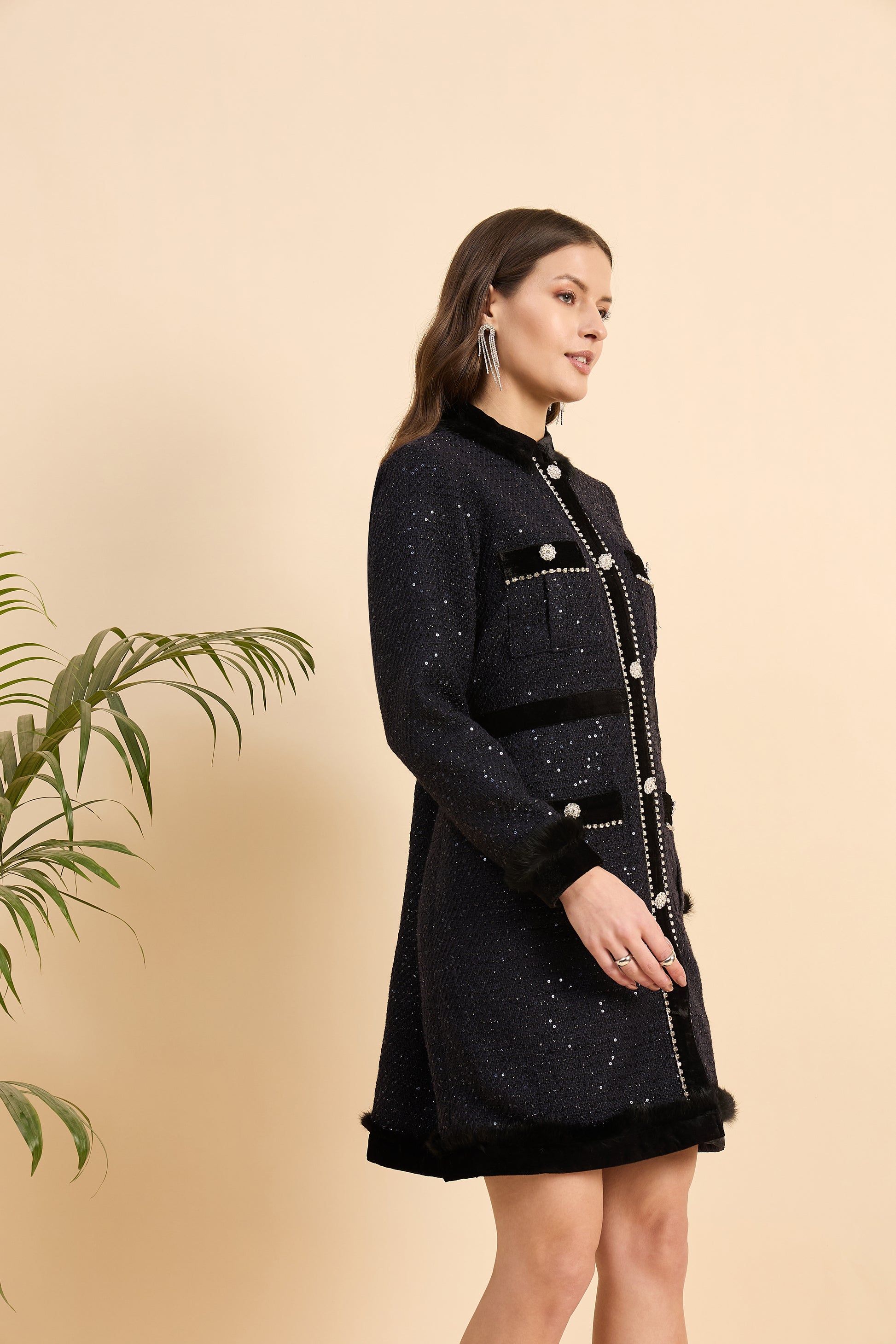 Whether you're attending a cocktail party, an evening gala, or a high-profile business event, The Midnight Luxe Tweed Dress ensures you captivate with grace and style.