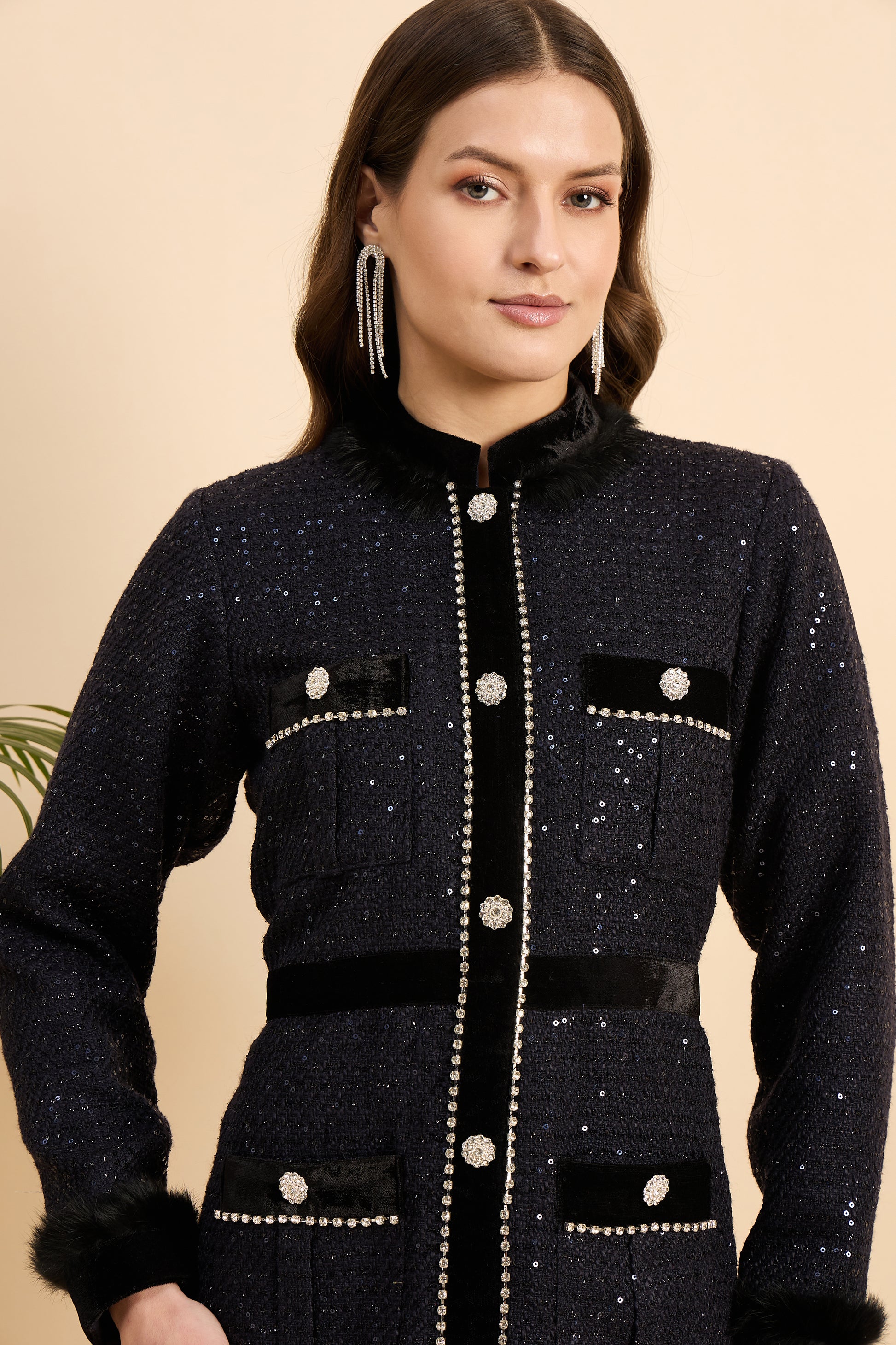 The faux fur trim at the collar, cuffs, and hem adds a touch of opulence, while the pearl and crystal embellishments along the front placket and pockets elevate its regal appeal. The structured silhouette ensures a flattering and polished look, making it perfect for elegant soirées, upscale dinners, or formal events.