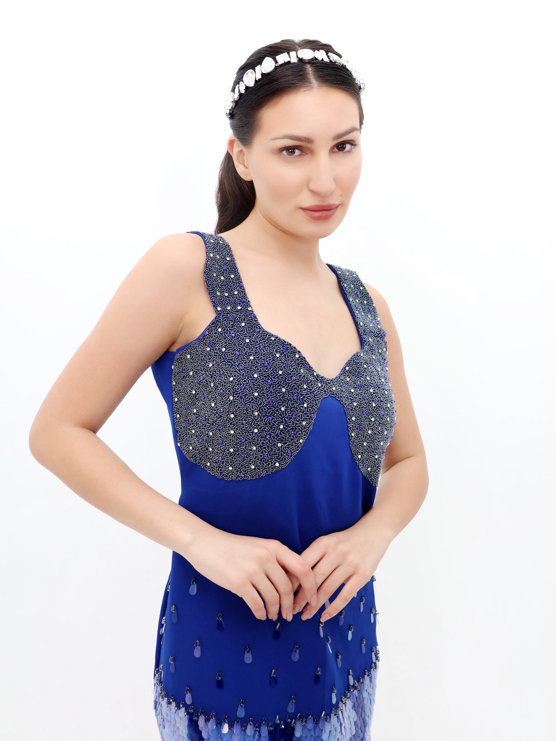 A mesmerizing blend of elegance and glamour, the Starlight Switch Dress is designed for the modern woman who loves to stand out. Crafted in a deep midnight blue hue, this sleeveless dress features an intricately embellished bodice with shimmering beadwork that catches the light beautifully. The fitted upper transitions into a flared hem adorned with cascading sequins, creating a stunning gradient effect reminiscent of a starry night sky.