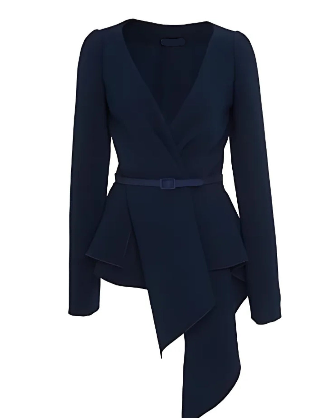 This navy blue blazer with a detachable belt and asymmetric design is the epitome of contemporary elegance, making it a standout addition to your wardrobe.