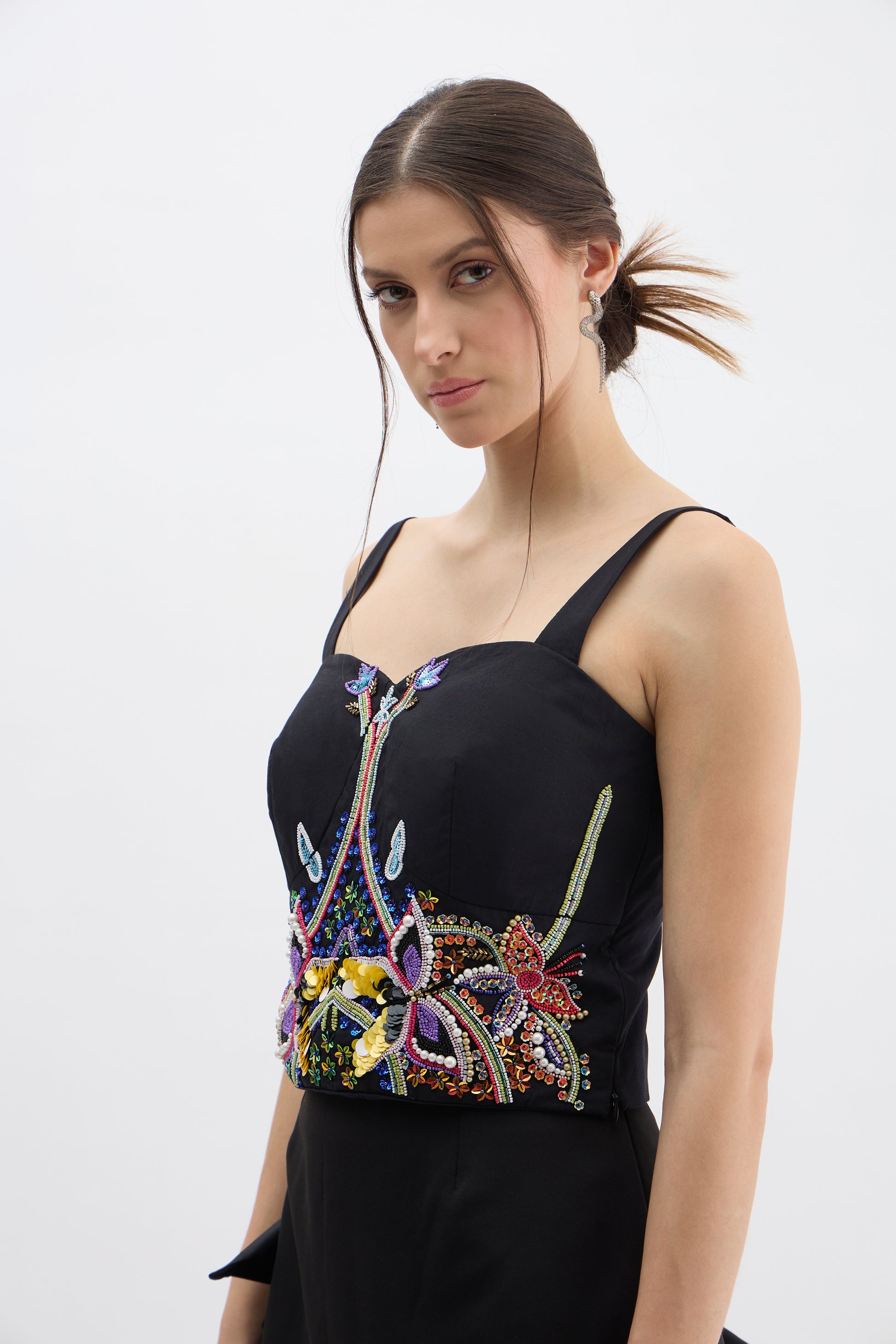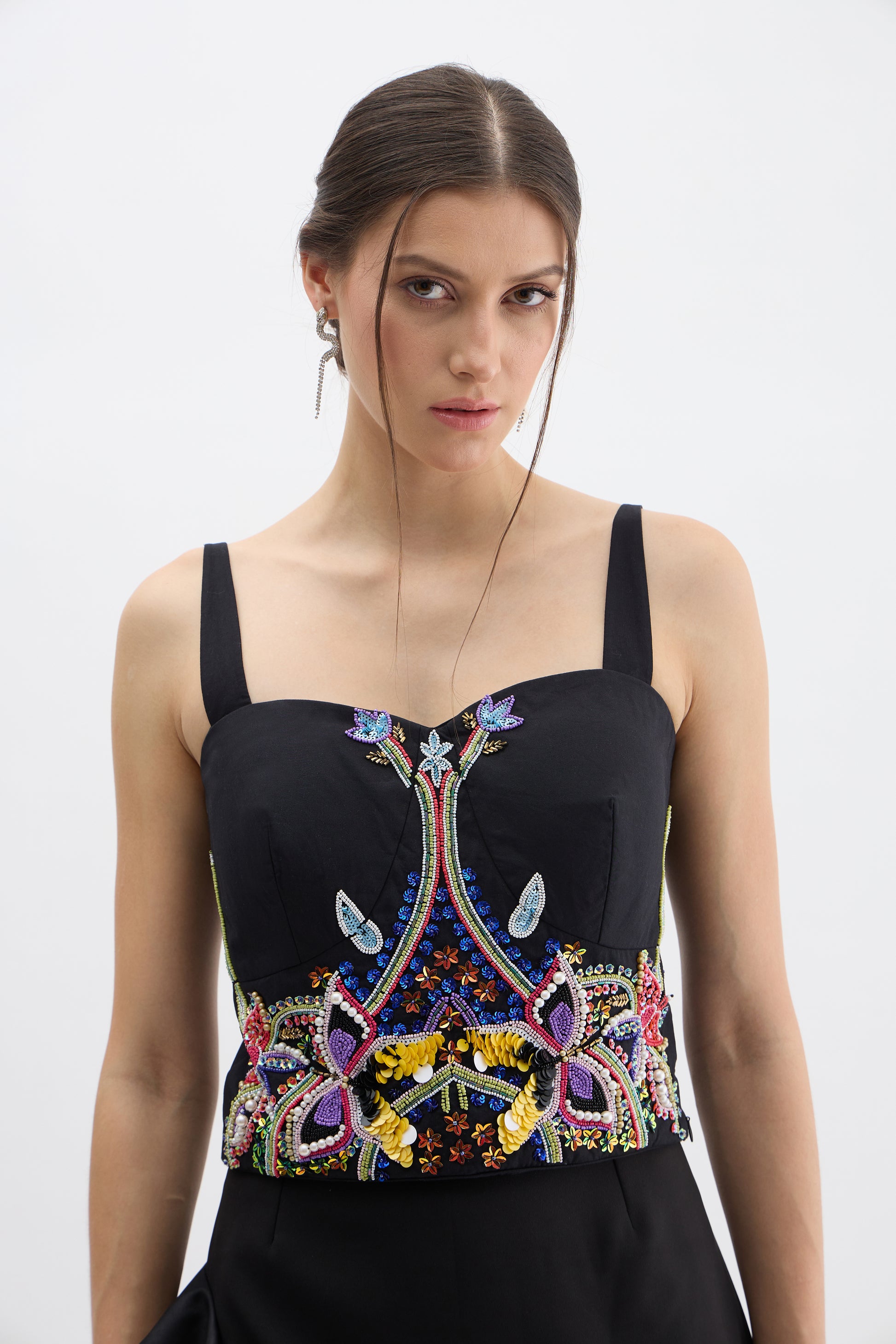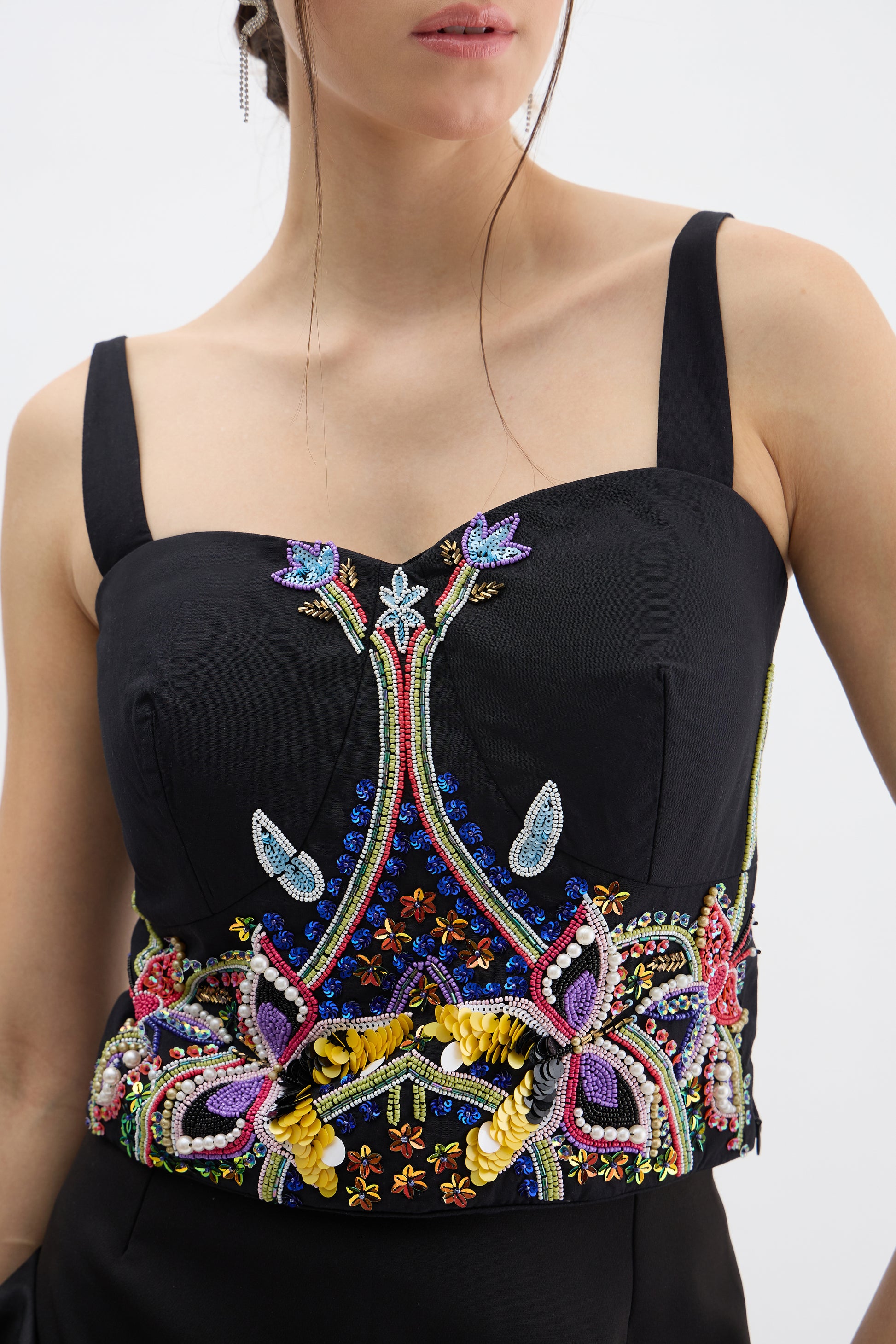 - Embellished Corset Top: Hand-sewn embroidery and beading for a statement look.