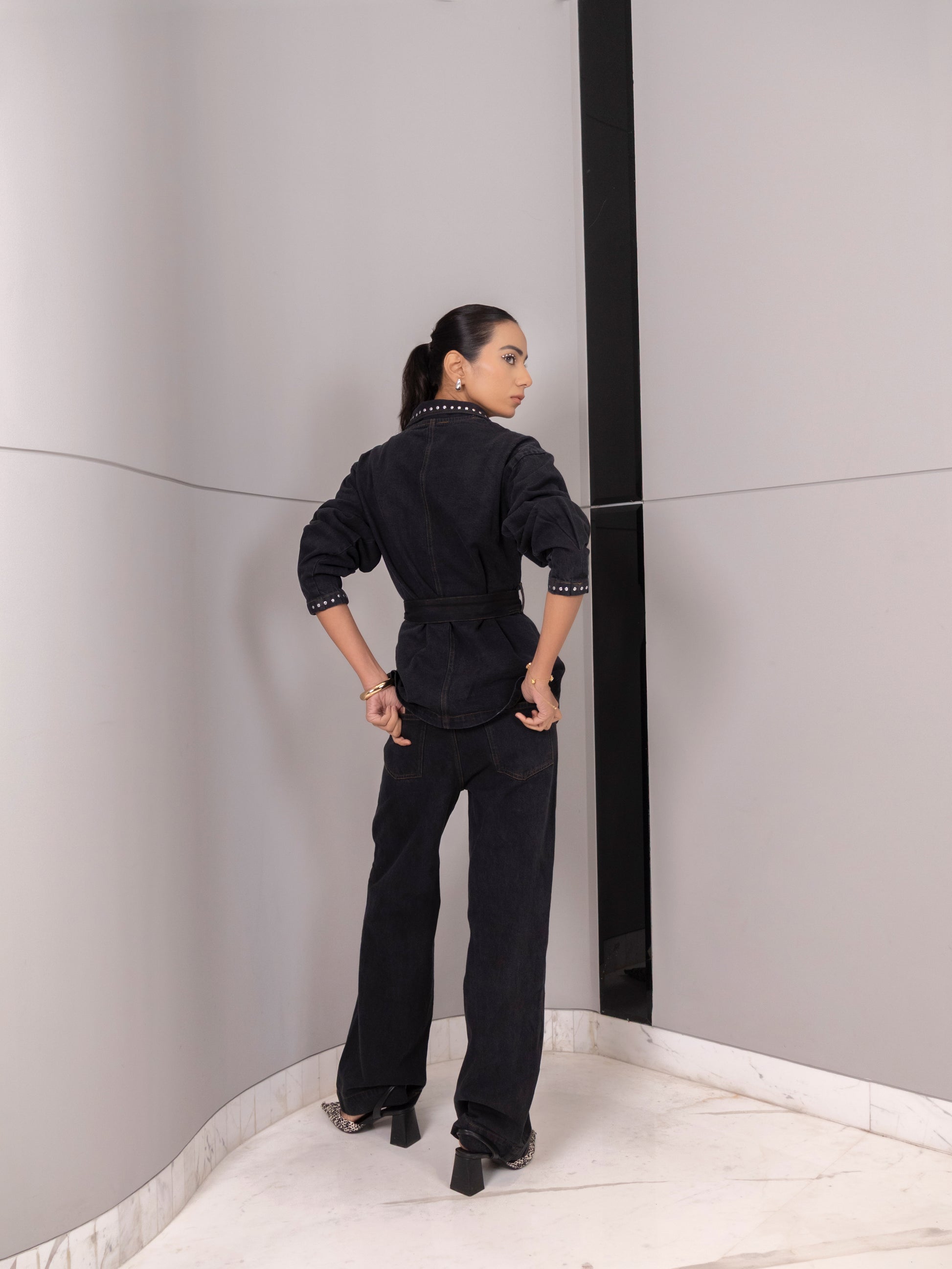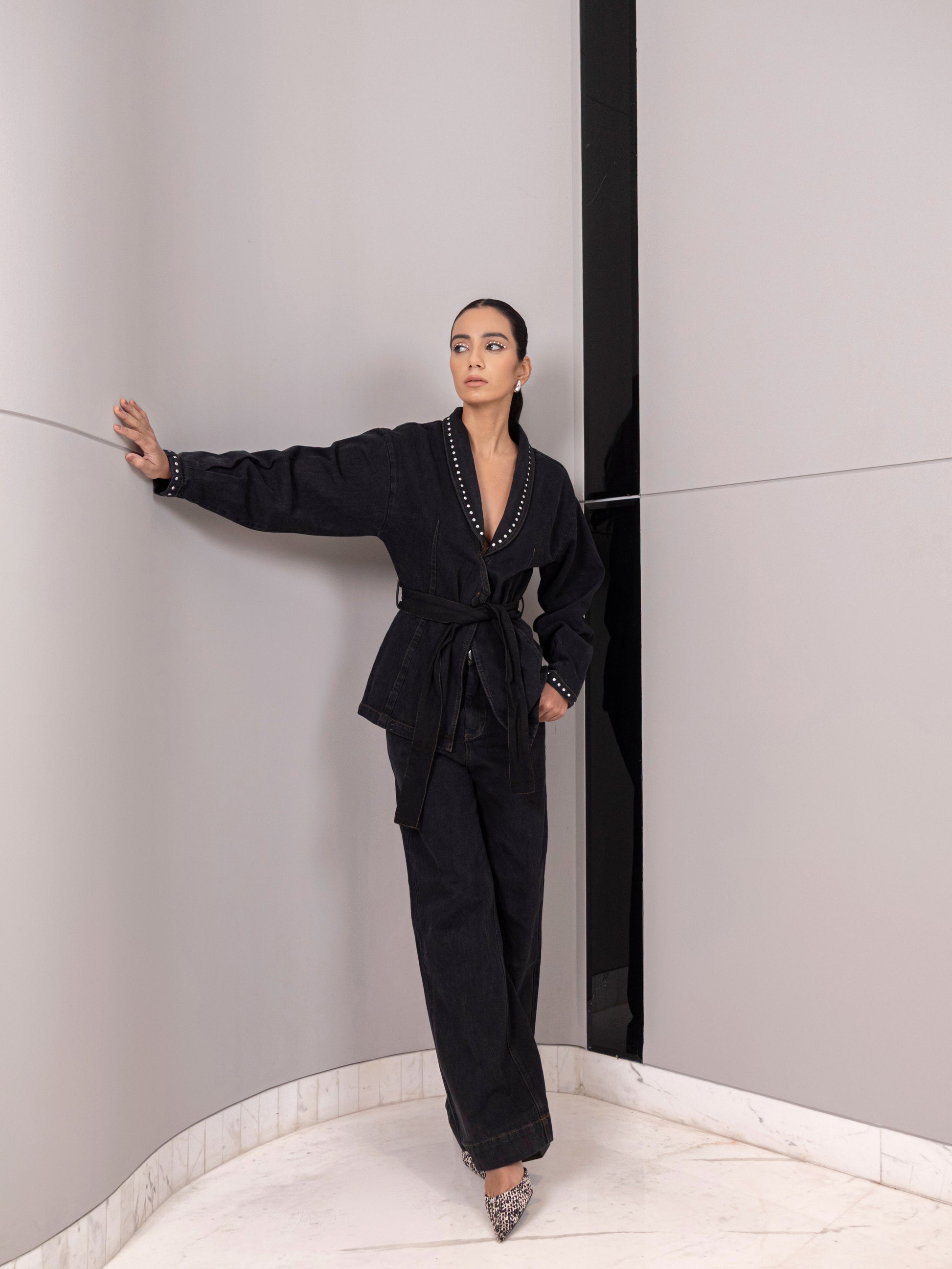 An elevated denim power set designed for confident evenings and bold winter styling.