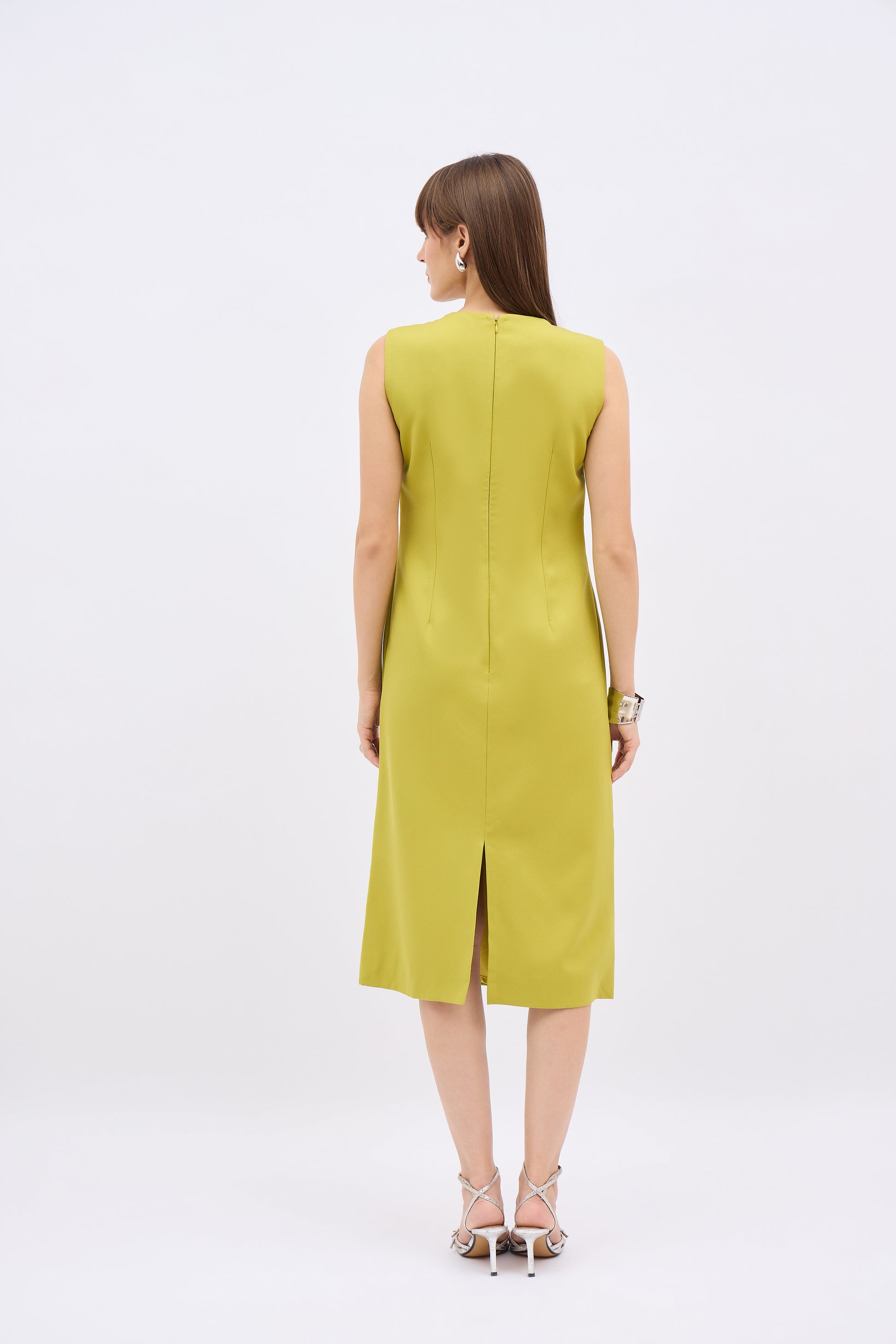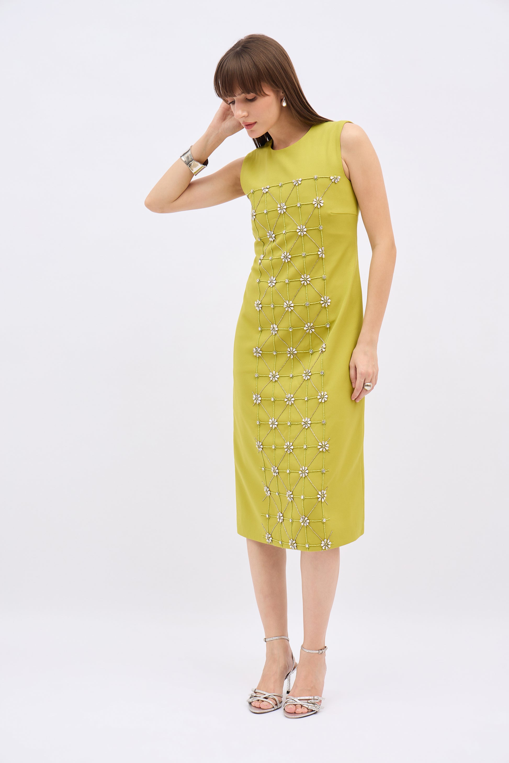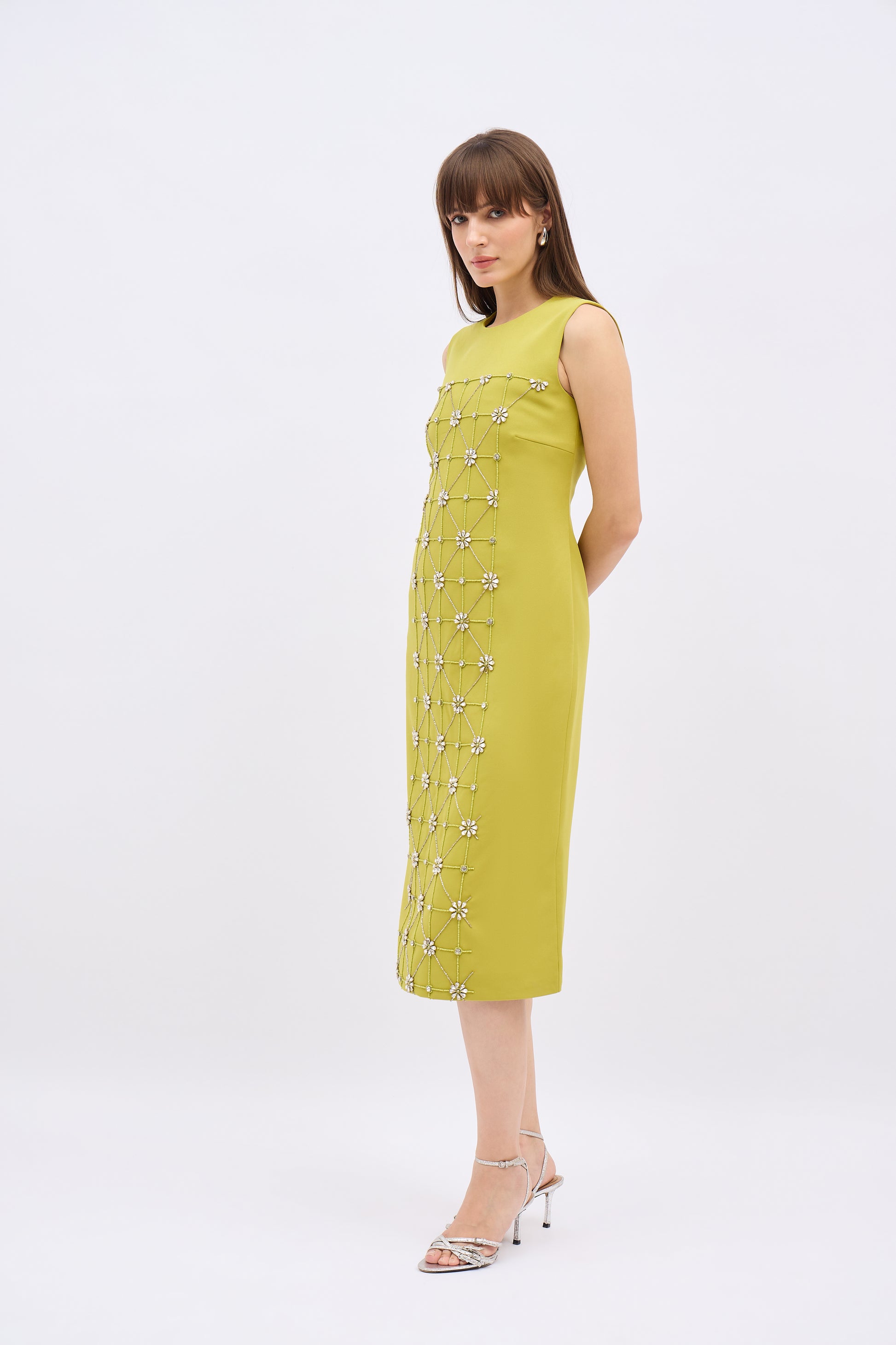 Elevate your evening style with the Olive Gleam Embellished Column Dress, a refined statement piece that seamlessly blends structure with sparkle. Cut from a luxe moss green crepe fabric, this sleeveless midi dress exudes elegance through its clean lines and architectural silhouette. The front is adorned with an intricate grid of crystal floral embellishments, meticulously placed to catch the light and add depth to the otherwise minimal shape. Designed to flatter with a gently tapered waist and straight hem, the dress is perfect for cocktail soirées, gallery openings, or upscale dinners. Pair it with metallic heels and minimal accessories to let the embellishment shine.