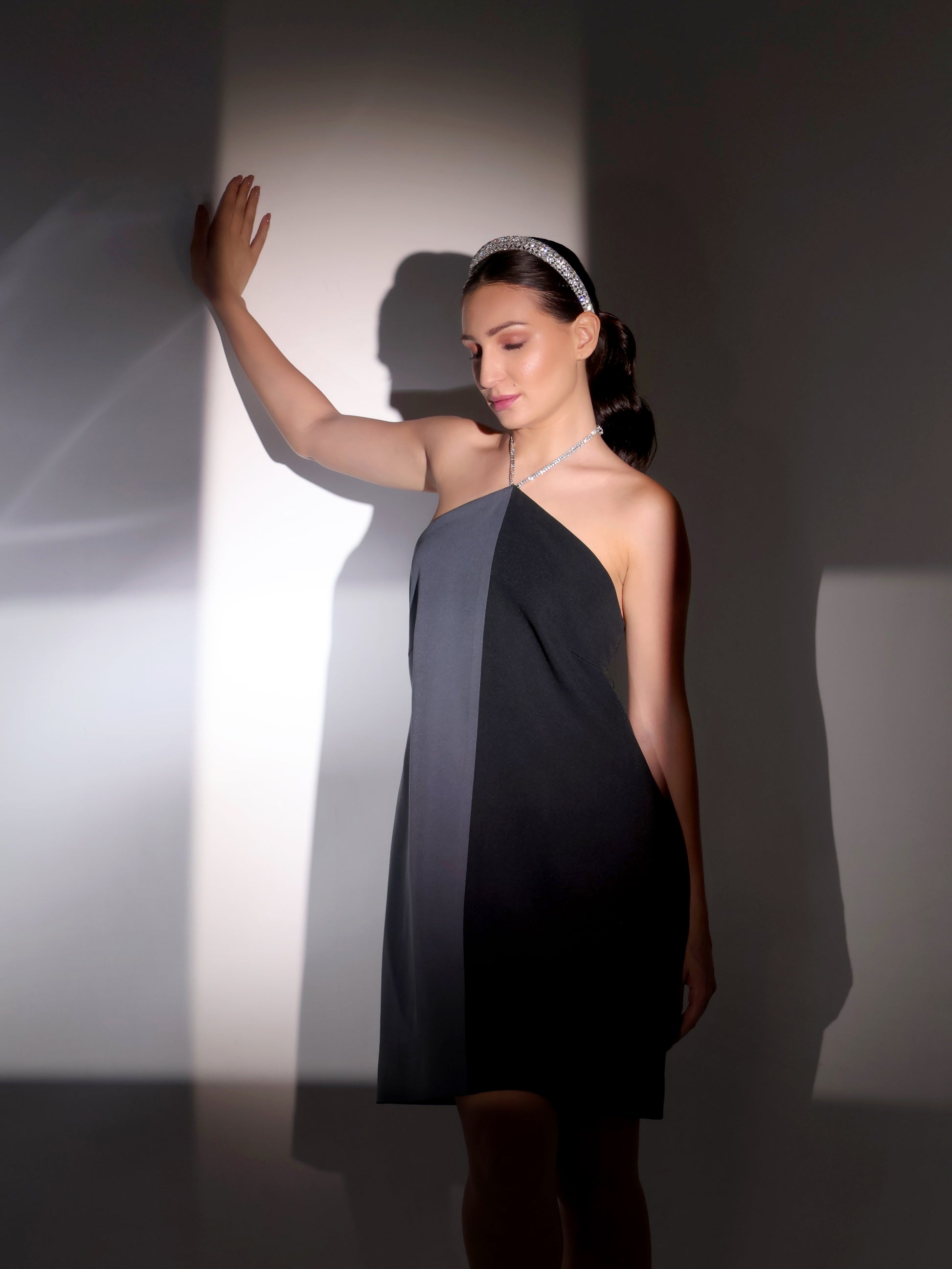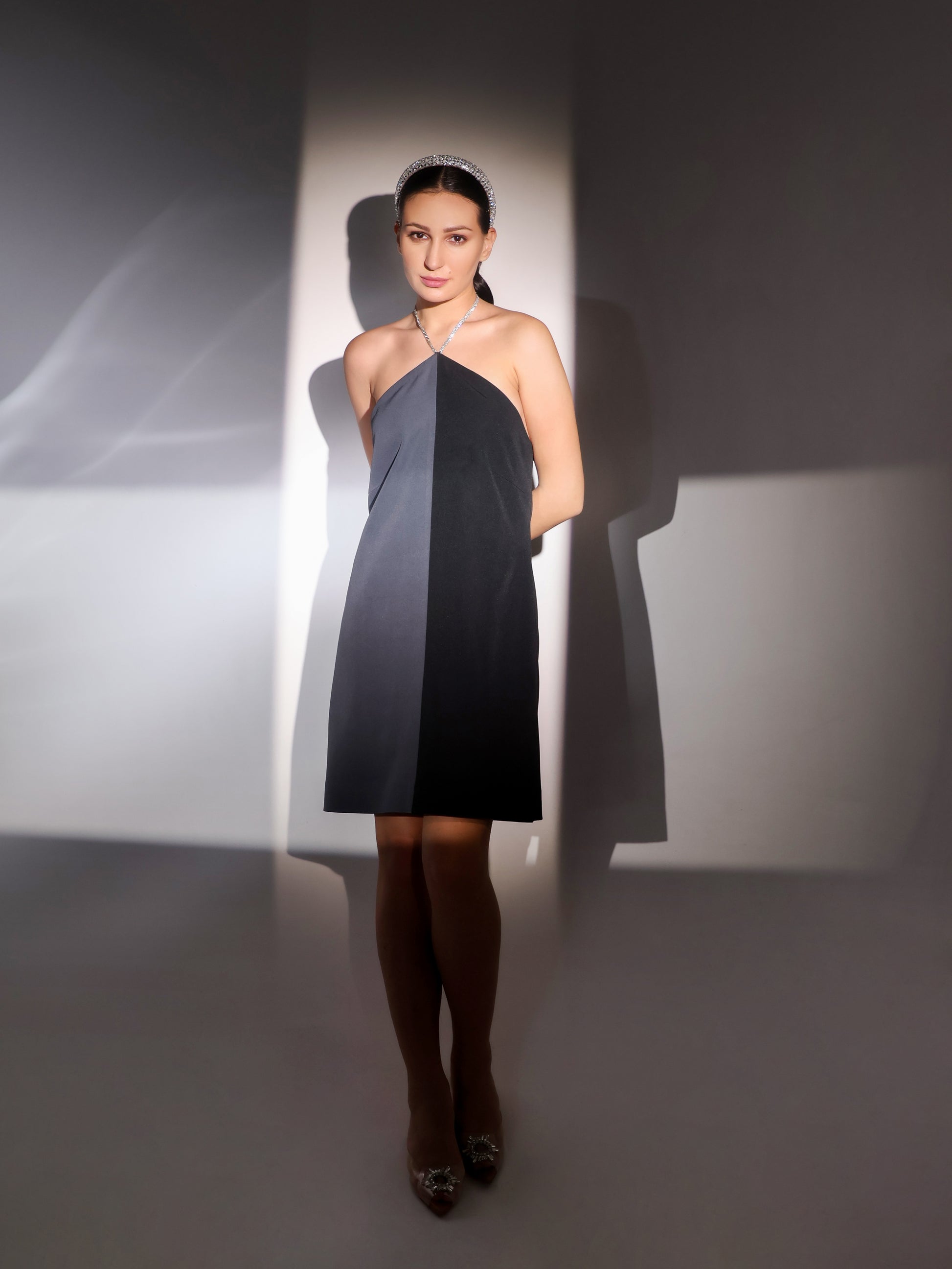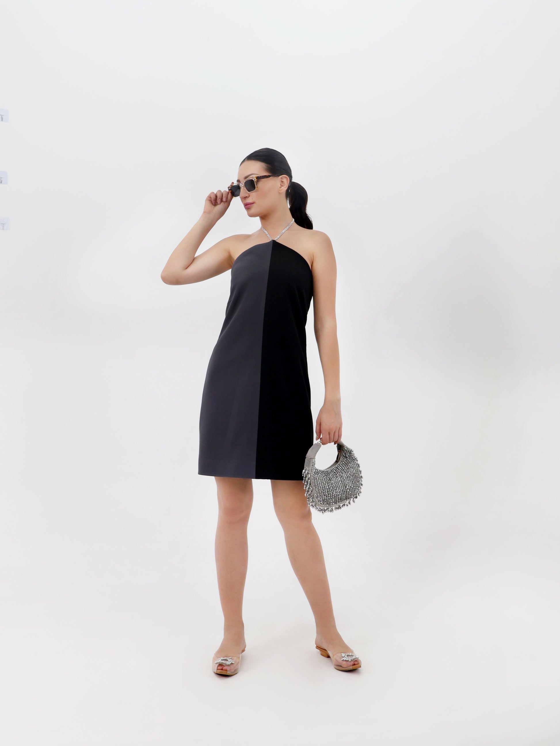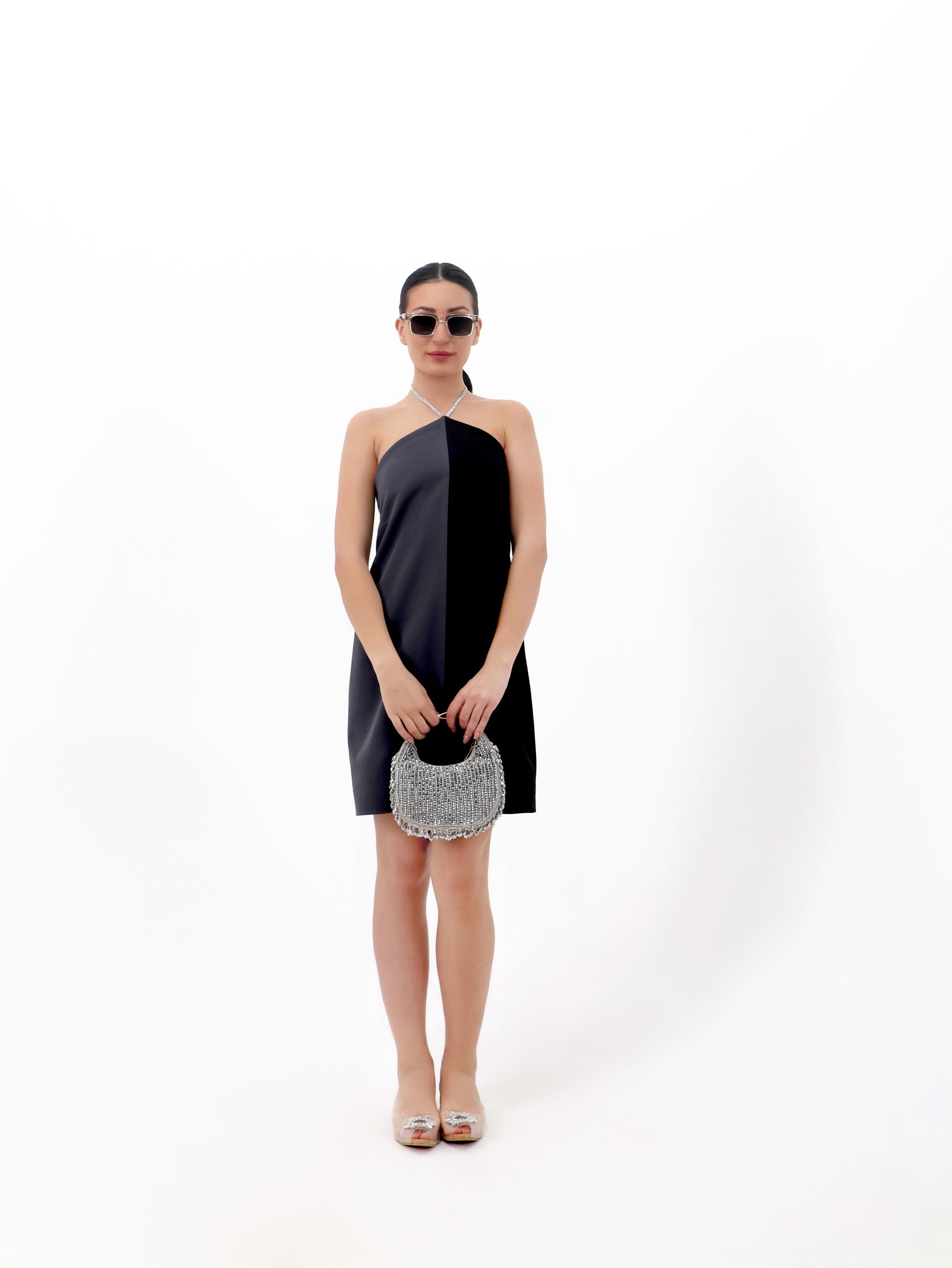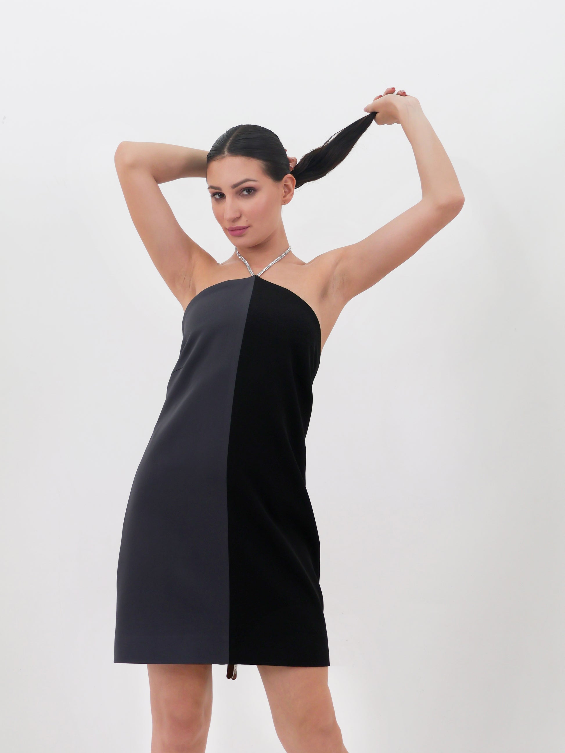 Step into effortless sophistication with this Half and Half Black Dress, a refined yet modern piece designed for elegant occasions. The asymmetric paneling of plush black Banana crepe fabric creates a striking contrast, enhancing the minimalist silhouette. The halterneck design features a crystal-embellished choker detail, adding a touch of glamour to this chic ensemble.