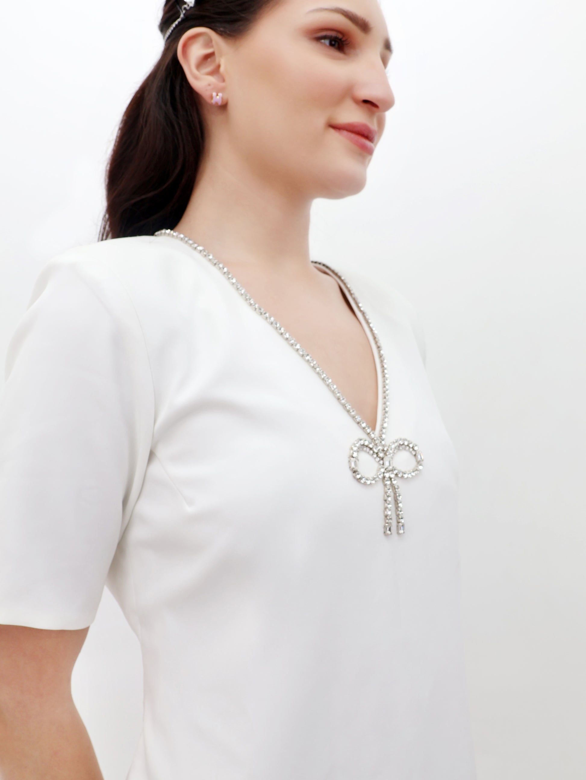 Make a statement with this Sugar Frost Dress, designed for timeless elegance with a modern twist. The structured silhouette is elevated by a deep V-neckline, adorned with dazzling crystal embellishments that form a delicate bow, adding a touch of femininity and glamour.