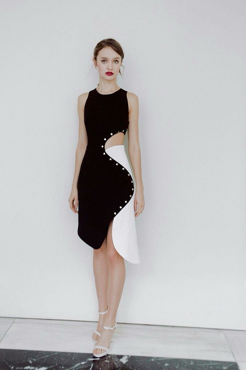 Drape yourself in elegance with this Pearl-Embellished Cutout Midi Dress, a captivating blend of sophistication and contemporary edge. The sleek black-and-white contrast design is accentuated by pearl embellishments that trace the striking wave-like cutout, adding a touch of refinement. The asymmetrical hemline enhances the modern aesthetic, making this dress a statement piece for high-end gatherings, cocktail parties, and formal evenings.