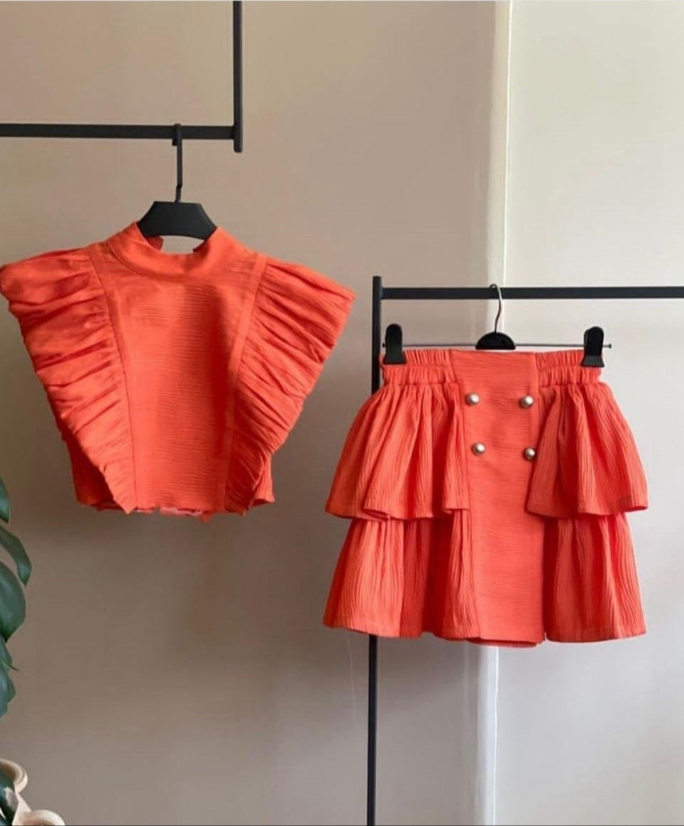 Make a bold fashion statement with Nazaqatt’s Ruffled Elegance Co-Ord Set, designed for those who love a unique and stylish look. This set includes a high-neck crop top with dramatic ruffled sleeves, creating a structured yet feminine appeal. The matching high-waisted skirt features layered ruffles with pearl button detailing, adding a sophisticated touch. Perfect for brunch outings, casual events, or stylish daytime wear, this co-ord set effortlessly blends elegance with a playful charm.