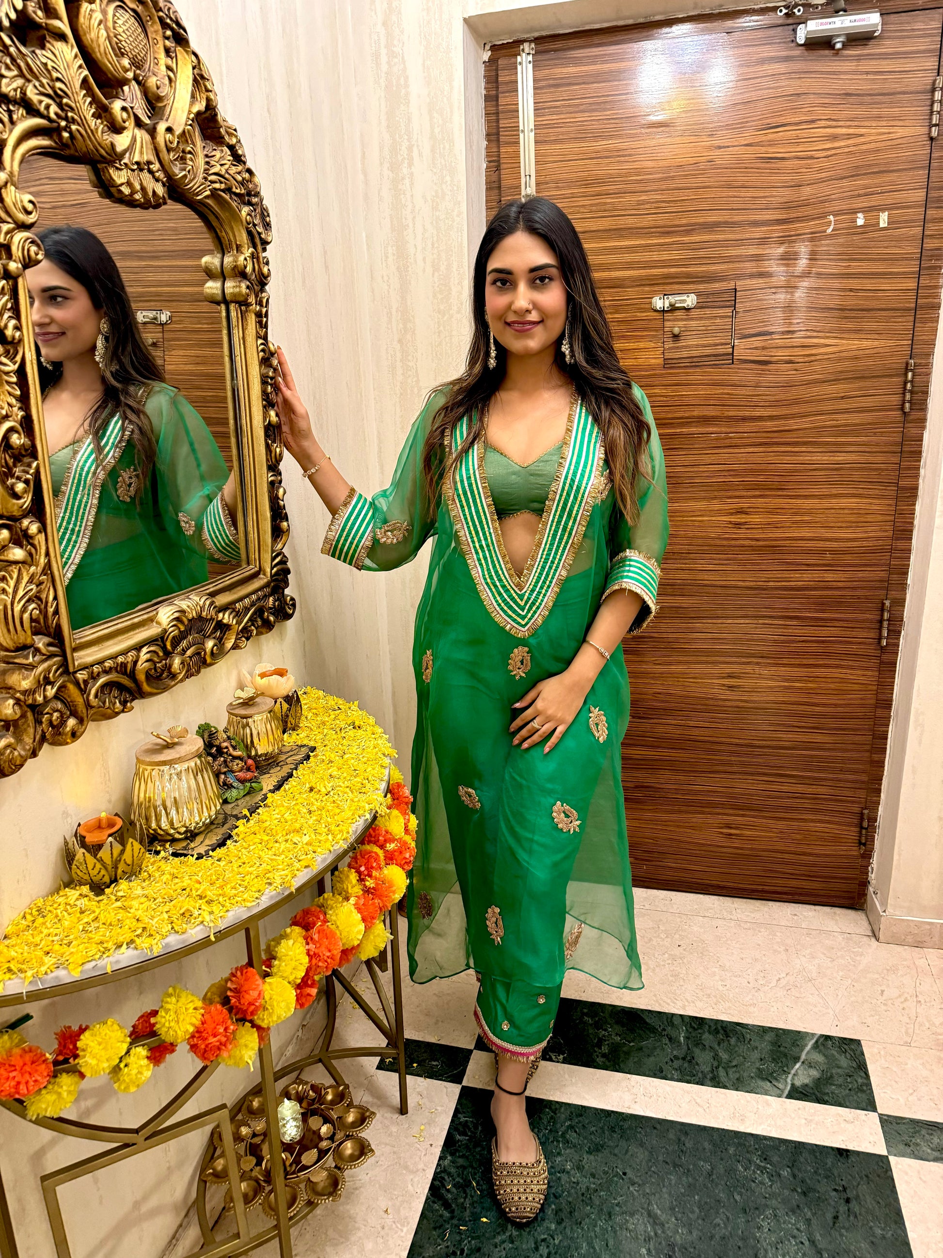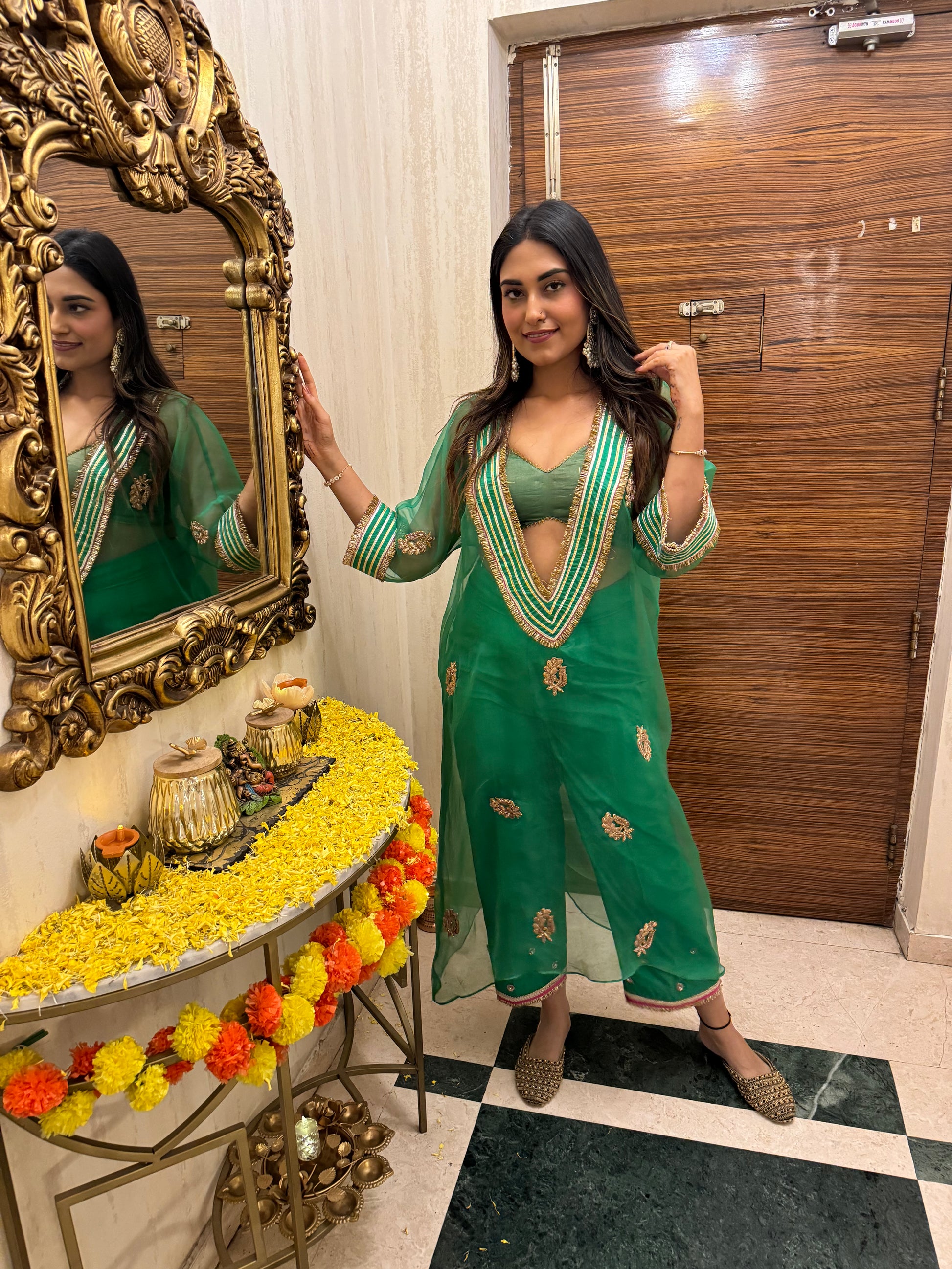 - Deep neck kurta with a chic bustier for a layered, elegant look