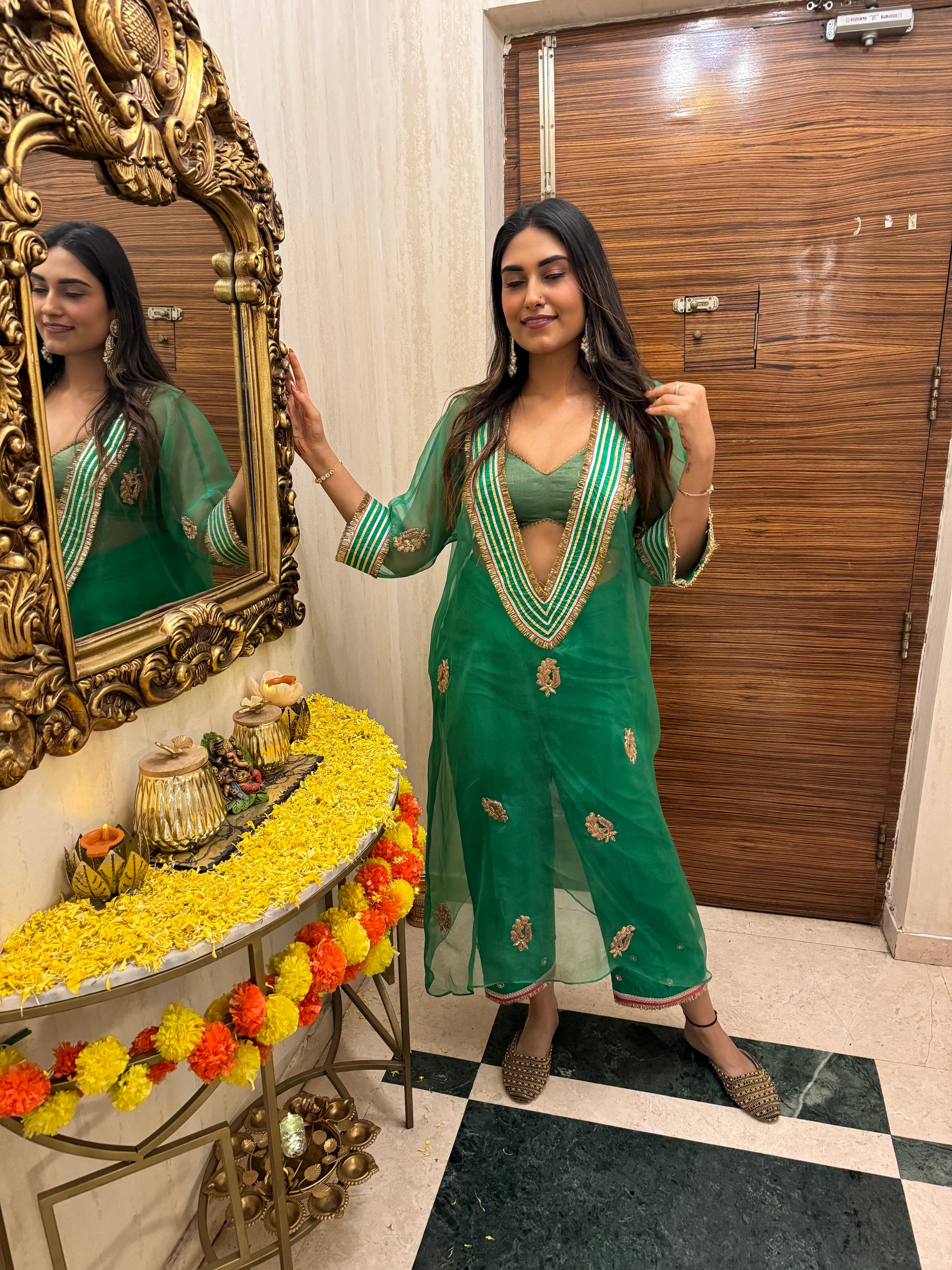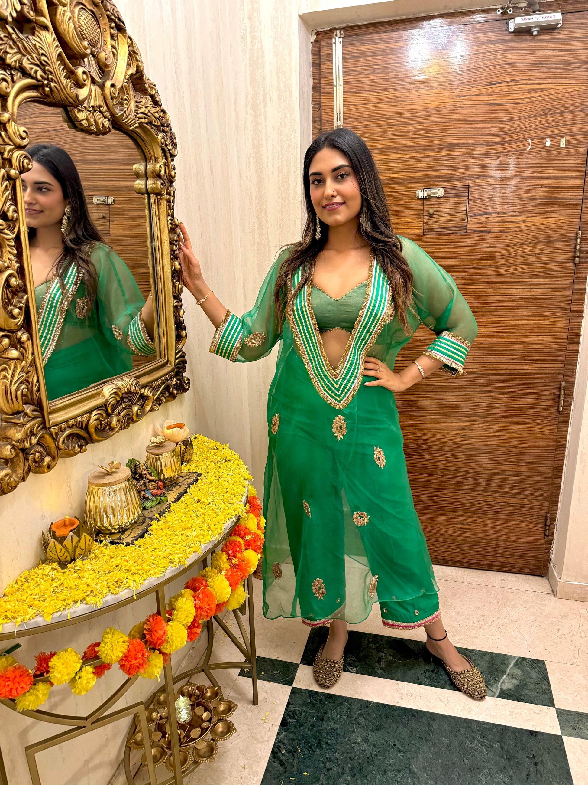 Step into refined elegance with Nazaqatt’s Elegant Pant and Kurta Set, a perfect blend of traditional charm and modern sophistication. This stylish ensemble features a deep neck kurta, designed to showcase a structured bustier inside, offering both style and comfort. Paired with tailored pants, this set creates a sleek and flattering silhouette, ideal for festive occasions, formal gatherings, or special events. With intricate detailing and premium craftsmanship, this outfit reflects Nazaqatt’s dedication to timeless fashion with a contemporary twist.