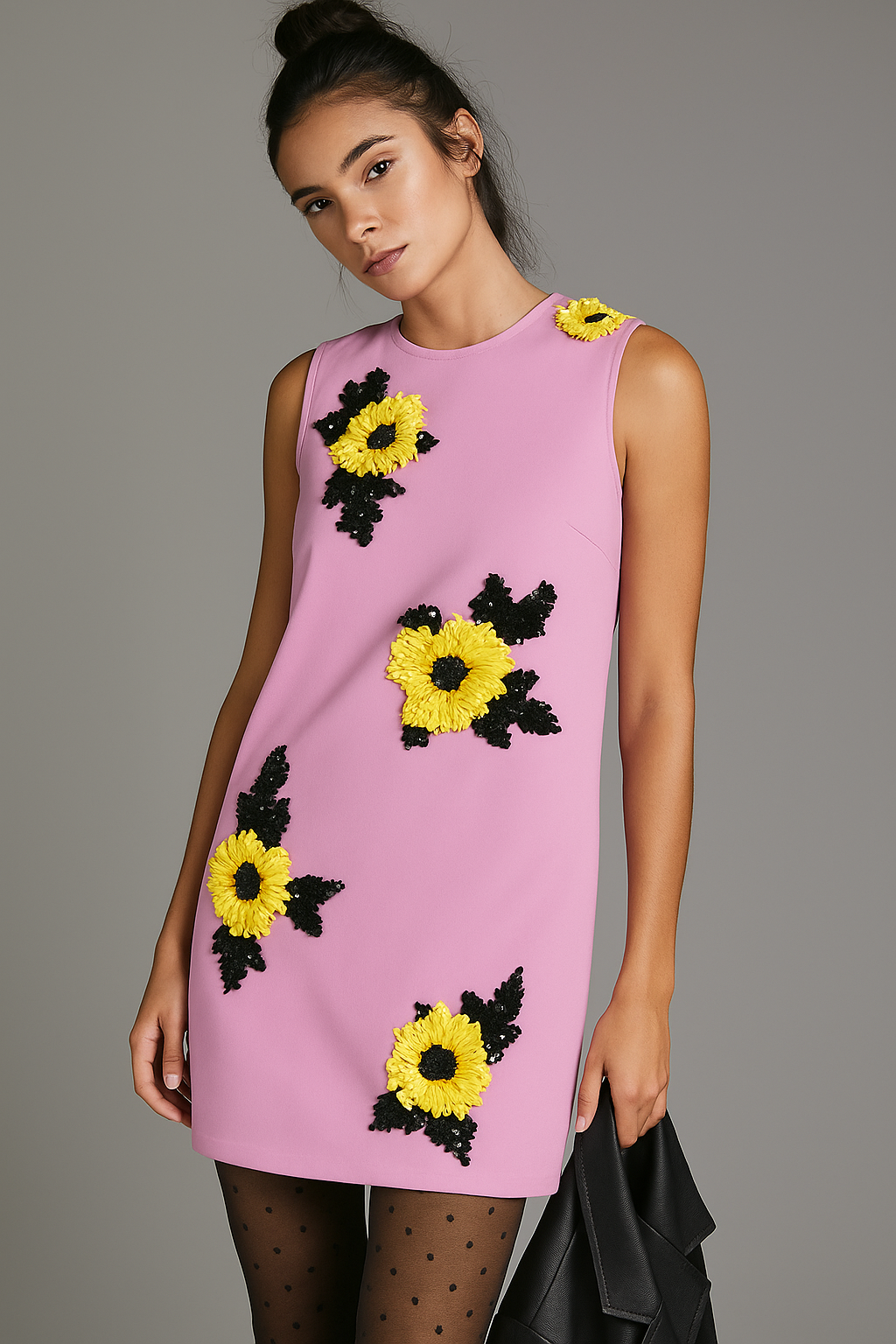 Pink Dress with Yellow and Black 3D Floral Embellishments