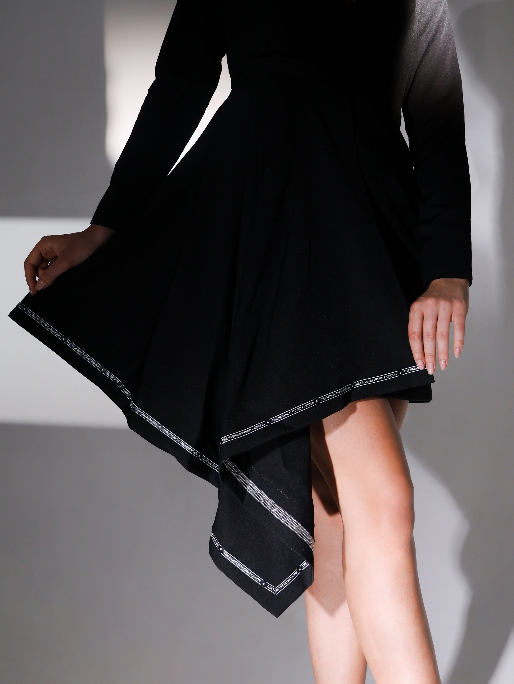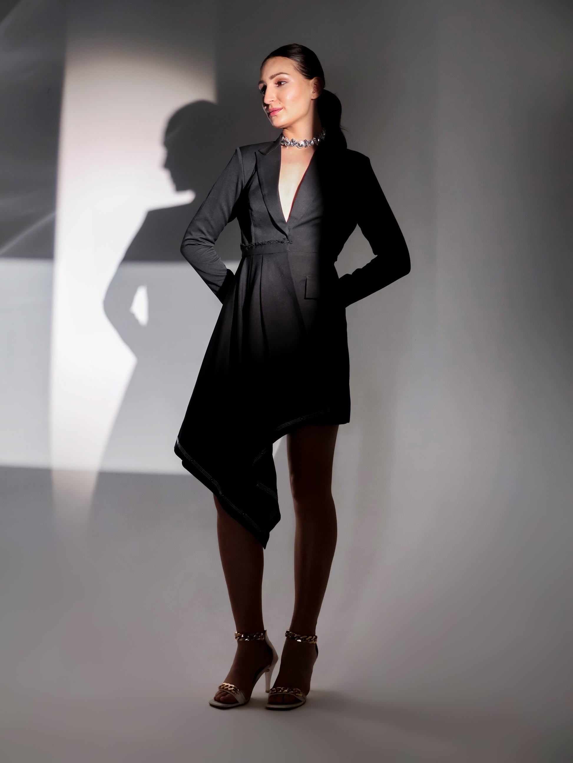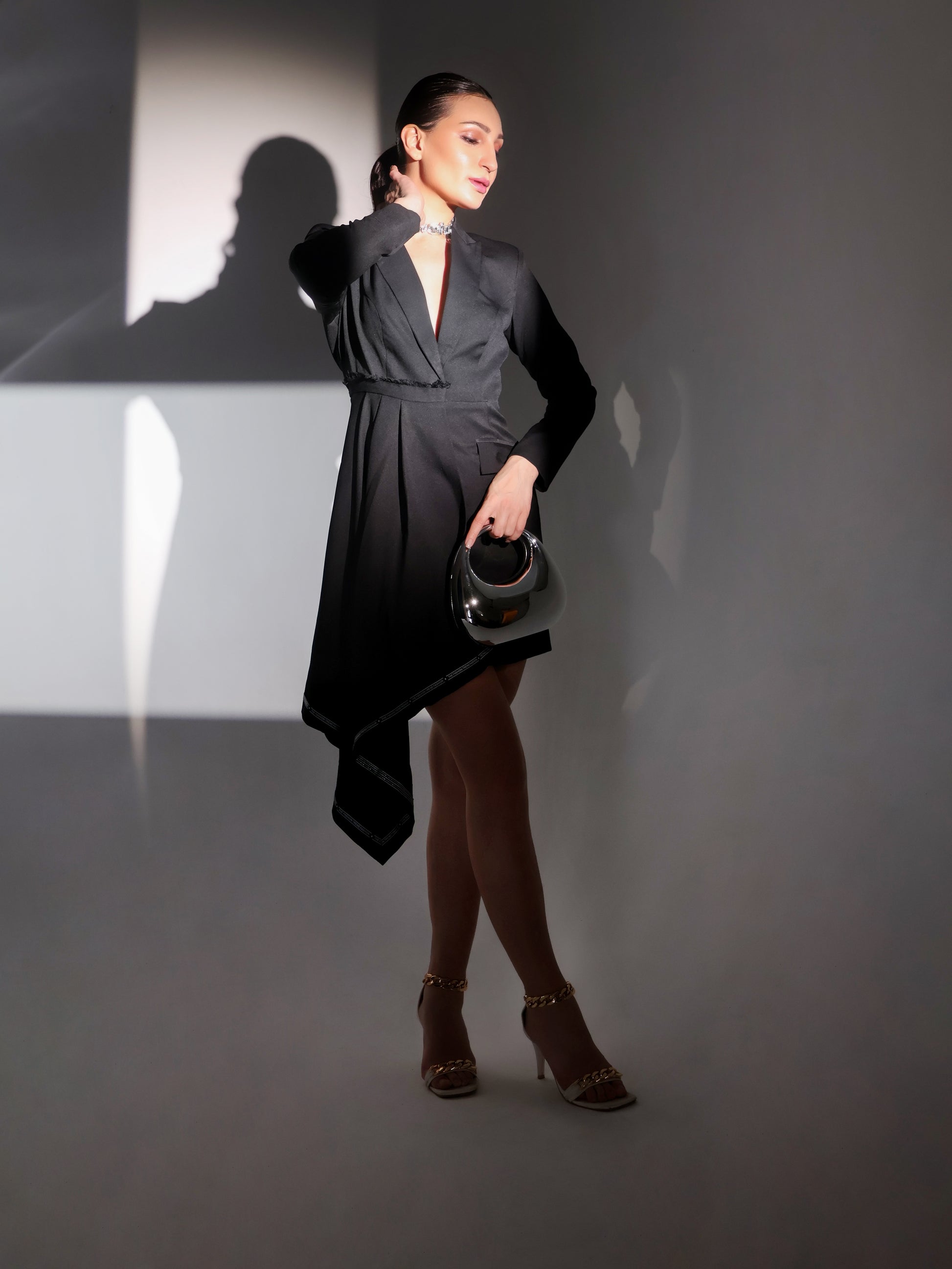 This plain black coat dress with a long drape and silver lining is the perfect blend of modern chic and classic elegance, designed to make you shine with every step.