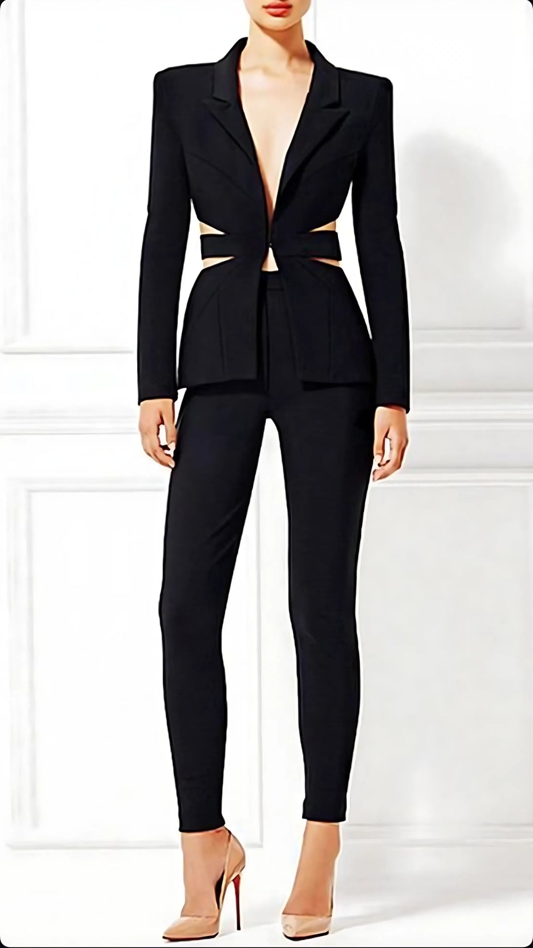 This plain black coat with cut-outs and straight pants offers a perfect balance of simplicity and bold design, making it a versatile addition to your wardrobe for both classic and contemporary looks.