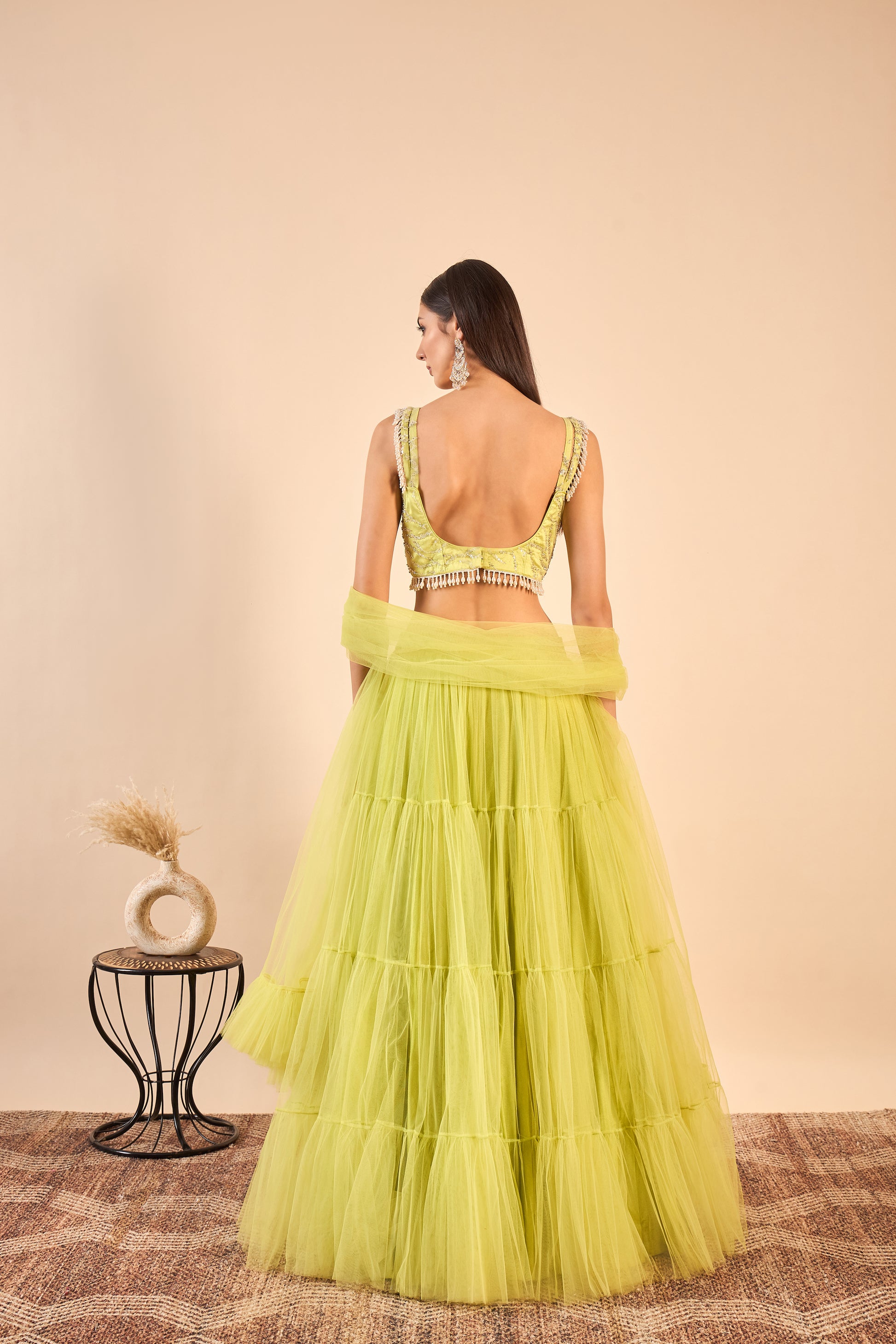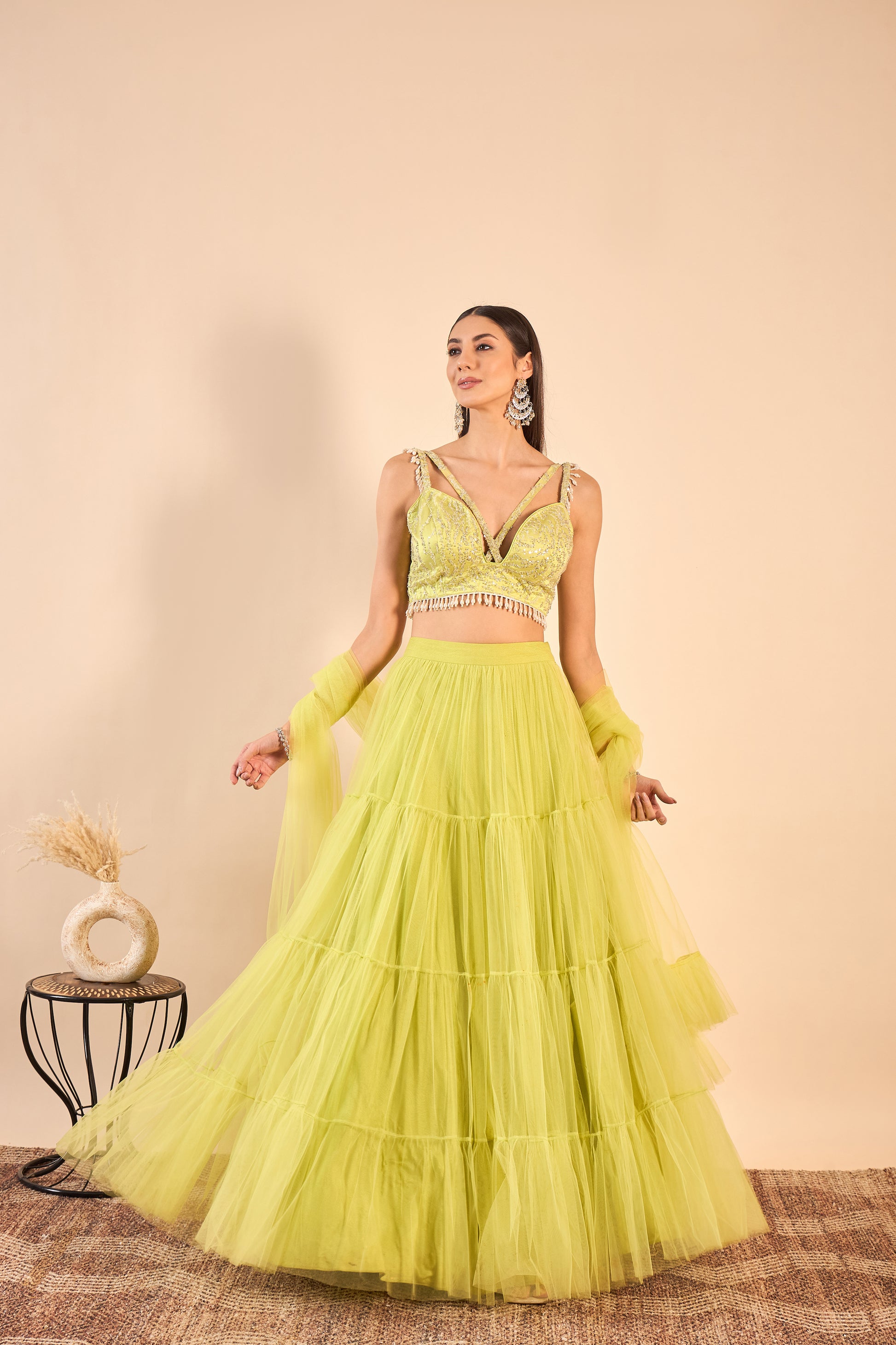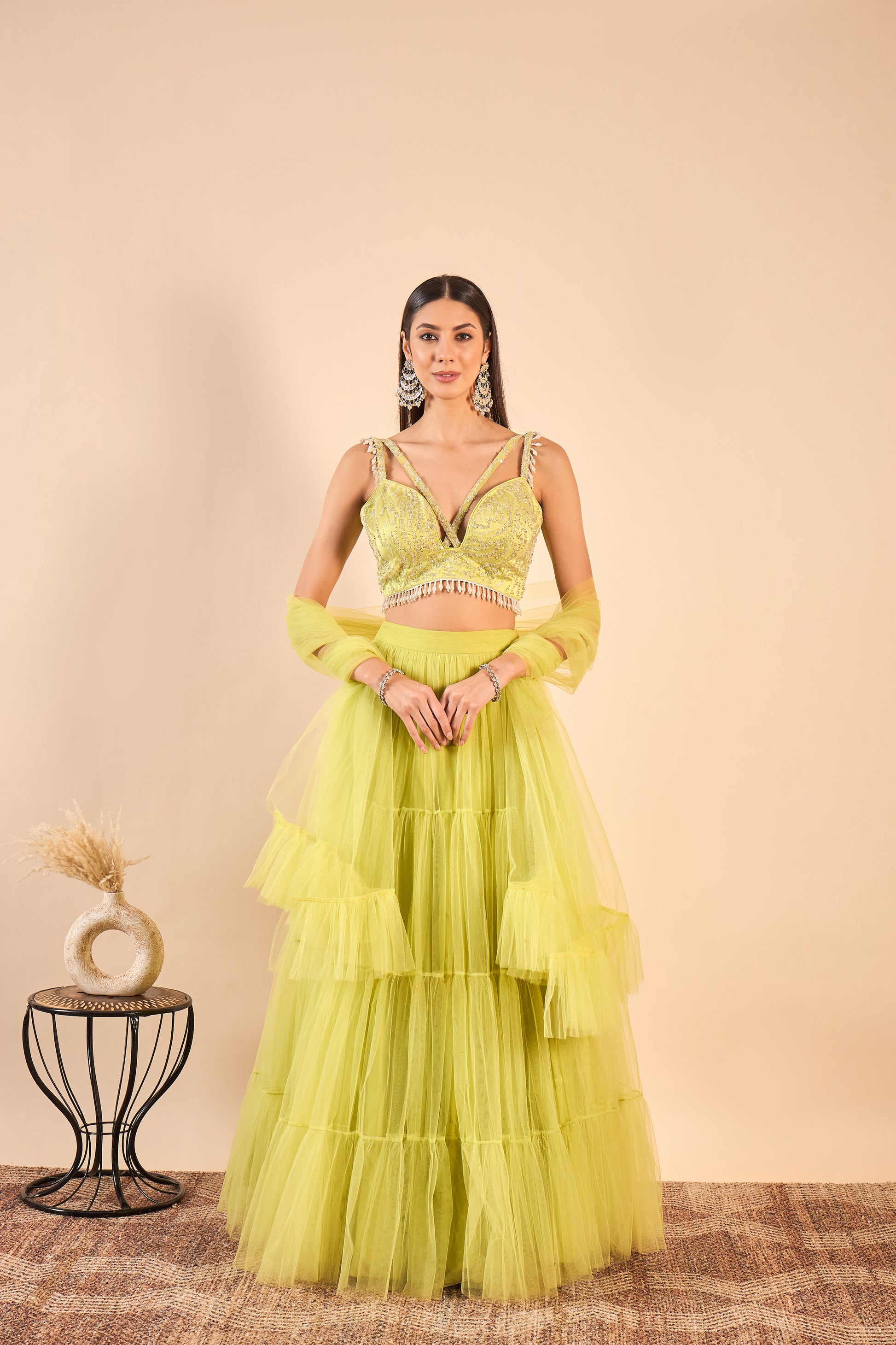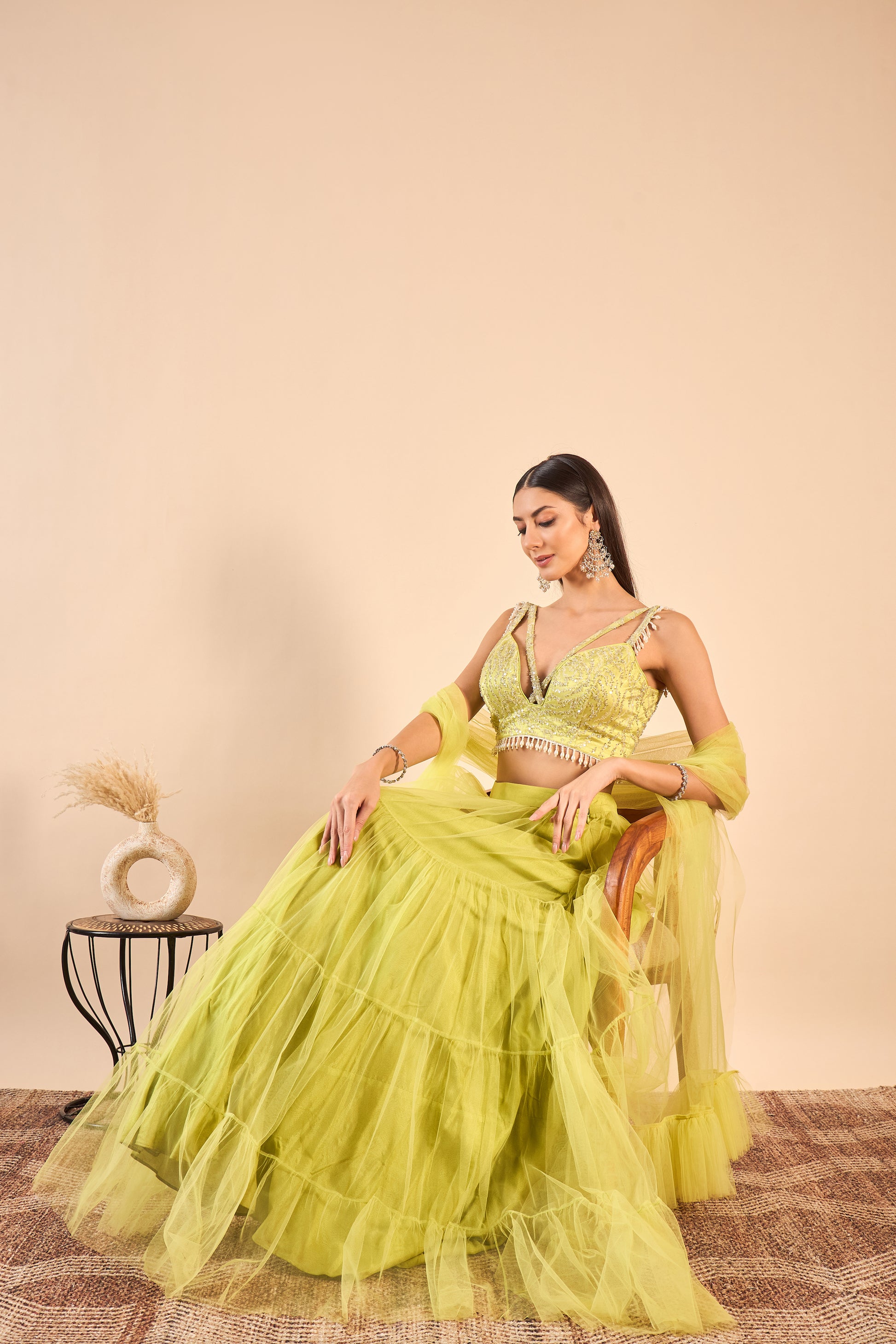 - Ruffled Net Lehenga: Creates a voluminous and graceful silhouette with layers of cascading ruffles.