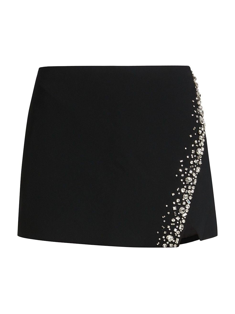 This very short black skirt with asymmetric stonework is designed for the fashion-forward individual who isn’t afraid to stand out and shine.
