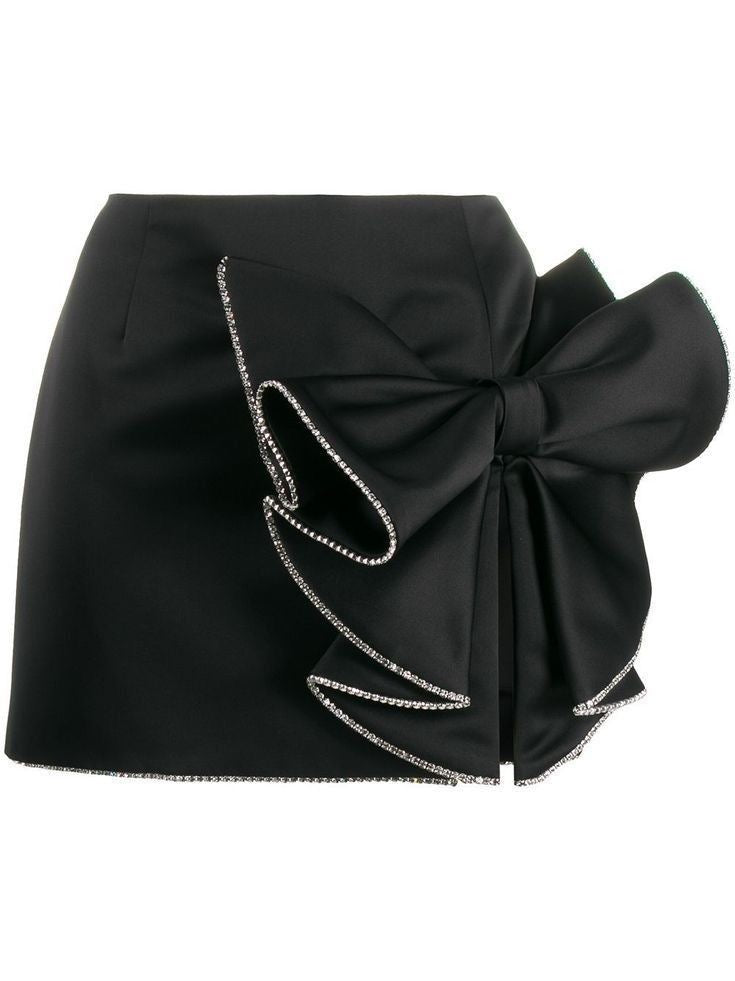 This short black skirt with a statement bow and intricate stone detailing is the ultimate combination of elegance and fun, making it a must-have for your wardrobe.